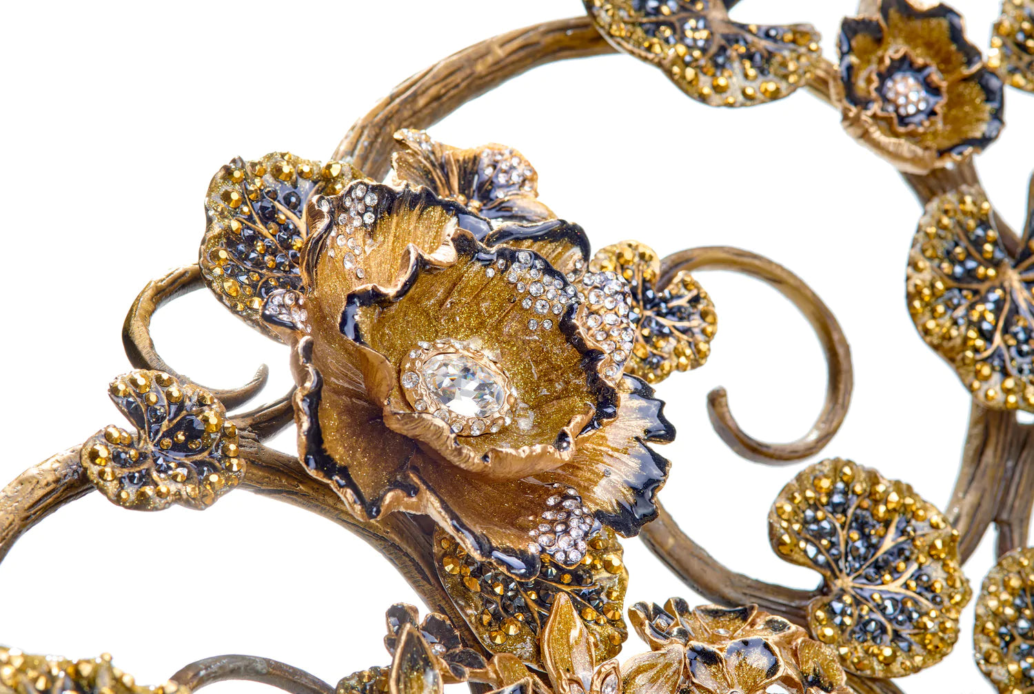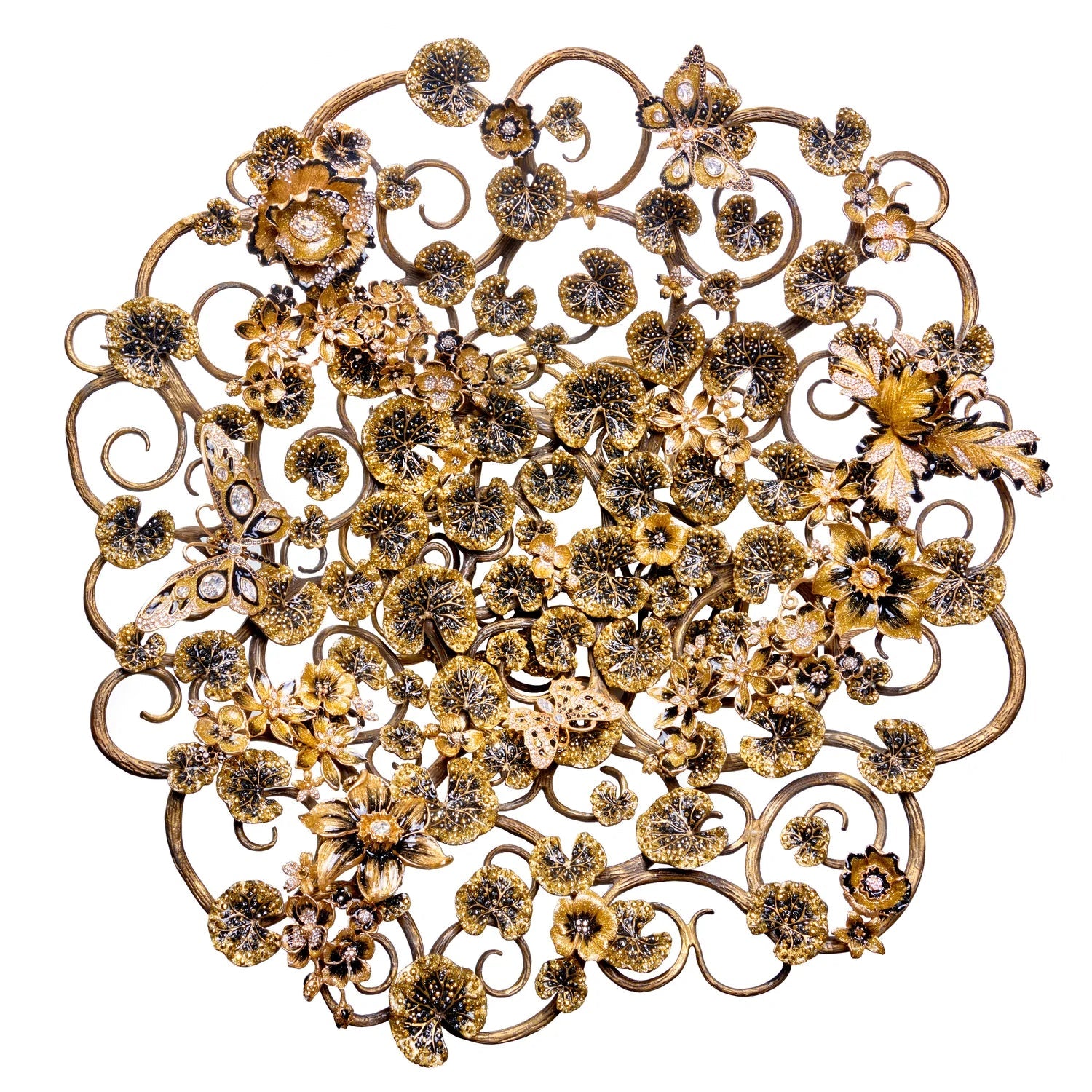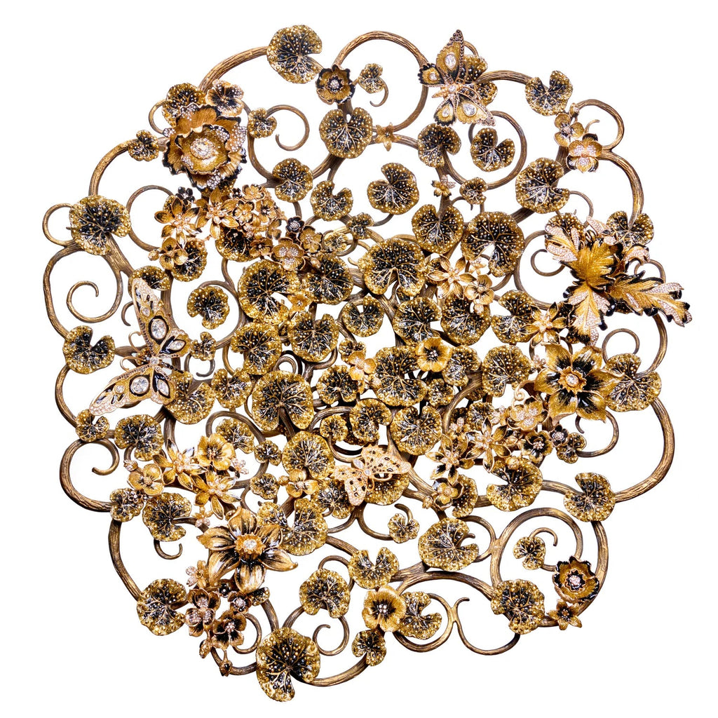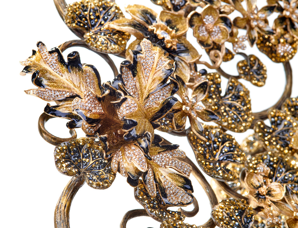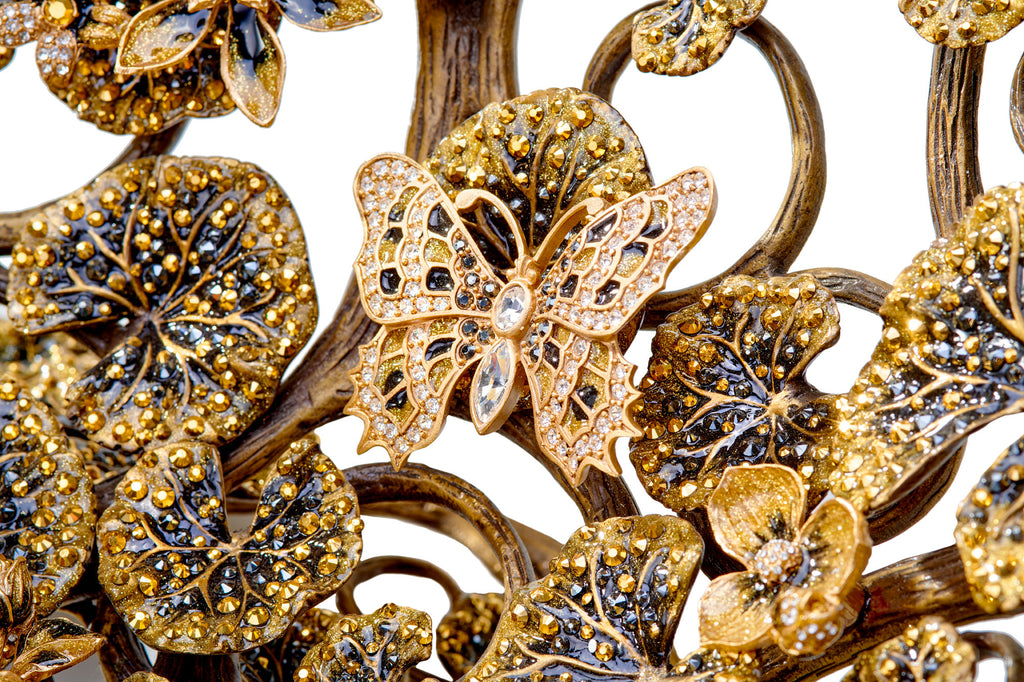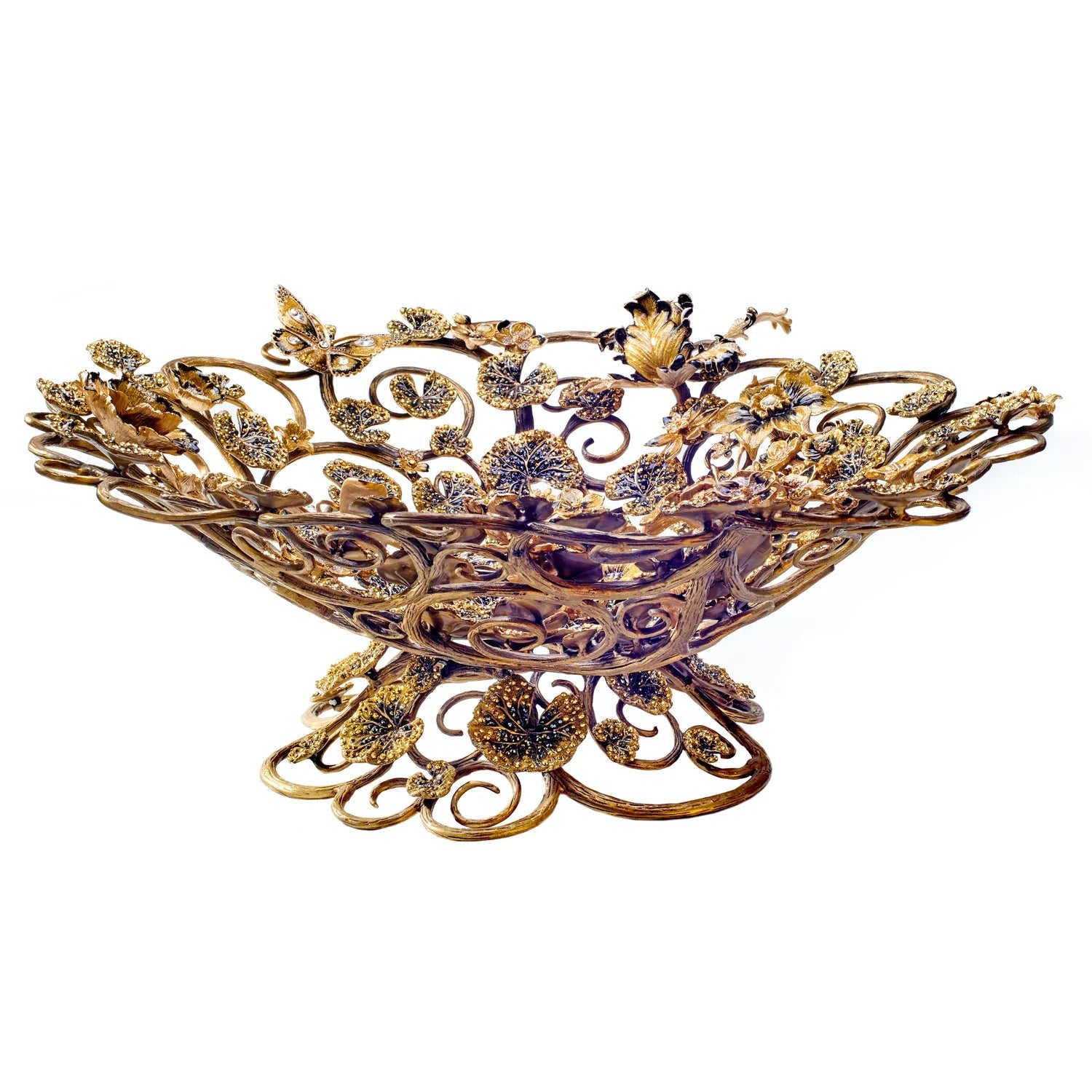 A marriage of absolute luxury, valuable function, and whimsical design, this decorative bowl features nearly nine thousand individual Swarovski crystals sparkling amongst winding tendrils of 14K gold filigree. This hand-crafted work of art can't help but become the eye-catching centerpiece of any room.