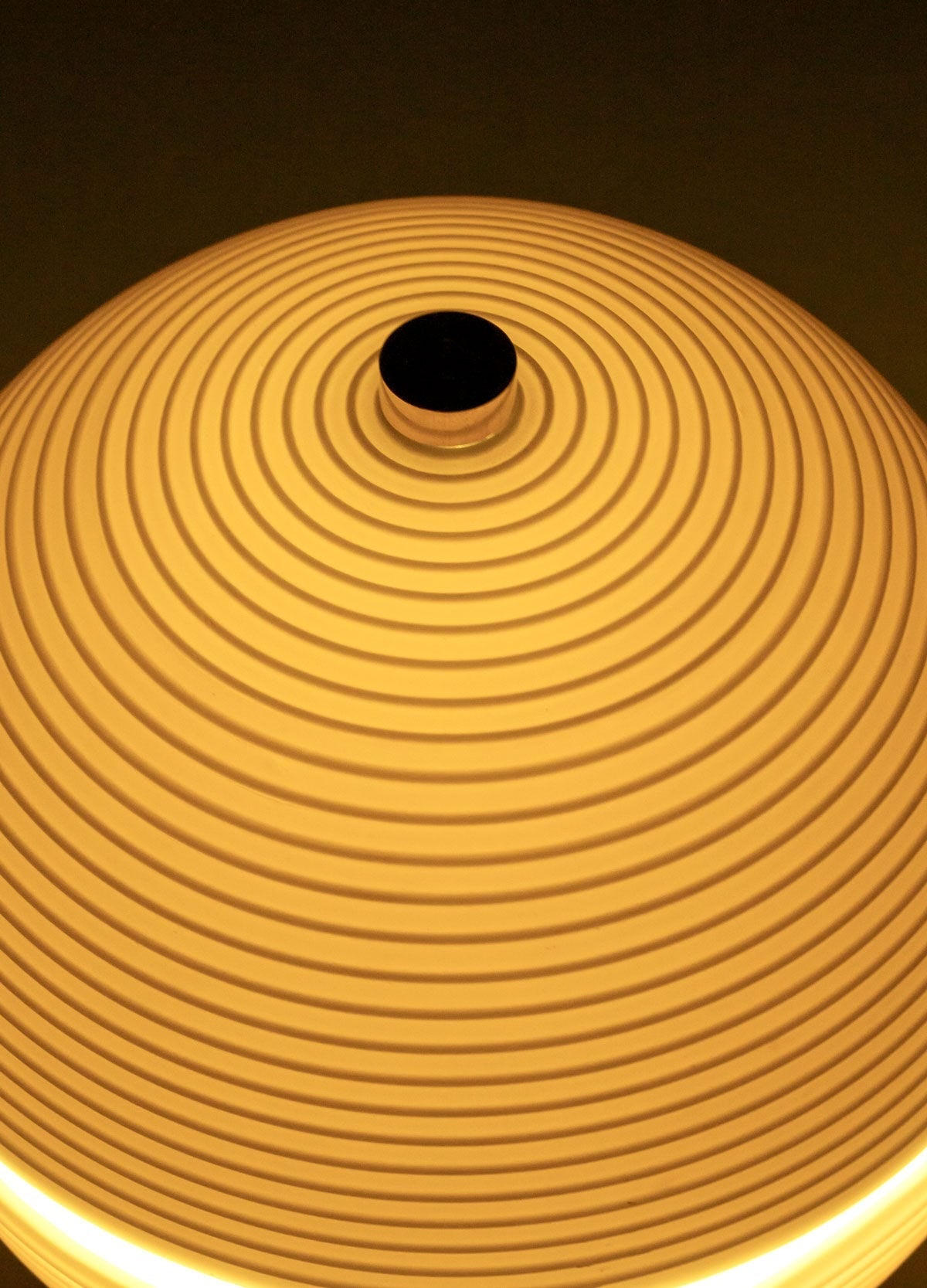 When switched off, it highlights the purity of white porcelain. When illuminated, the translucency of the material produces a warm amber tone that recalls the intimacy of candlelight.