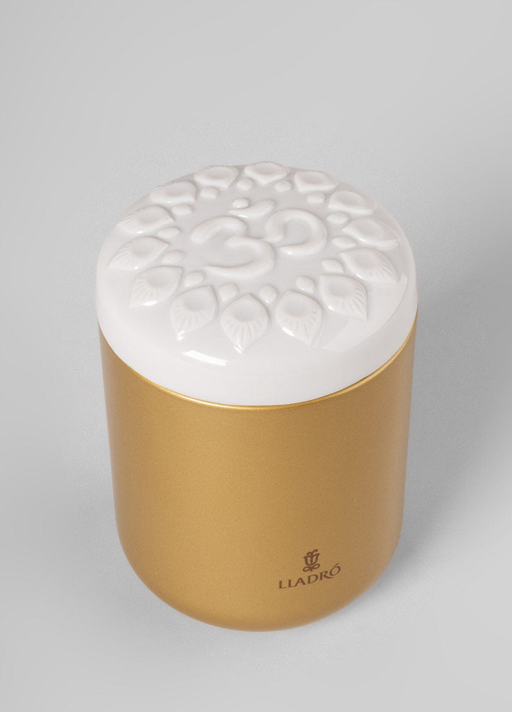 Scented candle with a porcelain lid engraved with Om, the sacred syllable of unity between body and spirit.