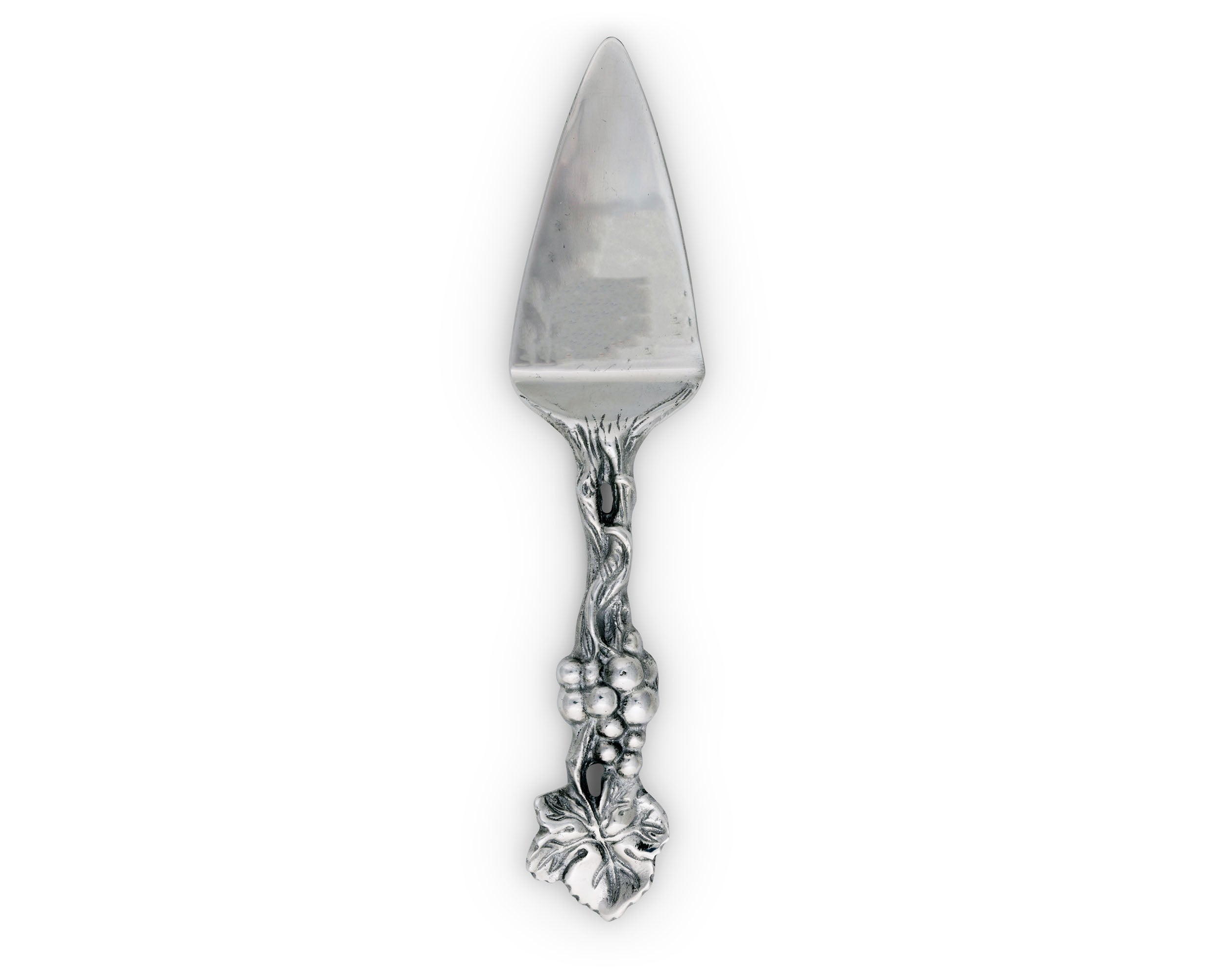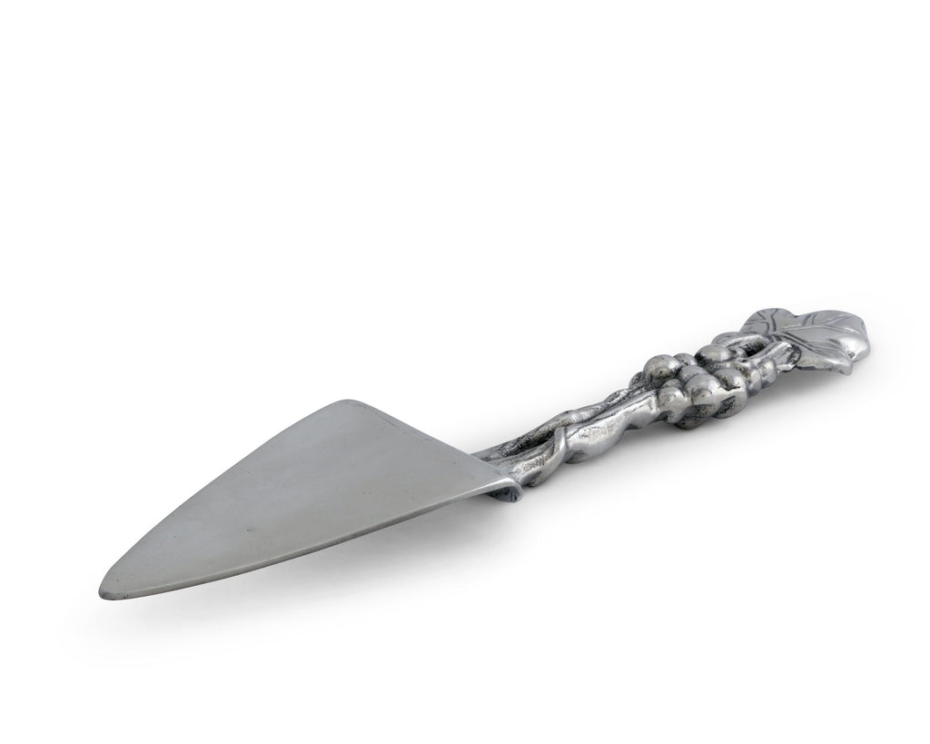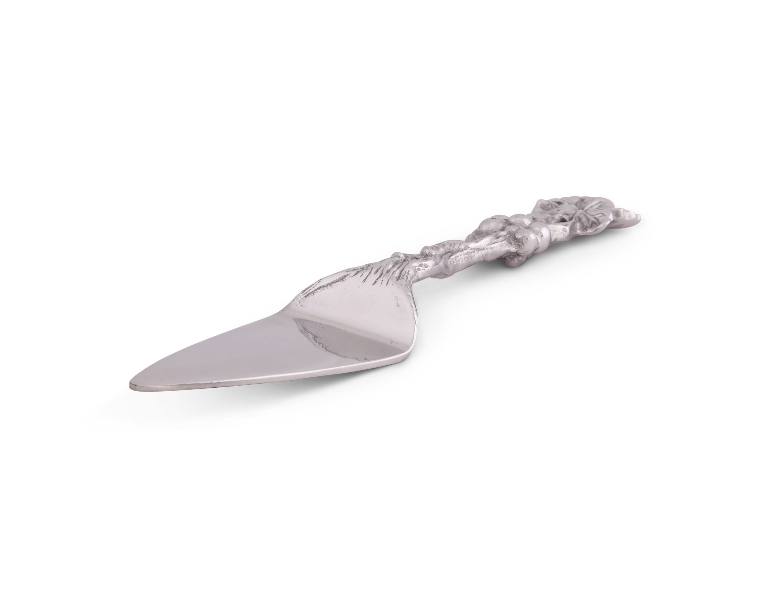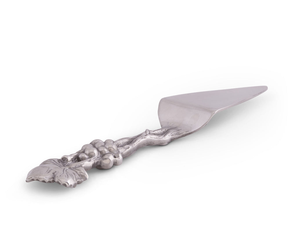 An intricately-detailed leaf sits at the end of the handle, while a bundle of grapes and vines intertwine to form the rest of the grip. The lustrous, triangular head contrasts nicely with the textured motif in this handmade, aluminum server. Distribute the dessert in elegant fashion with this Grape Pie Server.