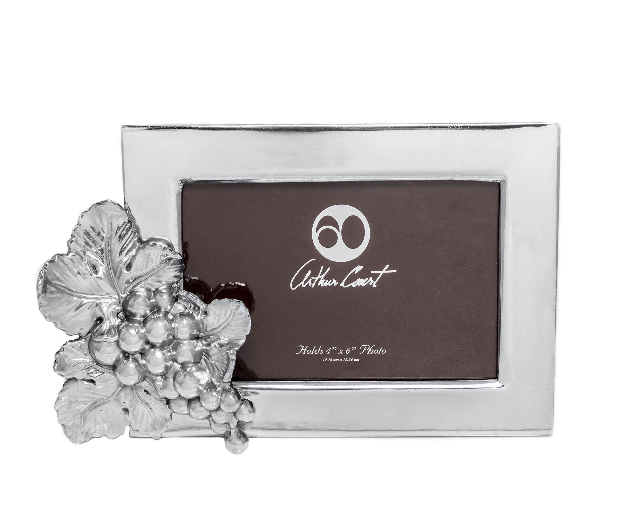 Arthur Court's Roman Grape Pattern 5” x 7”Photo Frame brings a touch of the vineyard to your home décor. Especially well-suited for displaying photos of outdoor gatherings or vacation photos, these frames are highly polished with elegant lines. A figural, realistically detailed cluster of grapes adds eye appeal in one corner.