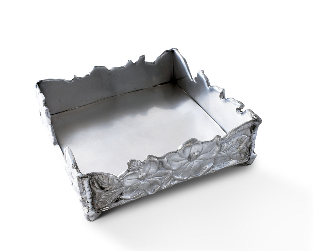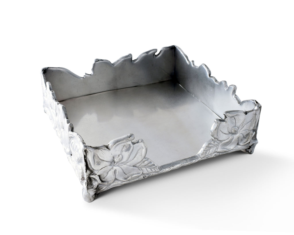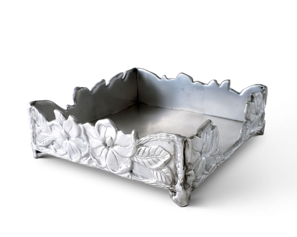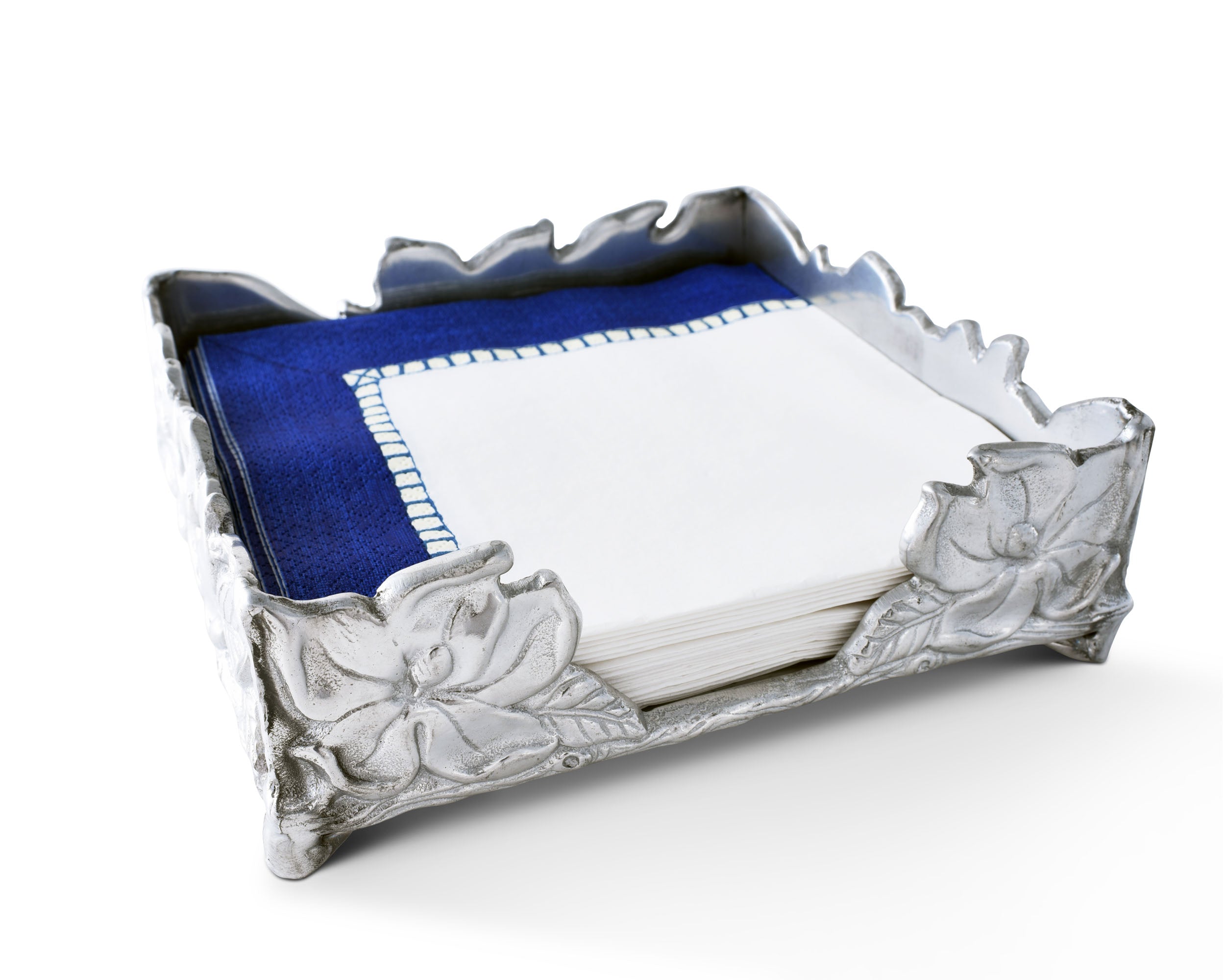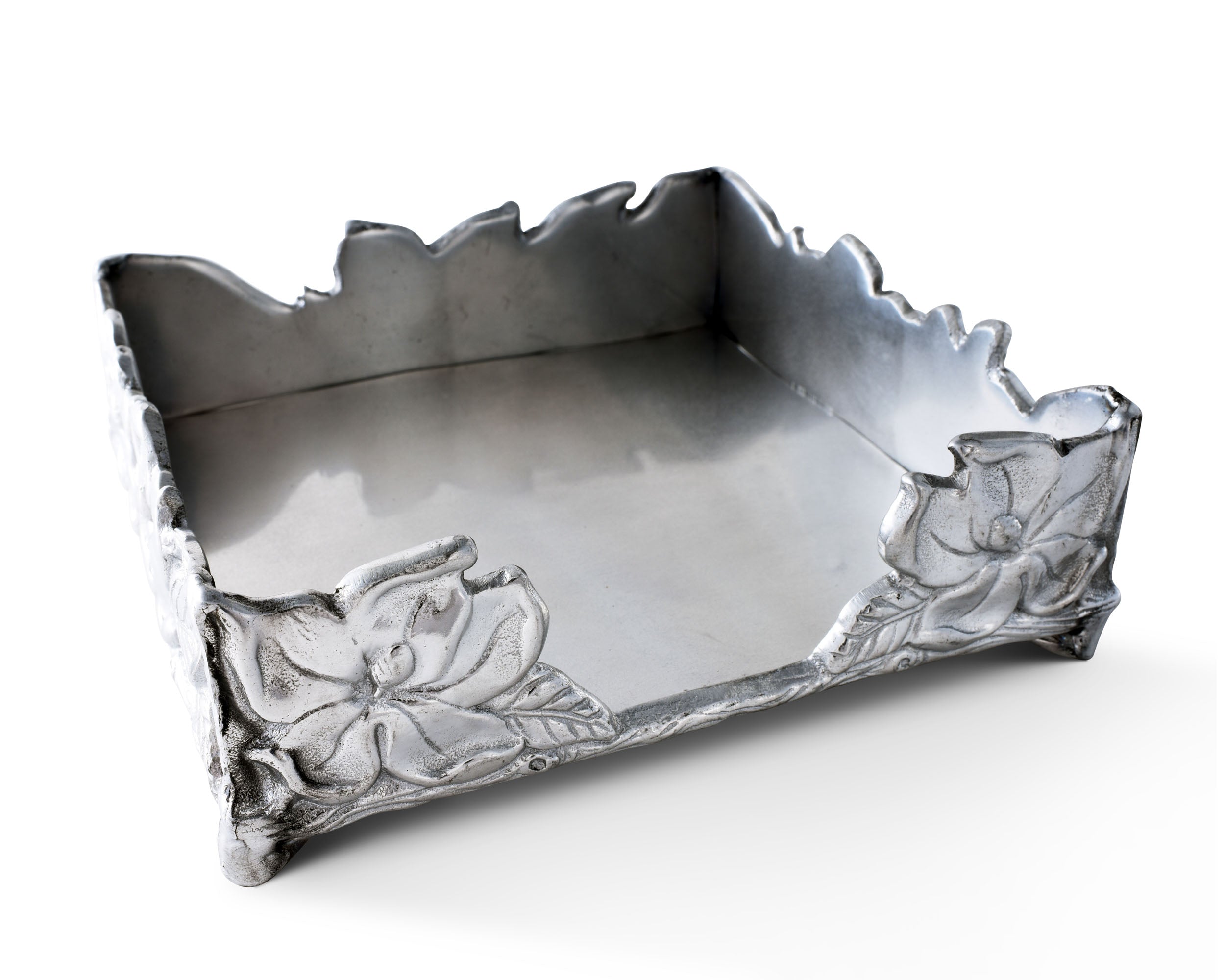 Keep napkins looking neat and lovely indoors or outside when you place them in this beautiful magnolia luncheon napkin box from Arthur Court. The intricately designed flowers that line the sides of this napkin box create an intriguing pattern along the rim, and the durable construction of this all-aluminum piece holds napkins in place even when you're eating al fresco with a breeze blowing. Set this napkin box out at a wedding shower, Sunday brunch or casual afternoon get-together to add a touch of elegance to any table. This charming napkin holder comes ready for gifting in a presentation box that's ready to wrap and give as a wedding shower gift, a housewarming gift or a hostess gift to brighten a friend's table.