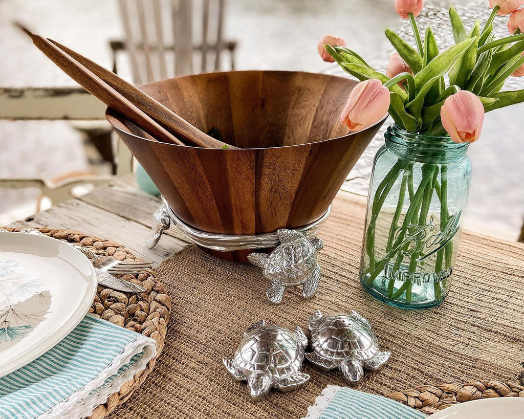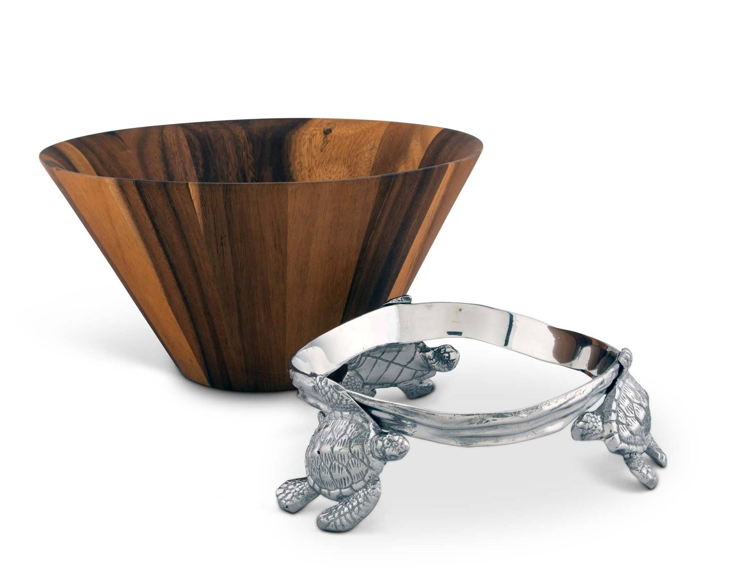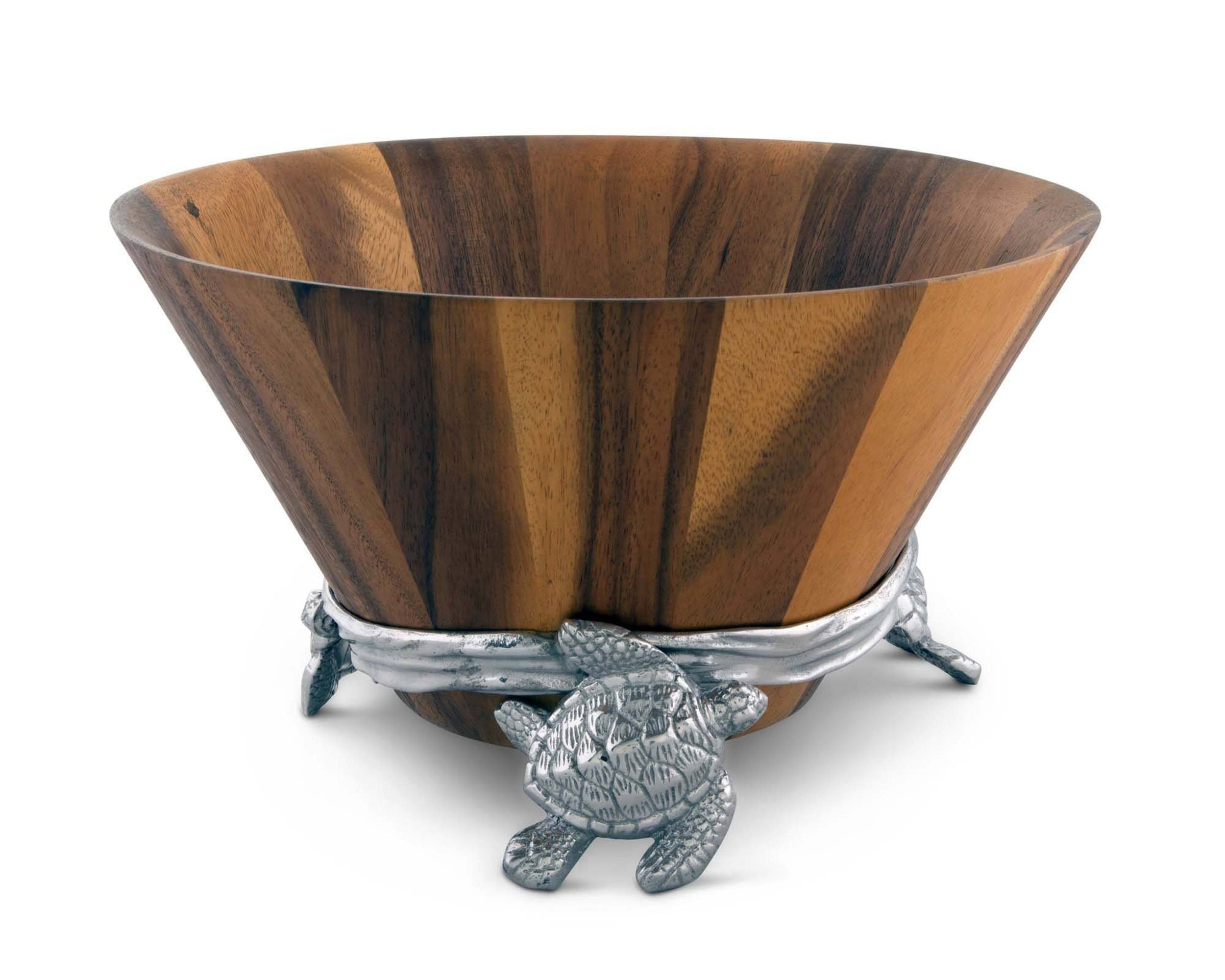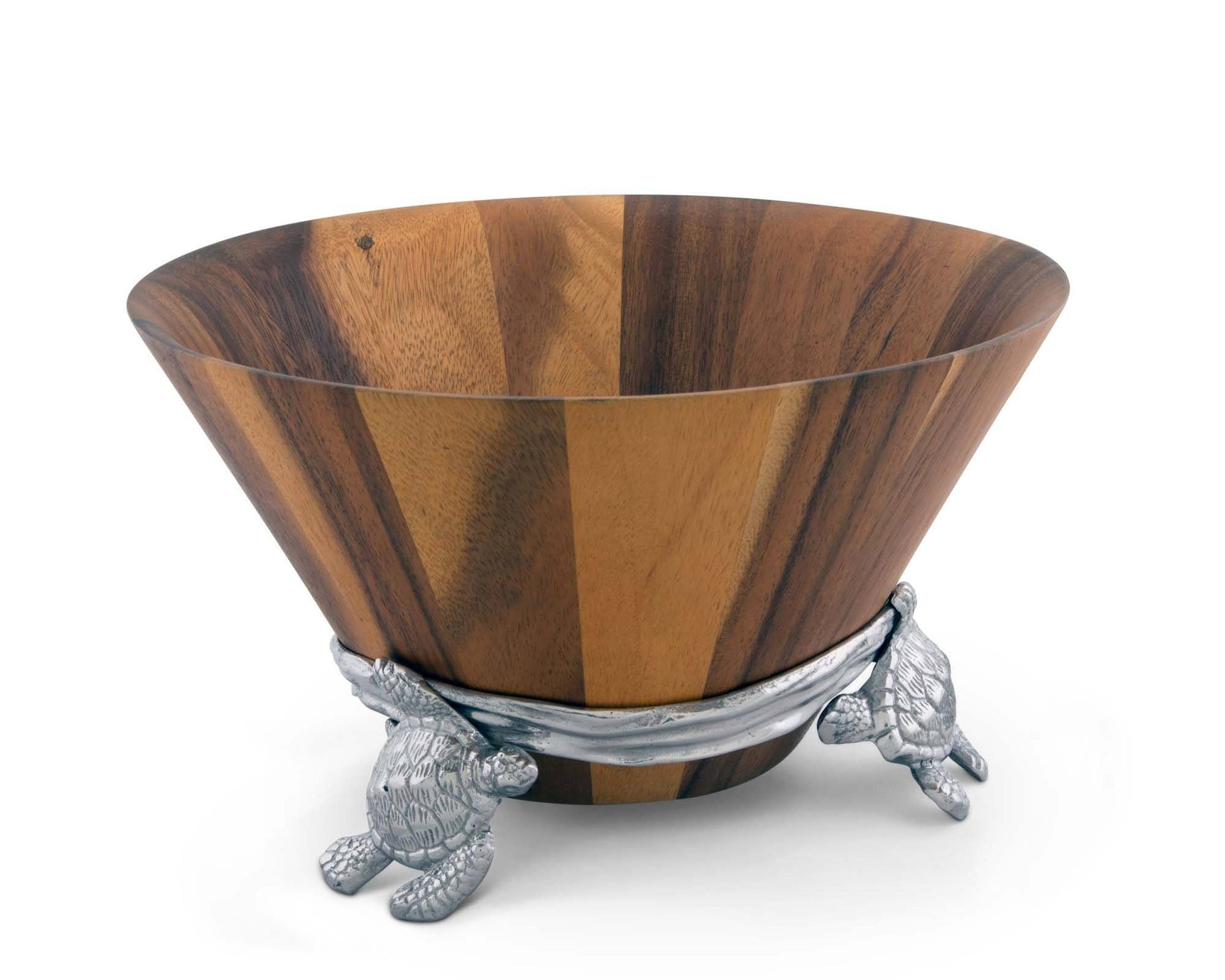 Beautiful and unique Acacia wood salad bowl with artfully handcrafted aluminum stand that will add a touch of marine feeling to any table. Majestic and beautiful, handcrafted sea turtles just seem to float around the rich toned Acacia wood bowl, creating a nautical amience. This bowl matches perfectly with Arthur Court's sea turtle salad servers.