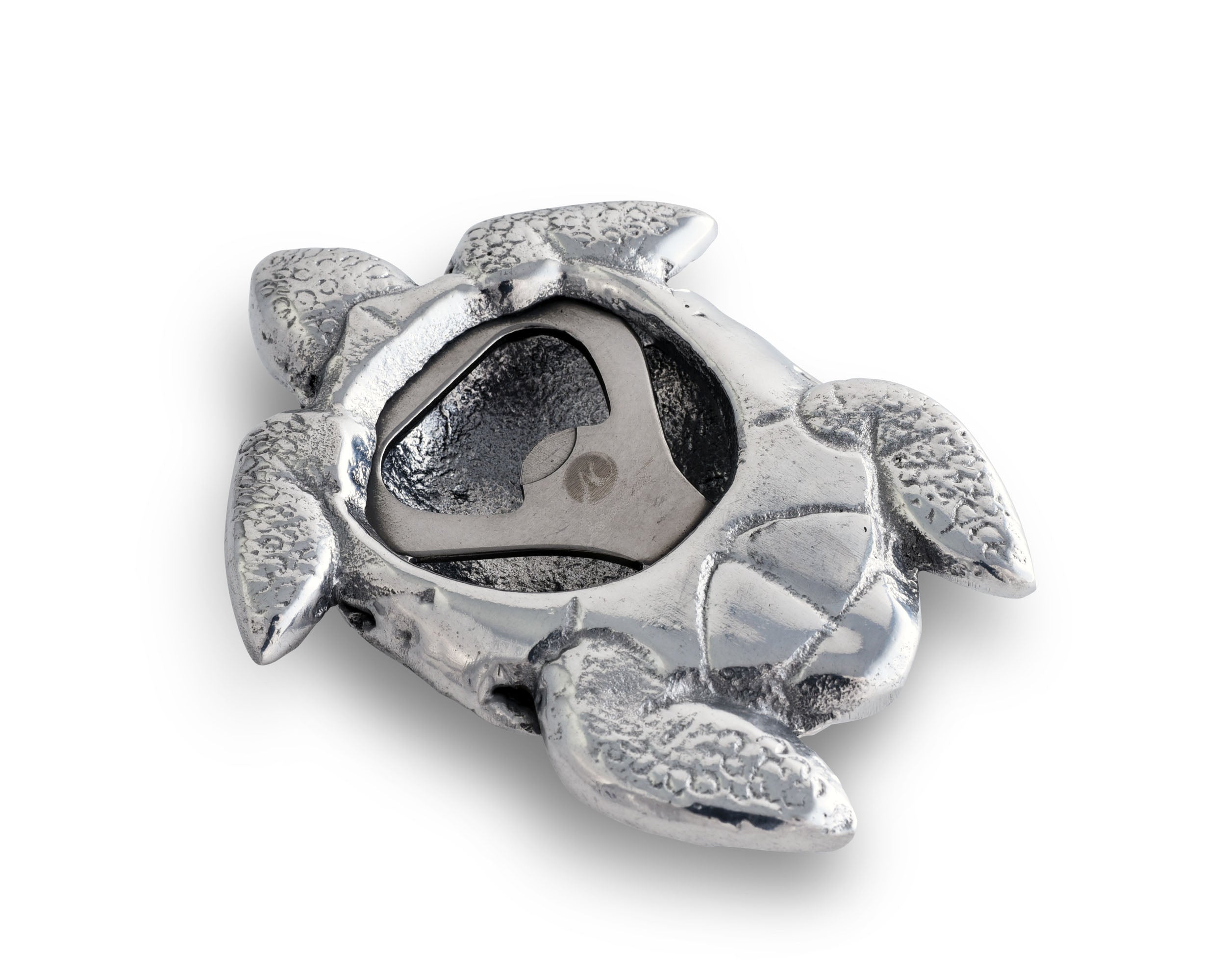 Female sea turtles only come ashore to prepare for the next generation, but you can land this adorable sea turtle bottle opener on your counter anytime. This 4 x3-inch Arthur Court bar tool harbors a surprise, a sturdy bottle opener tucked away in her tummy. When this useful sea creature isn't helping landlubbers access capped beverages quickly, it doubles as a conversation piece at your wet bar or food prep area. Handcrafted from sand-cast aluminum, this silver bottle opener adds eye-catching shine to enhance nautically themed displays, and its lifelike shell and leathery limbs enhance its appeal as a decorative piece. In the wild, sea turtles travel up to 10,000 miles a year, and this portable Arthur Court bottle opener is compact enough to take along on your own seaside excursions.