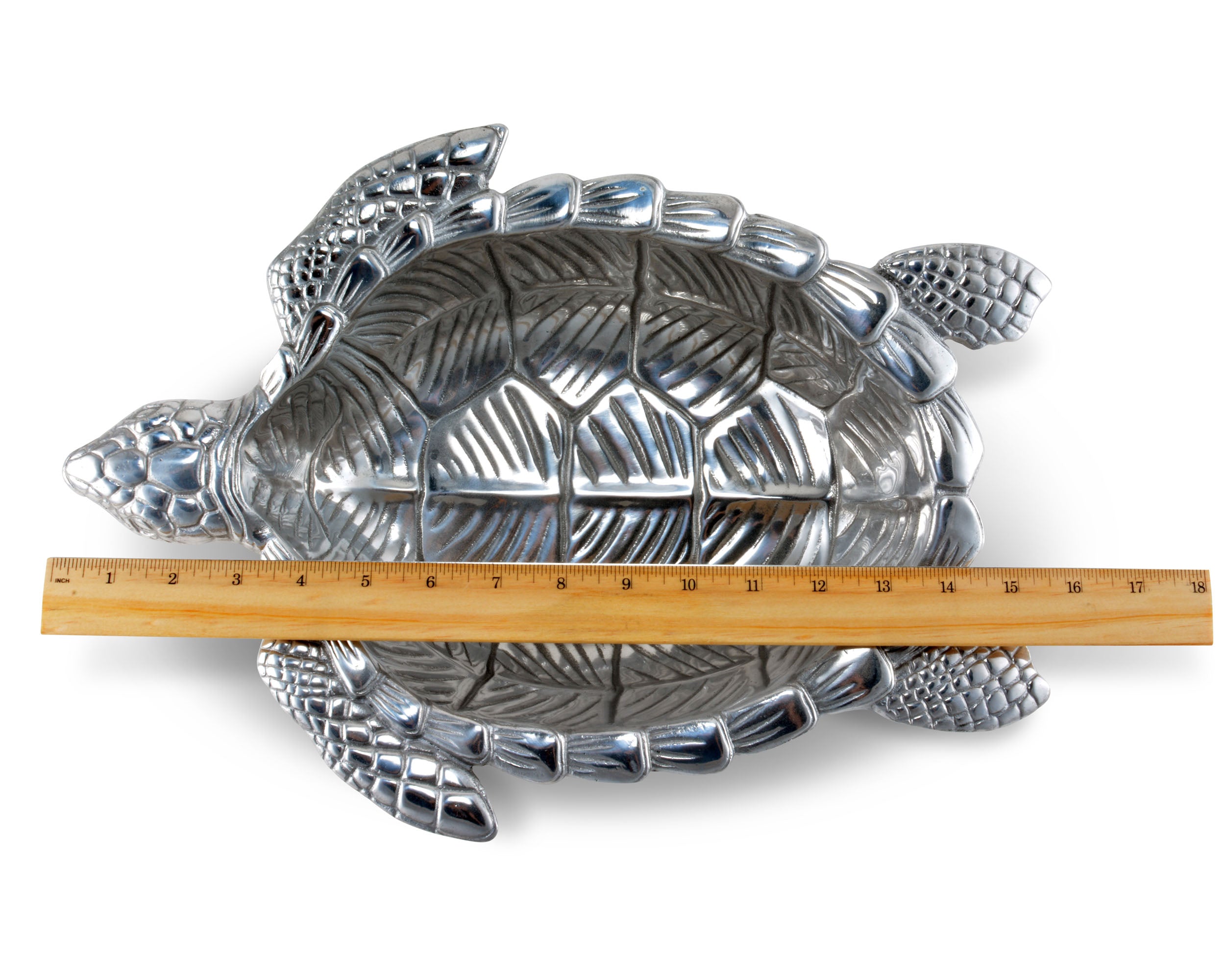 A missing shell lends its plate-patterned design to the base, which is so realistic and intricate that the turtle appears intact. The scaly texture of the creature's head and limbs only adds to the visual appeal of this handmade, aluminum dish.