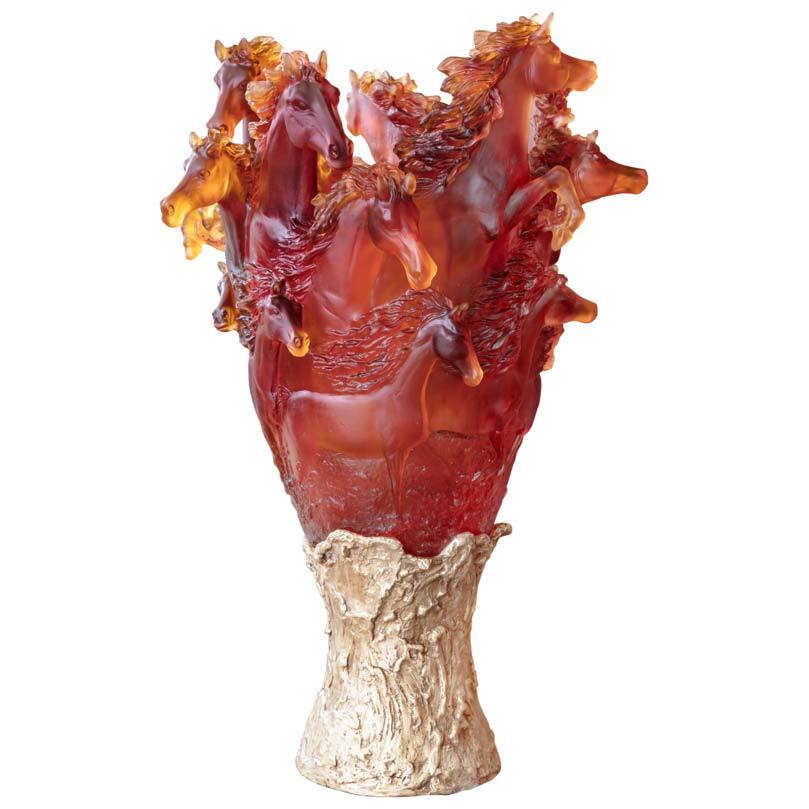 The Maison Daum reveals its exceptional savoir-faire passed down through generations with the launch of the Cavalcade Prestige Vase. This magnificent vase with its impressive height boasts one of the largest vases in the current Daum collection. Mounted on a patinated bronze base, the vase depicts a herd of horses running freely and fearlessly in the wild. The horses have been delicately sculpted to elaborate their beautifully structured head and their determined stare. The amber tones reveal the fiery and energetic spirit of the handsome creatures.