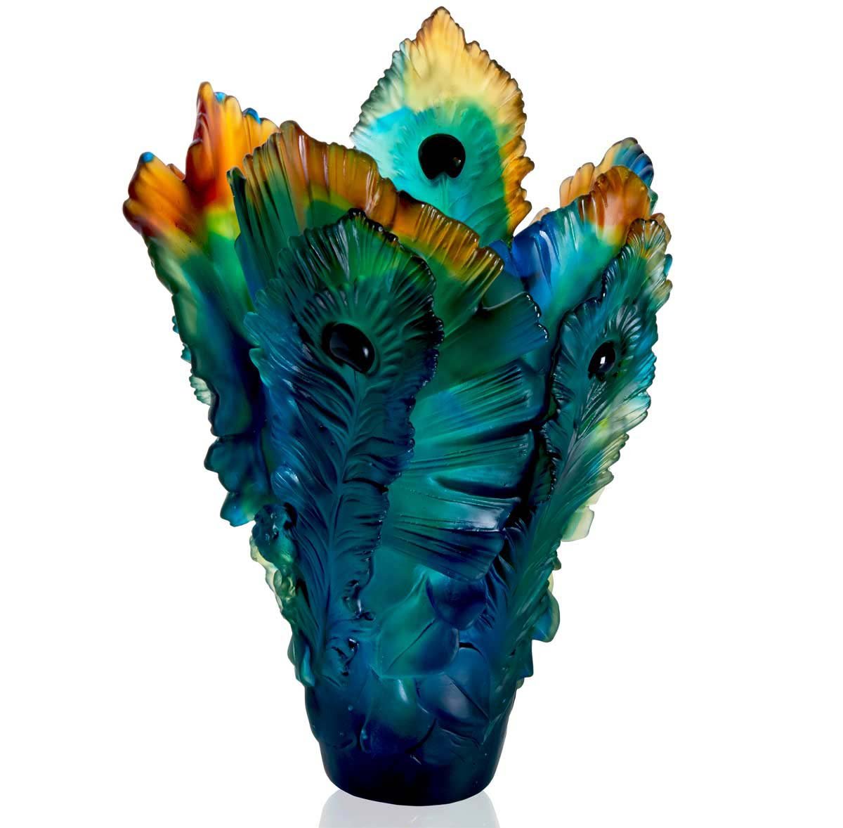 The Fleur de Paon collection is more than ever the image of the crystal manufacturer. Colorful and delicate, it draws its inspiration from the most beautiful pomp of this mythical animal. Exactly 100 years after the Plume de Paon collection launched in 1919, Daum draws from its archives and imagines a collection, a crossing between Art Nouveau and the current trends of palms and exotic leaves from the jungles of Asia. The shimmering plumage of the green peacock mingles with the green foliage to compose a wide bouquet of green with bluish tints and touches of warm amber. Each reflection, each colour will come to life in these delicately worked crystal pieces.