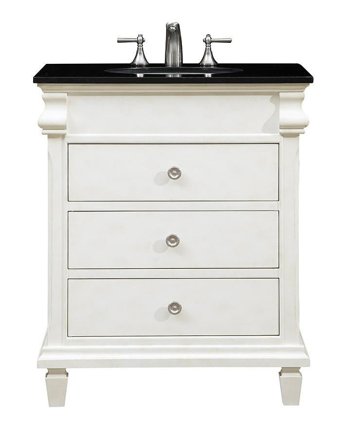 Dimensions Length: 30" Width: 21.5" Height: 35" Depth: 21.5" Counter Top Length: 30" Counter Top Width: 21.5" Counter Top Height: 0.7" Sink Width: 15.25" Sink Depth: 12" Sink Height: 7" Sink Drain Hole Size: 1.75" Faucet Hole Spacing: 8" Table Top Width: 21-1/2"" Specifications Product Type: Bathroom Vanities Wire Included: No Fixture Material: Solid Wood and MDF Base Material: Solid wood and MDF Faucet Included: NO Faucet Type: widespread Drain Assembly Included: NO Assembly Required: No Distressed Finish: yes Hardware Finish: Silver Counter Top Finish: black Counter Top Edge Style: Flat & Straight Sink Mounting Type: Undermount Vanity Mounting Type: Free-Standing Vanity Backsplash: No Number of Sinks: 1 Number of Faucet Holes: 3 Wood Type: Birch and Rubberwood Weight: 131.12 Product Warranty: 1 year limited Shipment type: LTL Drawers Drawers Included: Yes Number of Drawers: 3 False Drawers: No Drawer Width: 22 Drawer Depth: 14 Drawer Height: 5.5 Drawer Handle Designs: knobs Shelves Number of Shelves: 0 Cabinets Number of Cabinets: 1