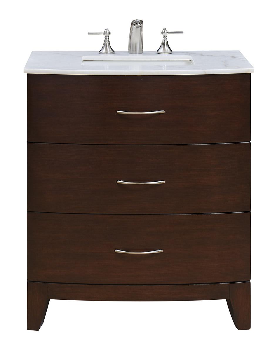 Dimensions Length: 30" Width: 21.5" Height: 35" Depth: 21.5" Counter Top Length: 30" Counter Top Width: 21.5" Counter Top Height: 0.7" Sink Width: 15" Sink Depth: 10.5" Sink Height: 7" Sink Drain Hole Size: 1.75" Faucet Hole Spacing: 8" Table Top Width: 21-1/2"" Specifications Product Type: Bathroom Vanities Wire Included: No Fixture Material: MDF Base Material: Solid wood and MDF Faucet Included: NO Faucet Type: widespread Drain Assembly Included: NO Assembly Required: No Distressed Finish: no Hardware Finish: Silver Counter Top Finish: white and brown vein Counter Top Edge Style: Flat & Straight Sink Mounting Type: Undermount Vanity Mounting Type: Free-Standing Vanity Backsplash: No Number of Sinks: 1 Number of Faucet Holes: 3 Wood Type: Birch and Rubberwood Weight: 116.6 Product Warranty: 1 year limited Shipment type: LTL Drawers Drawers Included: Yes Number of Drawers: 2 False Drawers: No Drawer Width: 30 Drawer Depth: 14 Drawer Height: 9.3 Drawer Handle Designs: bar Shelves Number of Shelves: 0 Cabinets Number of Cabinets: 1