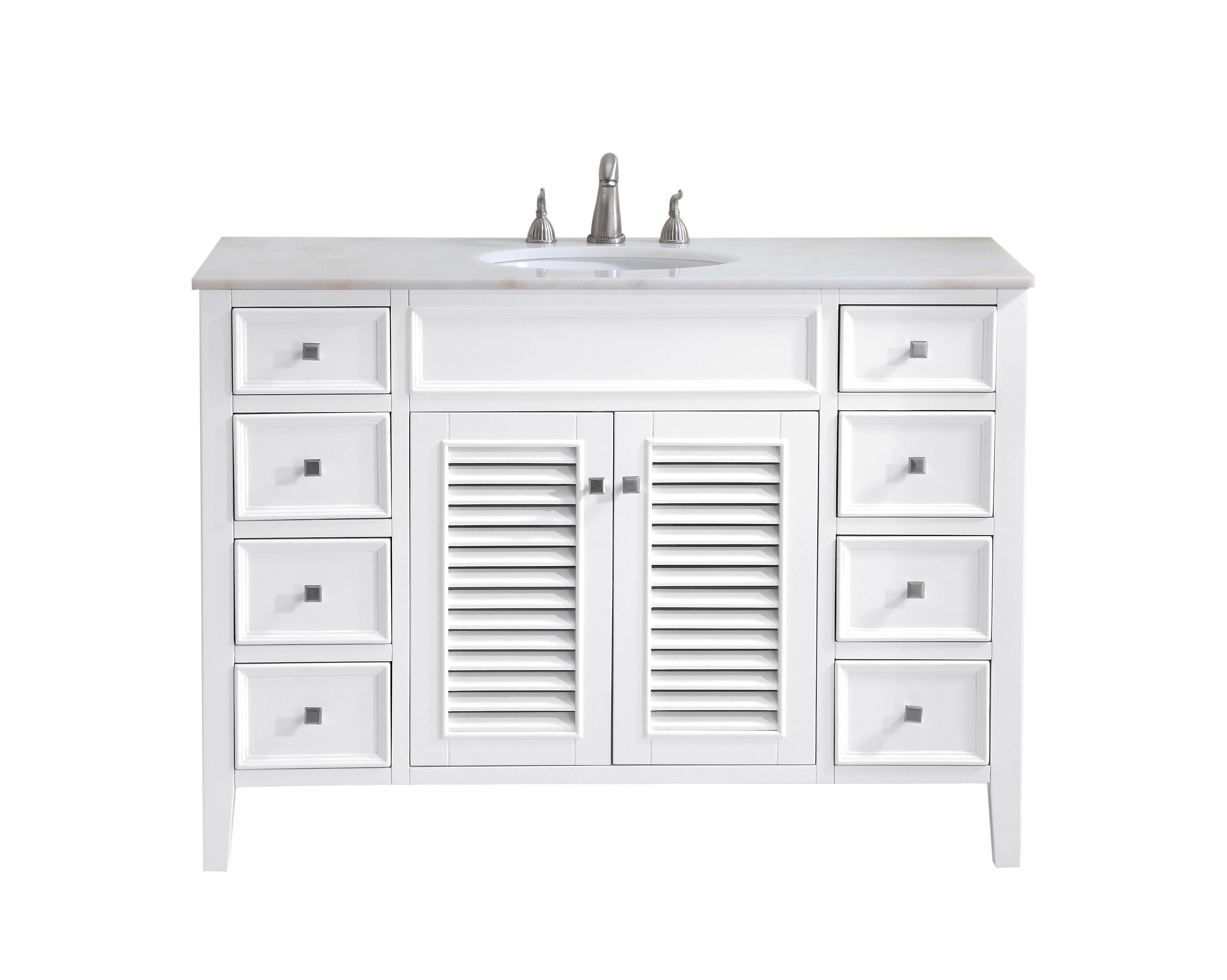 Dimensions Length: 48" Width: 21" Height: 35" Depth: 21" Counter Top Length: 48" Counter Top Width: 21" Counter Top Height: 0.7" Sink Width: 15.25" Sink Depth: 12" Sink Height: 7" Sink Drain Hole Size: 1.75" Faucet Hole Spacing: 8" Table Top Width: 21"" Specifications Product Type: Bathroom Vanities Wire Included: No Fixture Material: Solid Wood and MDF Base Material: Solid wood and MDF Faucet Included: NO Faucet Type: widespread Drain Assembly Included: NO Assembly Required: No Distressed Finish: no Hardware Finish: Silver Counter Top Finish: white and brown vein Counter Top Edge Style: Flat & Straight Sink Mounting Type: Undermount Vanity Mounting Type: Free-Standing Vanity Backsplash: No Number of Sinks: 1 Number of Faucet Holes: 3 Wood Type: Birch and Rubberwood Weight: 193.16 Product Warranty: 1 year limited Shipment type: LTL Drawers Drawers Included: Yes Number of Drawers: 8 False Drawers: No Drawer Width: 9.6/9.6 Drawer Depth: 14 Drawer Height: 4.5/5.9 Drawer Handle Designs: knobs Shelves Number of Shelves: 1 Shelf Width: 23-3/4" Cabinets Number of Cabinets: 1 Cabinet Interior Width: 23-3/4 Cabinet Interior Depth: 19-3/8" Cabinet Interior Height: 20-3/4"