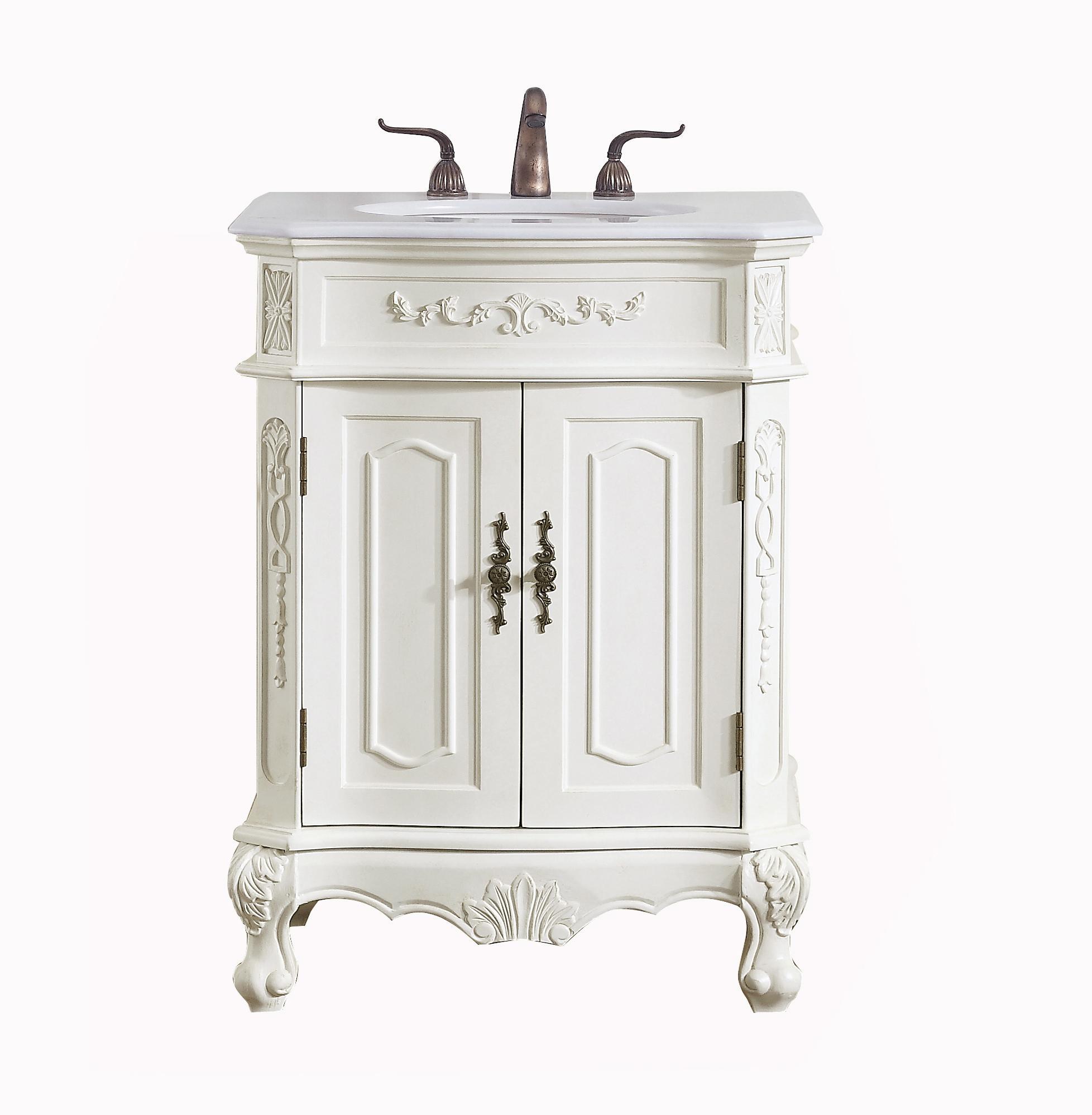 Dimensions Length: 27" Width: 21" Height: 36" Counter Top Length: 27" Counter Top Width: 21" Counter Top Height: 0.7" Sink Width: 15.25" Sink Depth: 12" Sink Height: 7" Sink Drain Hole Size: 1.75" Faucet Hole Spacing: 8" Specifications Product Type: Bathroom Vanities Wire Included: No Base Material: Solid wood and MDF Faucet Included: No Faucet Type: widespread Drain Assembly Included: No Assembly Required: No Distressed Finish: yes Hardware Finish: Antique metal Counter Top Finish: white and brown vein Counter Top Edge Style: ogee Sink Mounting Type: Undermount Vanity Mounting Type: Free-Standing Vanity Backsplash: No Number of Sinks: 1 Number of Faucet Holes: 3 Wood Type: Birch and Rubberwood Weight: 102.96 Product Warranty: 1 year limited Shipment type: LTL Drawers Drawers Included: NO Number of Drawers: 0 False Drawers: NO Drawer Handle Designs: knobs Shelves Number of Shelves: 1 Shelf Width: 20" Cabinets Number of Cabinets: 1 Cabinet Interior Width: 20" Cabinet Interior Depth: 17-5/8" Cabinet Interior Height: 21"