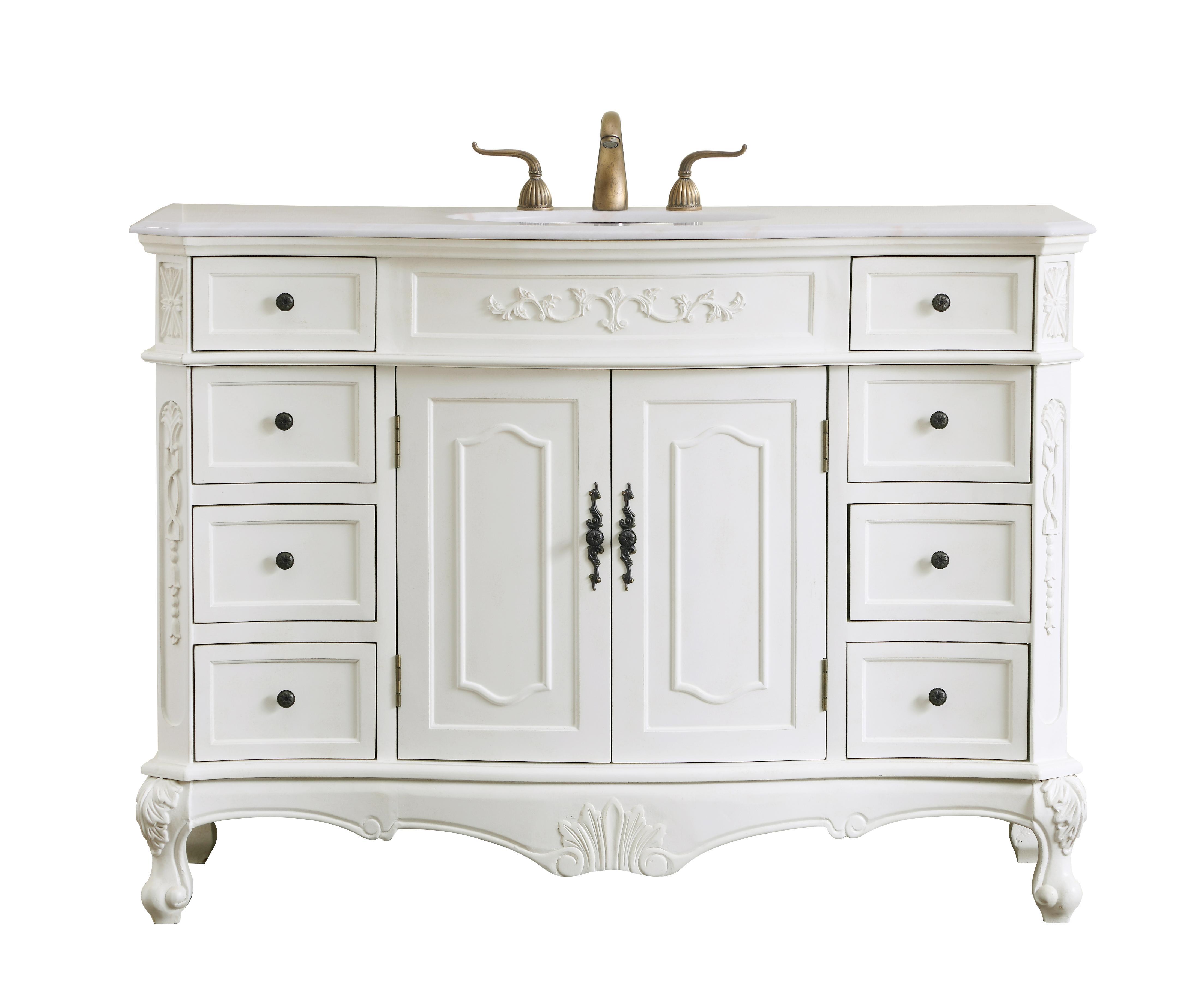 Dimensions Length: 48" Width: 21" Height: 36" Counter Top Length: 48" Counter Top Width: 21" Counter Top Height: 0.7" Sink Width: 15.25" Sink Depth: 12" Sink Height: 7" Sink Drain Hole Size: 1.75" Faucet Hole Spacing: 8" Specifications Product Type: Bathroom Vanities Wire Included: No Base Material: Solid wood and MDF Faucet Included: No Faucet Type: widespread Drain Assembly Included: No Assembly Required: No Distressed Finish: yes Hardware Finish: Antique metal Counter Top Finish: white and brown vein Counter Top Edge Style: ogee Sink Mounting Type: Undermount Vanity Mounting Type: Free-Standing Vanity Backsplash: No Number of Sinks: 1 Number of Faucet Holes: 3 Wood Type: Birch and Rubberwood Weight: 177.32 Product Warranty: 1 year limited Shipment type: LTL Drawers Drawers Included: yes Number of Drawers: 8 False Drawers: NO Drawer Width: DW1: 8-7/8", DW2: 8-7/8" Drawer Depth: DW1: 14", DW2: 14" Drawer Height: DW1: 4-3/8", DW2: 6" Drawer Handle Designs: knobs Shelves Number of Shelves: 1 Shelf Width: 19-1/4" Cabinets Number of Cabinets: 1 Cabinet Interior Width: 19-1/4" Cabinet Interior Depth: 15-3/4" Cabinet Interior Height: 19-1/2"