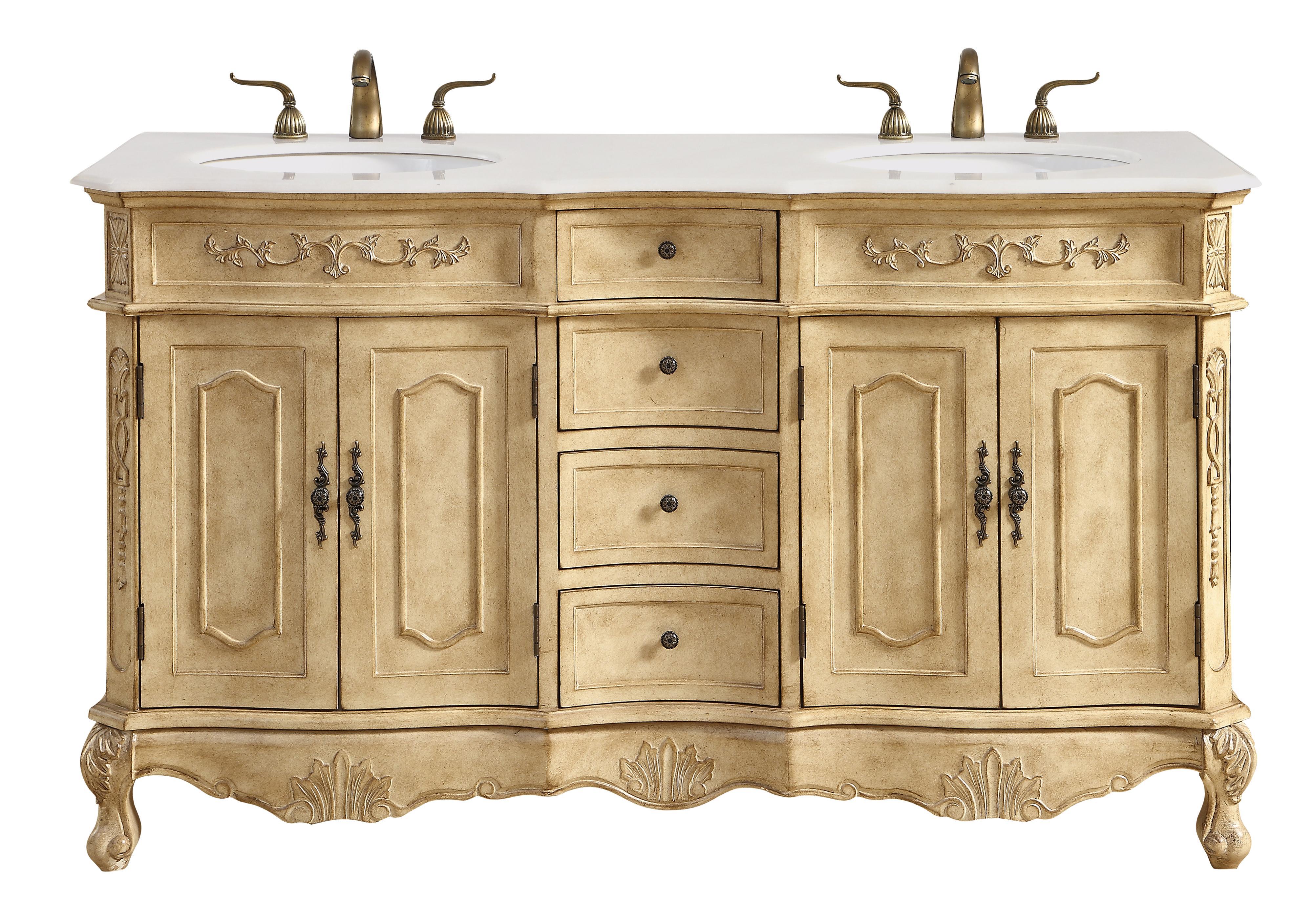Dimensions Length: 60" Width: 21" Height: 36" Depth: 21" Counter Top Length: 60" Counter Top Width: 21" Counter Top Height: 0.7" Sink Width: 15.25" Sink Depth: 12" Sink Height: 7" Sink Drain Hole Size: 1.75" Faucet Hole Spacing: 8" Table Top Width: 21"" Specifications Product Type: Bathroom Vanities Wire Included: No Fixture Material: Solid Wood and MDF Base Material: Solid wood and MDF Faucet Included: No Faucet Type: widespread Drain Assembly Included: No Assembly Required: No Distressed Finish: yes Hardware Finish: Antique Bronze Counter Top Finish: white and brown vein Counter Top Edge Style: Flat & Straight Sink Mounting Type: Undermount Vanity Mounting Type: Free-Standing Vanity Backsplash: No Number of Sinks: 2 Number of Faucet Holes: 6 Wood Type: Birch and Rubberwood Weight: 211.64 Product Warranty: 1 year limited Shipment type: LTL Drawers Drawers Included: Yes Number of Drawers: 4 False Drawers: NO Drawer Width: DW1:11-1/8, DW2: 11-1/8 Drawer Depth: DW1: 14, DW2: 14 Drawer Height: DW1: 4-3/8, DW2: 5-7/8 Drawer Handle Designs: Knobs Shelves Number of Shelves: 2 Shelf Width: SHF1: 20-1/4", SHF2: 20-1/4" Cabinets Number of Cabinets: 2 Cabinet Interior Width: 20-1/4 Cabinet Interior Depth: 15-3/4" Cabinet Interior Height: 20-3/8"