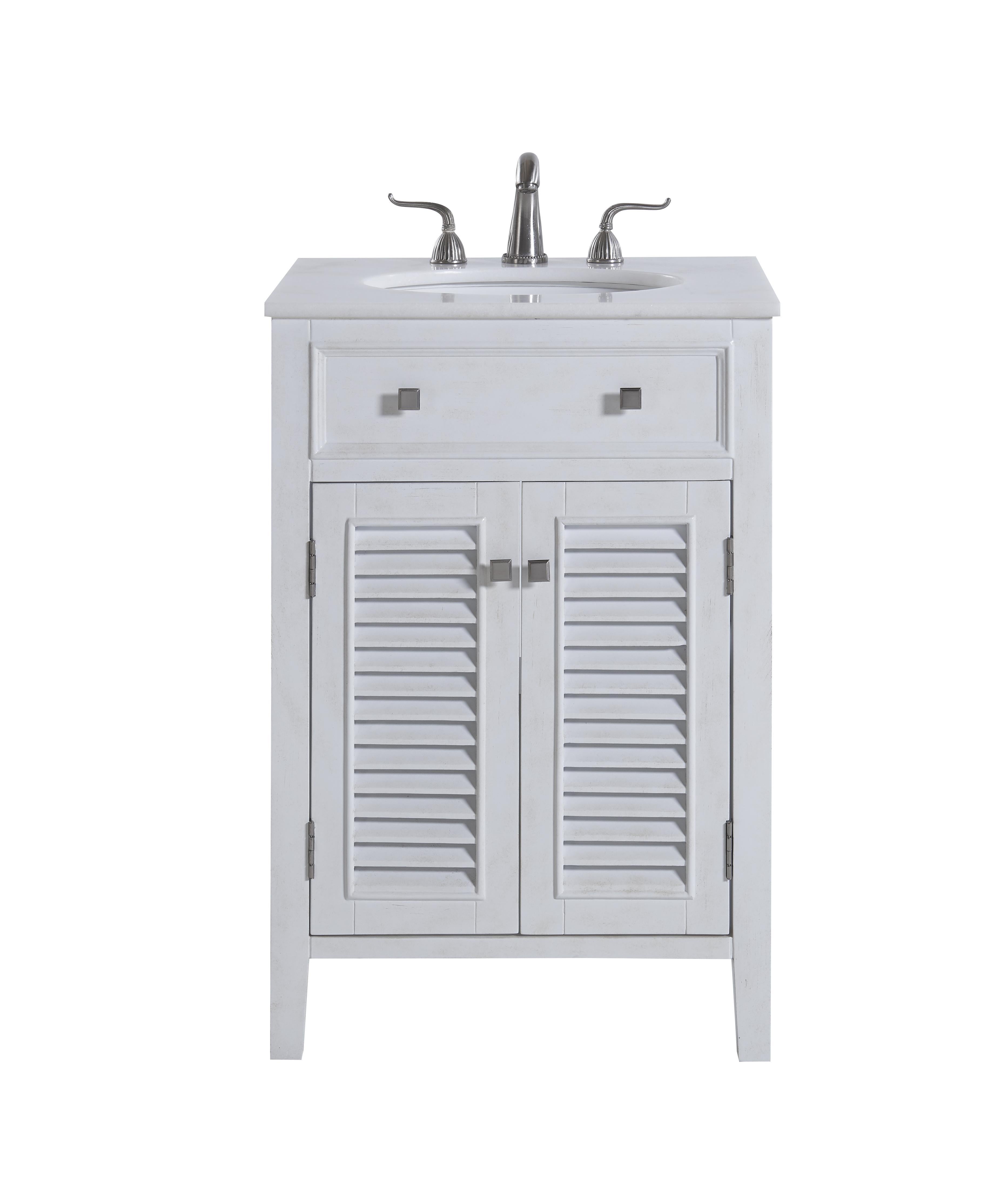 Dimensions Length: 21" Width: 24" Height: 35" Counter Top Length: 24" Counter Top Width: 21" Counter Top Height: 0.7" Sink Width: 15.5" Sink Depth: 12-3/8"" Sink Height: 7" Sink Drain Hole Size: 1.75" Faucet Hole Spacing: 8" Table Top Width: 21"" Specifications Product Type: Bathroom Vanities Wire Included: No Base Material: Solid wood and MDF Faucet Included: No Faucet Type: widespread Drain Assembly Included: No Assembly Required: NO Distressed Finish: yes Hardware Finish: Brushed steel Counter Top Finish: white and brown vein Counter Top Edge Style: Flat Sink Mounting Type: Undermount Vanity Mounting Type: Free-Standing Vanity Backsplash: No Number of Sinks: 1 Number of Faucet Holes: 3 Wood Type: Birch and Rubberwood Weight: 76.12 Product Warranty: 1 year limited Shipment type: Oversized Ground Drawers Drawers Included: NO Number of Drawers: 0 False Drawers: Yes Drawer Handle Designs: knobs Shelves Number of Shelves: 1 Shelf Width: 19-3/4" Cabinets Number of Cabinets: 1 Cabinet Interior Width: 19-3/4 Cabinet Interior Depth: 16-3/4" Cabinet Interior Height: 20-5/8"
