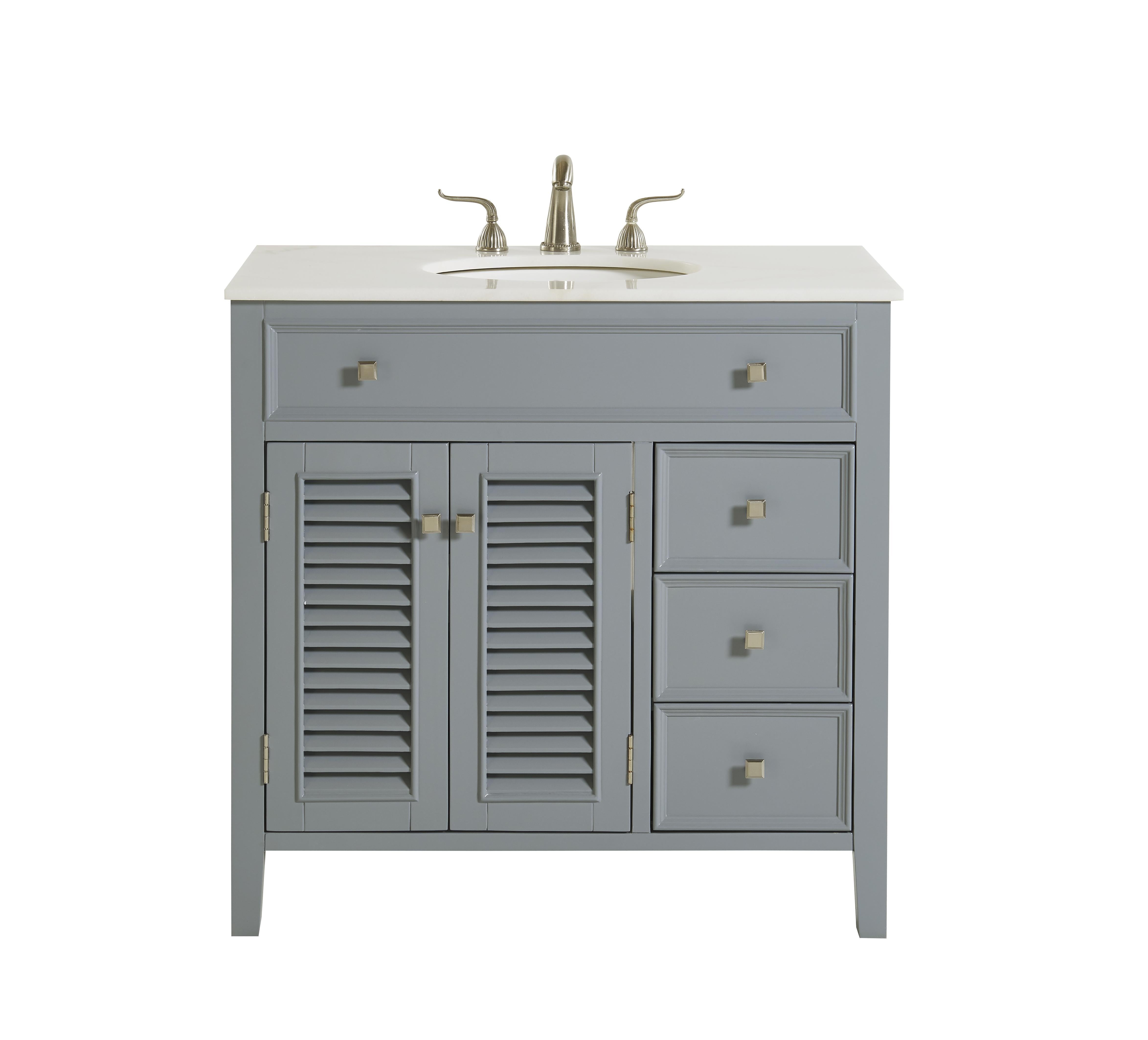 Dimensions Length: 36" Width: 21" Height: 35" Depth: 21" Counter Top Length: 36" Counter Top Width: 21" Counter Top Height: 0.7" Sink Width: 15.5" Sink Depth: 12-3/8"" Sink Height: 7" Sink Drain Hole Size: 1.75" Faucet Hole Spacing: 8" Table Top Width: 21"" Specifications Product Type: Bathroom Vanities Wire Included: No Base Material: Solid wood and MDF Faucet Included: No Faucet Type: widespread Drain Assembly Included: No Assembly Required: NO Distressed Finish: no Hardware Finish: Brushed steel Counter Top Finish: white and brown vein Counter Top Edge Style: Flat Sink Mounting Type: Undermount Vanity Mounting Type: Free-Standing Vanity Backsplash: No Number of Sinks: 1 Number of Faucet Holes: 3 Wood Type: Birch and Rubberwood Weight: 131.12 Product Warranty: 1 year limited Shipment type: LTL Drawers Drawers Included: yes Number of Drawers: 3 False Drawers: Yes Drawer Width: 10-1/8" Drawer Depth: 14 Drawer Height: 6-3/4" Drawer Handle Designs: knobs Shelves Number of Shelves: 1 Shelf Width: 20-1/2" Cabinets Number of Cabinets: 1 Cabinet Interior Width: 20-1/2 Cabinet Interior Depth: 16-3/4" Cabinet Interior Height: 20-5/8"