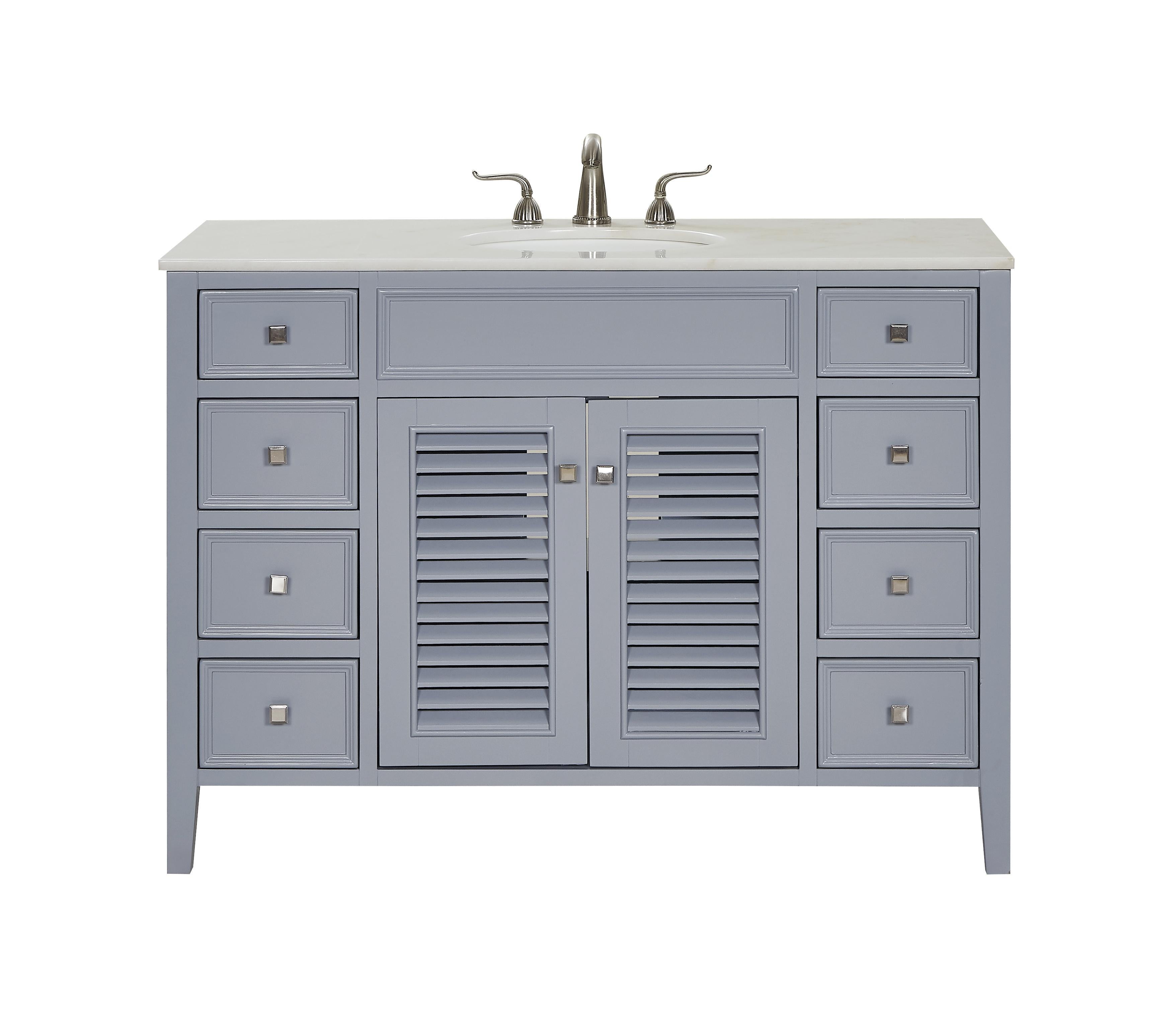 Dimensions Length: 48" Width: 21" Height: 35" Depth: 21" Counter Top Length: 48" Counter Top Width: 21" Counter Top Height: 0.7" Sink Width: 15.5" Sink Depth: 12-3/8"" Sink Height: 7" Sink Drain Hole Size: 1.75" Faucet Hole Spacing: 8" Table Top Width: 21"" Specifications Product Type: Bathroom Vanities Wire Included: No Base Material: Solid wood and MDF Faucet Included: No Faucet Type: widespread Drain Assembly Included: No Assembly Required: NO Distressed Finish: no Hardware Finish: Brushed steel Counter Top Finish: white and brown vein Counter Top Edge Style: Flat Sink Mounting Type: Undermount Vanity Mounting Type: Free-Standing Vanity Backsplash: No Number of Sinks: 1 Number of Faucet Holes: 3 Wood Type: Birch and Rubberwood Weight: 193.16 Product Warranty: 1 year limited Shipment type: LTL Drawers Drawers Included: yes Number of Drawers: 8 False Drawers: Yes Drawer Width: DW1:8-3/4 / DW2:8-3/4 Drawer Depth: DW1:14 / DW2:14 Drawer Height: DW1:5-1/8 / DW2:6-1/8 Drawer Handle Designs: knobs Shelves Number of Shelves: 1 Shelf Width: 23-3/4" Cabinets Number of Cabinets: 1 Cabinet Interior Width: 23-3/4 Cabinet Interior Depth: 16-3/4" Cabinet Interior Height: 20-5/8"