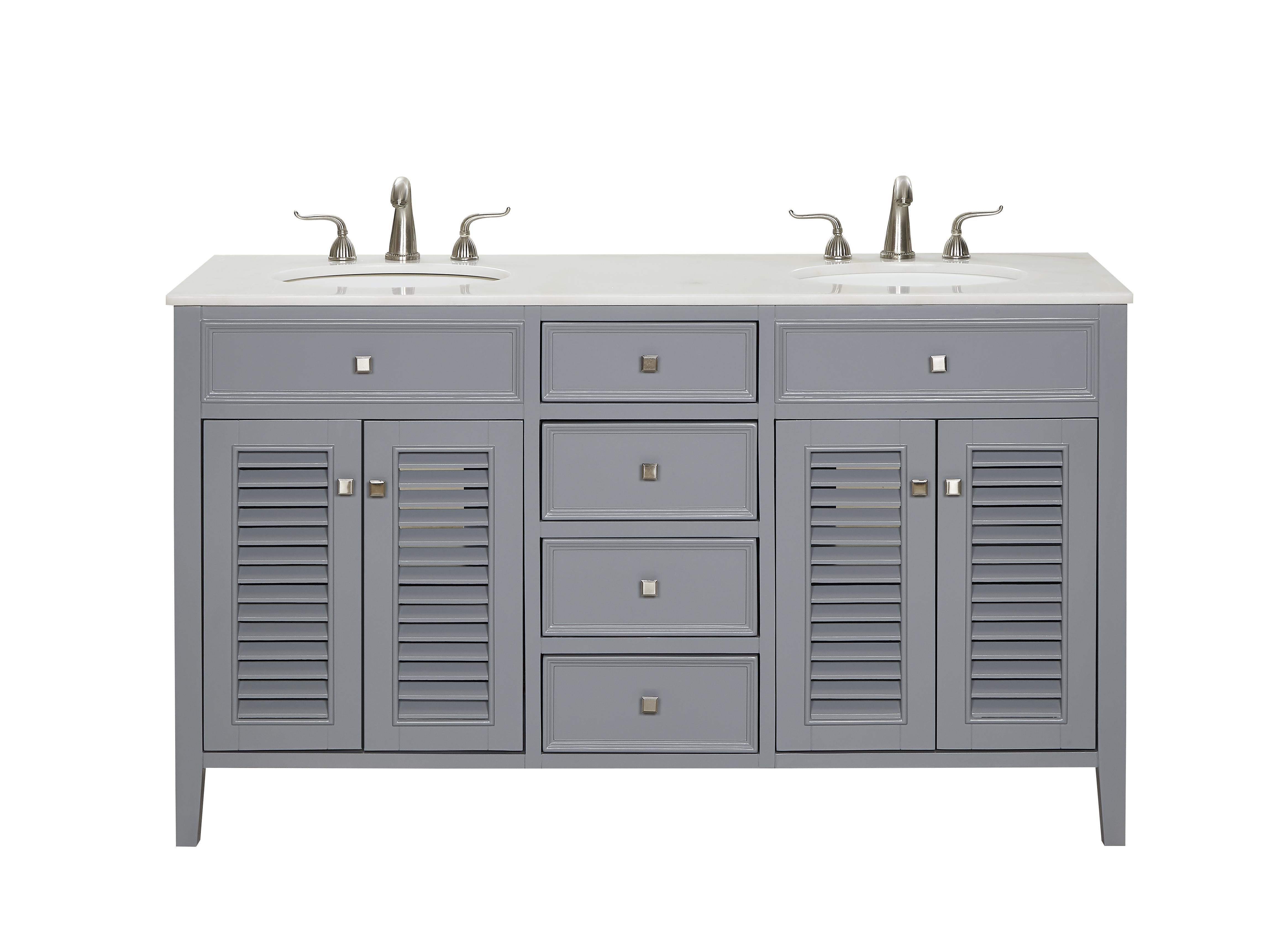 Dimensions Length: 60" Width: 21" Height: 35" Depth: 21" Counter Top Length: 60" Counter Top Width: 21" Counter Top Height: 0.7" Sink Width: 15.5" Sink Depth: 12-3/8"" Sink Height: 7" Sink Drain Hole Size: 1.75" Faucet Hole Spacing: 8" Table Top Width: 21"" Specifications Product Type: Bathroom Vanities Wire Included: No Base Material: Solid wood and MDF Faucet Included: No Faucet Type: widespread Drain Assembly Included: No Assembly Required: NO Distressed Finish: no Hardware Finish: Brushed steel Counter Top Finish: white and brown vein Counter Top Edge Style: Flat Sink Mounting Type: Undermount Vanity Mounting Type: Free-Standing Vanity Backsplash: No Number of Sinks: 2 Number of Faucet Holes: 6 Wood Type: Birch and Rubberwood Weight: 234.08 Product Warranty: 1 year limited Shipment type: LTL Drawers Drawers Included: yes Number of Drawers: 4 False Drawers: Yes Drawer Width: DW1: 13-1/4 / DW2: 13-1/4 Drawer Depth: DW1:14 / DW2:14 Drawer Height: DW1: 5-1/8 / DW2: 6-1/8 Drawer Handle Designs: knobs Shelves Number of Shelves: 2 Shelf Width: SHF1: 20-1/4", SHF2: 20-1/4" Cabinets Number of Cabinets: 2 Cabinet Interior Width: 20-1/4 Cabinet Interior Depth: 16-3/4" Cabinet Interior Height: 20-5/8"