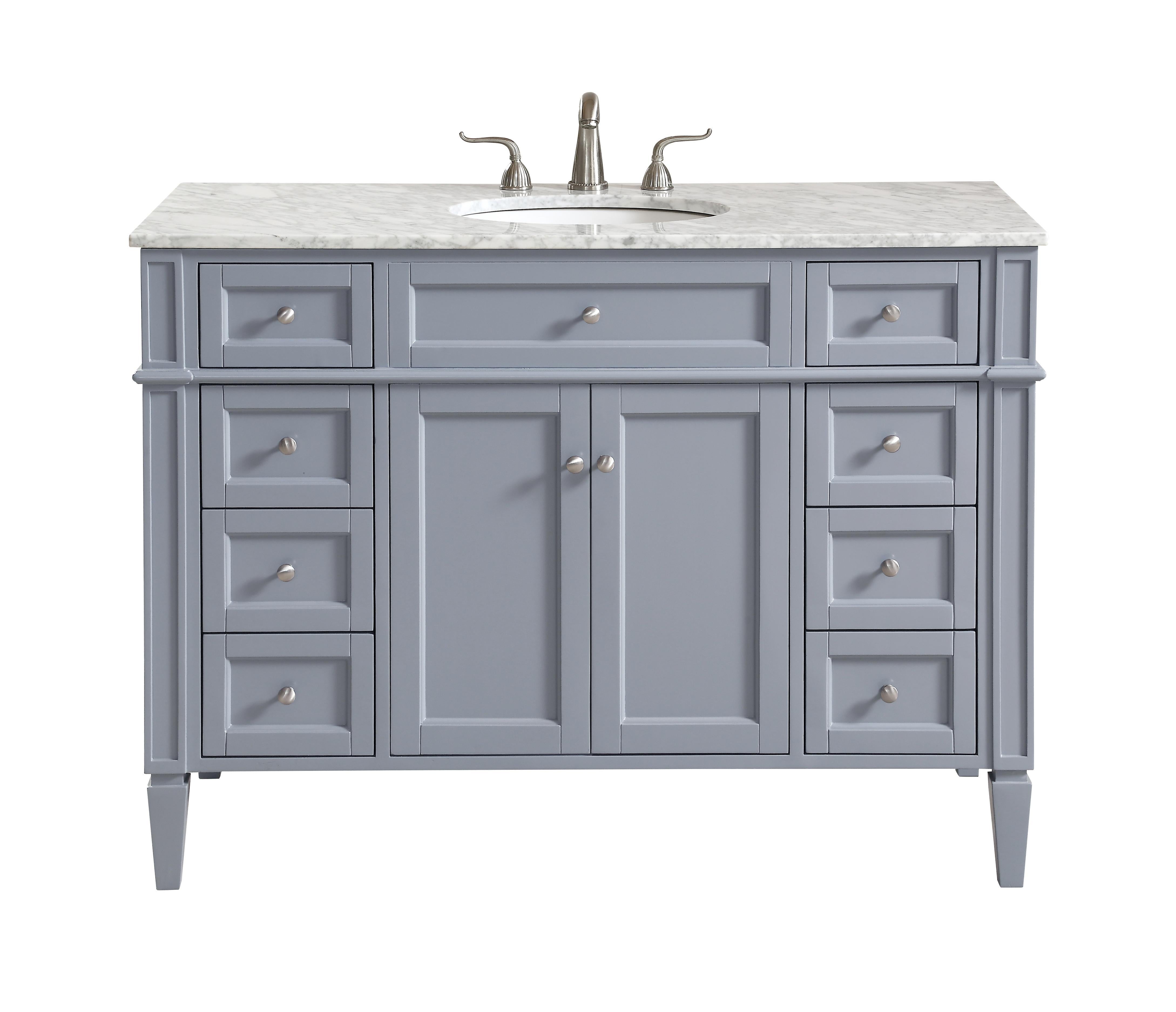 Installation Manual Dimensions Length: 48" Width: 21.5" Height: 35" Depth: 21.5" Counter Top Length: 48" Counter Top Width: 21.5" Counter Top Height: 0.7" Sink Width: 15.25" Sink Depth: 12" Sink Height: 7" Sink Drain Hole Size: 1.75" Faucet Hole Spacing: 8" Table Top Width: 21.5"" Specifications Product Type: Bathroom Vanities Wire Included: No Fixture Material: Solid Wood and MDF Base Material: Solid wood and MDF Faucet Included: No Faucet Type: widespread Drain Assembly Included: No Assembly Required: No Distressed Finish: no Hardware Finish: Chrome Counter Top Finish: Carrara white Counter Top Edge Style: Flat & Straight Sink Mounting Type: Undermount Vanity Mounting Type: Free-Standing Vanity Backsplash: No Number of Sinks: 1 Number of Faucet Holes: 3 Wood Type: Birch and Rubberwood Weight: 167.2 Product Warranty: 1 year limited Shipment type: LTL Drawers Drawers Included: Yes Number of Drawers: 8 False Drawers: YES Drawer Width: DW1: 9-1/8, DW2: 9-1/8 Drawer Depth: DW1: 14, DW2: 14 Drawer Height: DW1: 5-5/8, DW2: 6-1/2 Drawer Handle Designs: Knobs Shelves Number of Shelves: 1 Shelf Width: 21-1/2" Cabinets Number of Cabinets: 1 Cabinet Interior Width: 21-1/2 Cabinet Interior Depth: 18.88 Cabinet Interior Height: 19-5/8"