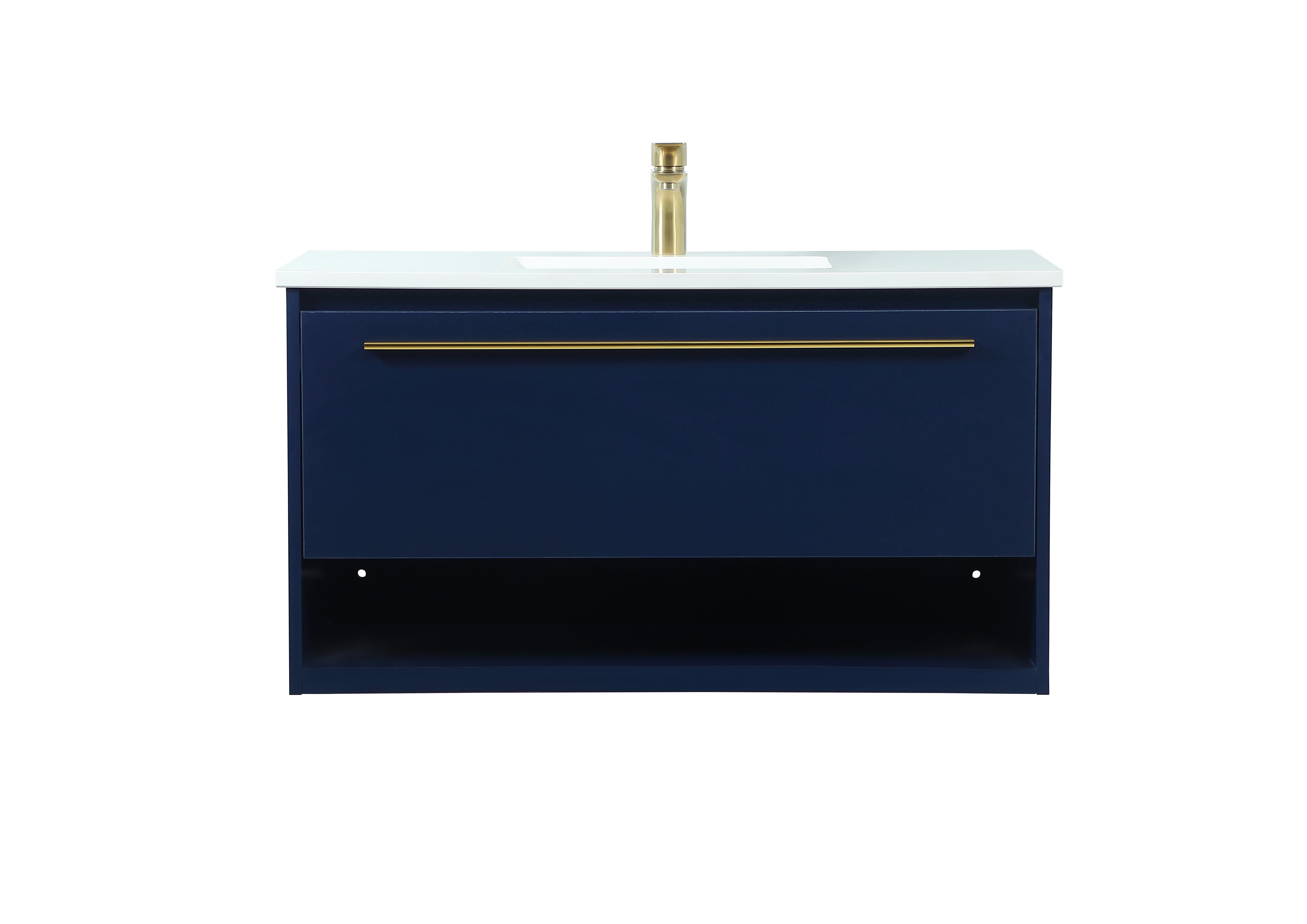 Installation Manual Dimensions Length: 36" Width: 18" Height: 19.7" Counter Top Length: 36" Counter Top Width: 18.31" Counter Top Height: 0.71" Sink Width: 15.35" Sink Depth: 10.24" Sink Height: 8.25" Sink Drain Hole Size: 1.77" Specifications Product Type: Bathroom Vanities Wire Included: No Harware Material: Aluminum alloy Fixture Material: MDF Base Material: MDF Product Shape: Rectangle Faucet Included: NO Drain Assembly Included: NO Assembly Required: No Distressed Finish: NO Hardware Finish: Gold Counter Top Finish: Ivory Counter Top Edge Style: FLAT Sink Mounting Type: Undermount Vanity Mounting Type: Wall Mounted Vanity Backsplash: NO Number of Sinks: 1 Number of Faucet Holes: 1 Weight: 93.7 Product Warranty: 1 year limited Shipment type: LTL Drawers Drawers Included: YES Number of Drawers: 1 False Drawers: NO Drawer Width: 33.7 Drawer Depth: 14.37 Drawer Height: 11.42 Drawer Handle Designs: Bar pulls Shelves Number of Shelves: 1 Shelf Width: 33.86