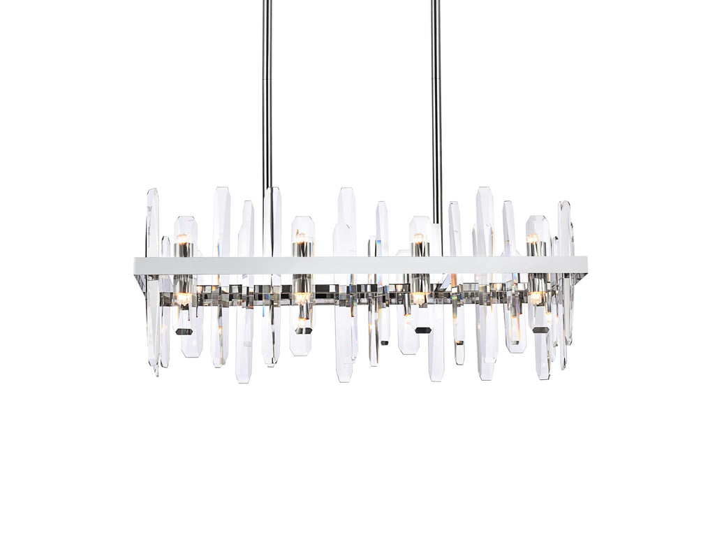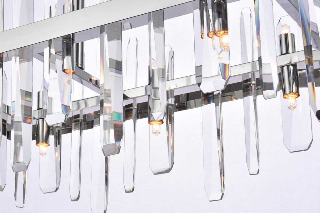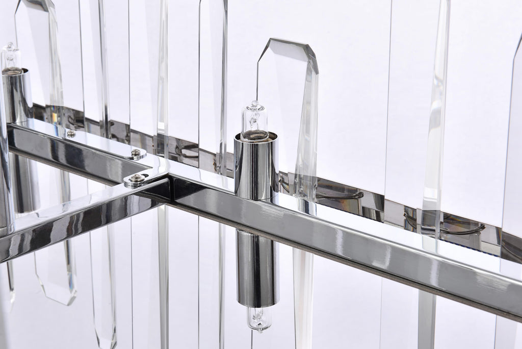 Dimensions Chain/Rod Length: 46" Length: 30" Width: 12" Height: 12" Maximum Height: 57.5" Wire Length: 75" Specifications Product Type: Chandeliers Hanging Device: Rod Voltage: 110V - 125V Dimmable: Yes Socket Type: G9 Number of Lights: 16 Wattage/Bulb: 20W Max/Nominal Watt: 320W Crystal/Glass Color: Clear Wire Included: Yes ETL: Yes Harware Material: Iron Fixture Material: Iron and Crystal Product Shape: Rectangle Assembly Required: Yes Distressed Finish: No Hardware Finish: Chrome Bulb Included: No Dry/Wet/Damp: Dry Weight: 20.6 Product Warranty: 1 year limited Shipment type: small parcel