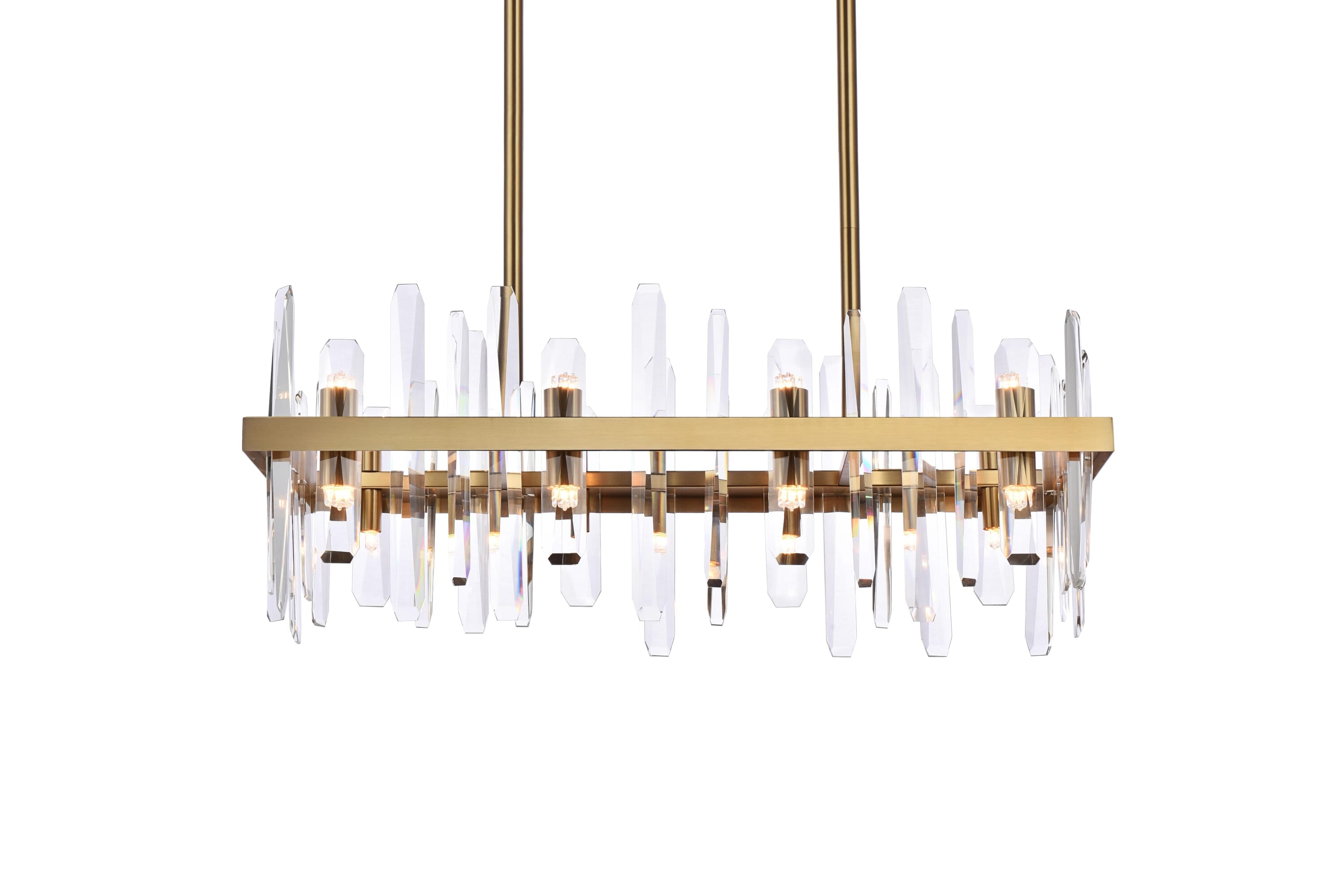 Dimensions Chain/Rod Length: 46" Length: 30" Width: 12" Height: 12" Maximum Height: 57.5" Wire Length: 75" Specifications Product Type: Chandeliers Hanging Device: Rod Voltage: 110V - 125V Dimmable: Yes Socket Type: G9 Number of Lights: 16 Wattage/Bulb: 20W Max/Nominal Watt: 320W Crystal/Glass Color: Clear Wire Included: Yes ETL: Yes Harware Material: Iron Fixture Material: Iron and Crystal Product Shape: Rectangle Assembly Required: Yes Distressed Finish: No Hardware Finish: Satin Gold Bulb Included: No Dry/Wet/Damp: Dry Weight: 20.6 Product Warranty: 1 year limited Shipment type: small parcel