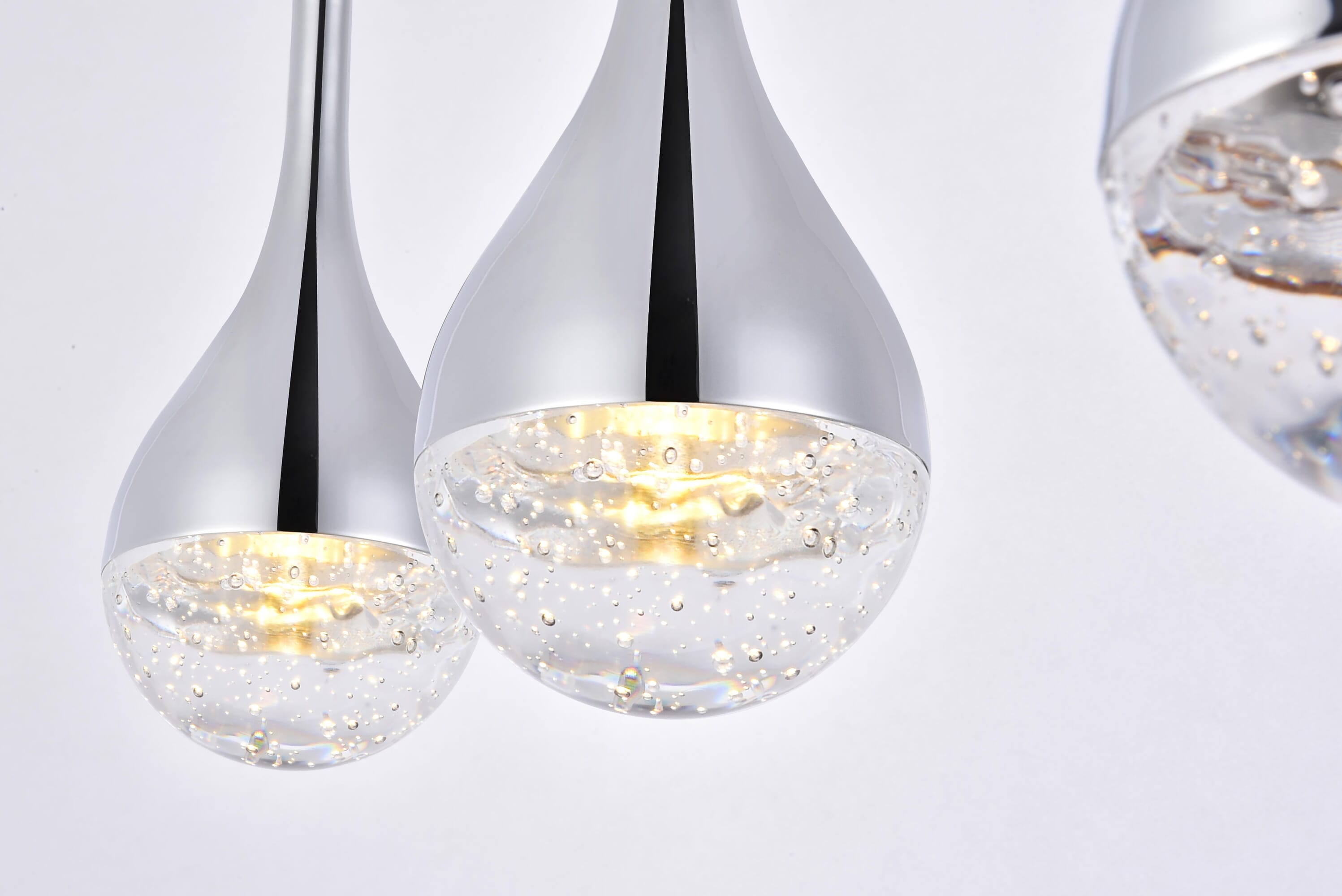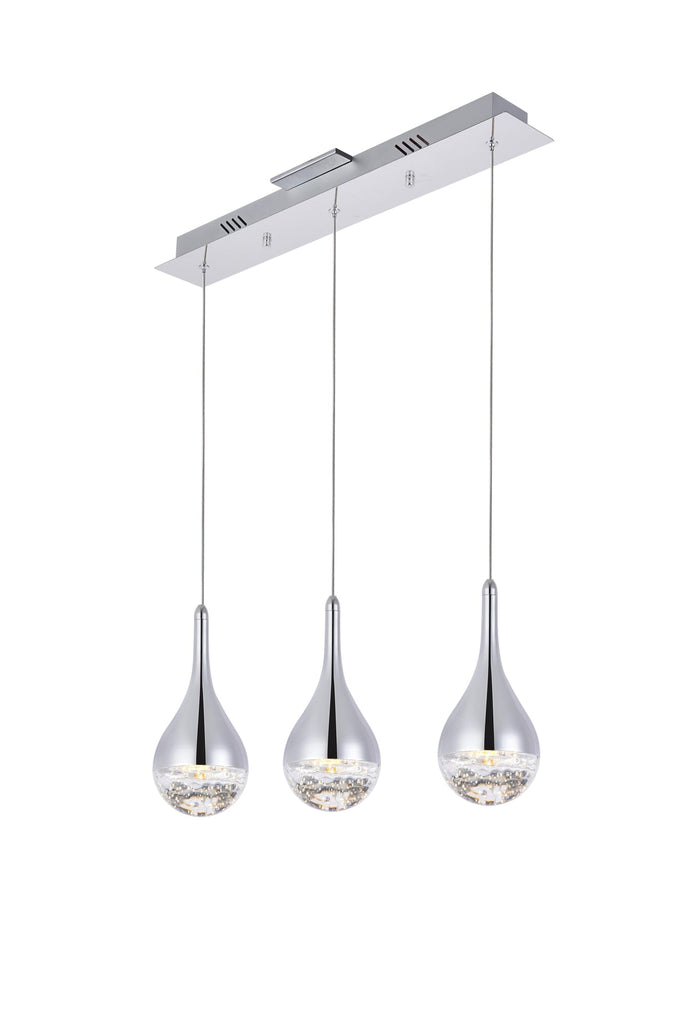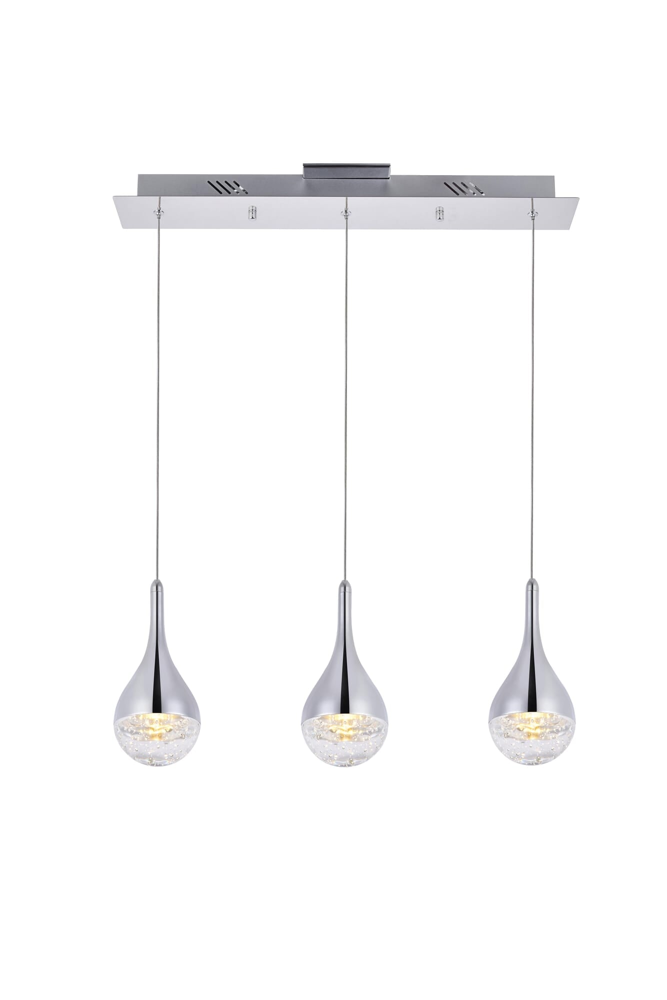 Dimensions Chain/Rod Length: 70.9" Length: 24" Width: 4" Height: 9" Maximum Height: 81" Wire Length: 71" Specifications Product Type: Chandeliers Hanging Device: Cable Voltage: 115V - 125V Dimmable: Yes, Up To 90% Socket Type: Integrated LED Number of Lights: 3 Wattage/Bulb: 5W Max/Nominal Watt: 15W Crystal/Glass Color: clear Wire Included: Yes Color Temperature: 3000K Lumens: 1200 Watts: 5 Fixture Material: Iron, Aluminum, and Crystal Product Shape: Rectangle Assembly Required: NO Hardware Finish: chrome Average Life (Hours): 30000 Bulb Included: Yes Dry/Wet/Damp: Dry Weight: 9.5 Product Warranty: 1 year limited Shipment type: Small Parcel