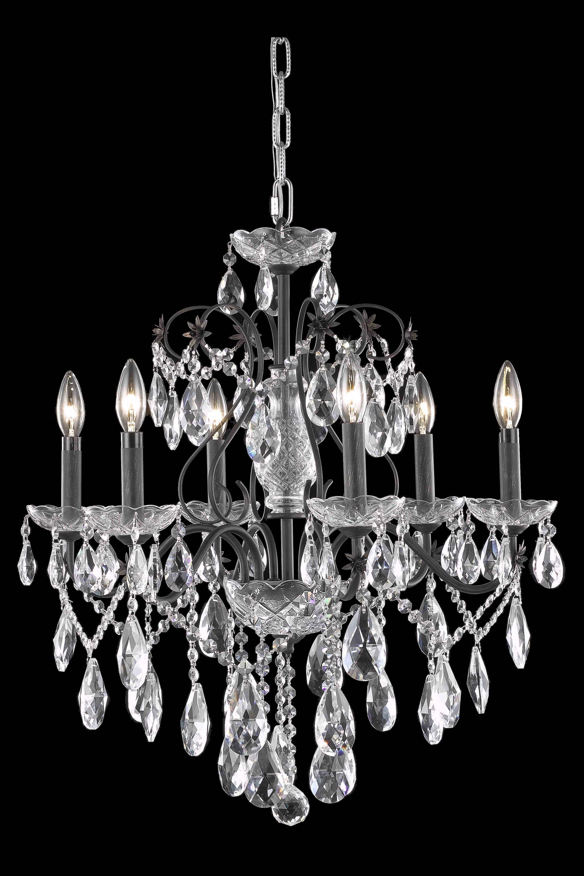 Dimensions Chain/Rod Length: 60" Length: 24" Width: 24" Height: 21" Maximum Height: 81" Wire Length: 141.73" Specifications Product Type: Chandeliers Hanging Device: Chain Voltage: 110V - 125V Dimmable: Yes Socket Type: E12 Number of Lights: 6 Wattage/Bulb: 40 Max/Nominal Watt: 240 Crystal/Glass Color: clear Wire Included: Yes Bulb Shape: B10 Harware Material: Steel Fixture Material: Steel and Crystal Product Shape: Chandeliers Assembly Required: YES Hardware Finish: Dark Bronze Bulb Included: No UL & ULC Standard: UL,ULC Weight: 21 Product Warranty: 1 year limited Shipment type: Small Parcel