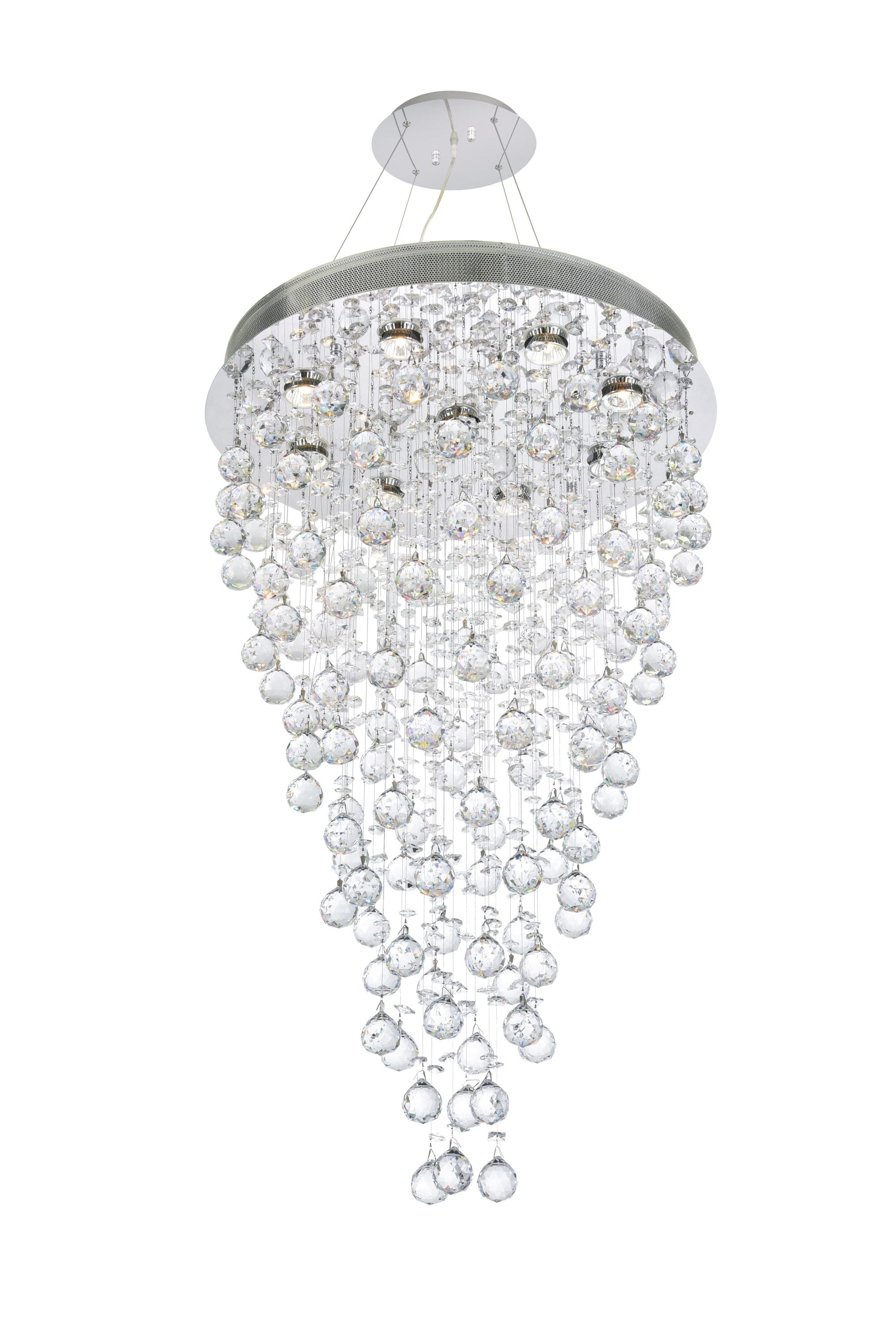 Dimensions Chain/Rod Length: 98" Length: 24" Width: 24" Height: 36" Maximum Height: 134" Wire Length: 118" Specifications Product Type: Chandeliers Hanging Device: Cord Voltage: 110V - 125V Dimmable: Yes Socket Type: GU10 Number of Lights: 9 Wattage/Bulb: 50 Max/Nominal Watt: 400 Crystal/Glass Color: clear Wire Included: Yes Bulb Shape: MR16 Harware Material: Steel Fixture Material: Steel Product Shape: Chandeliers Assembly Required: NO Hardware Finish: Chrome Bulb Included: No UL & ULC Standard: UL,ULC Weight: 52 Product Warranty: 1 year limited Shipment type: Small Parcel