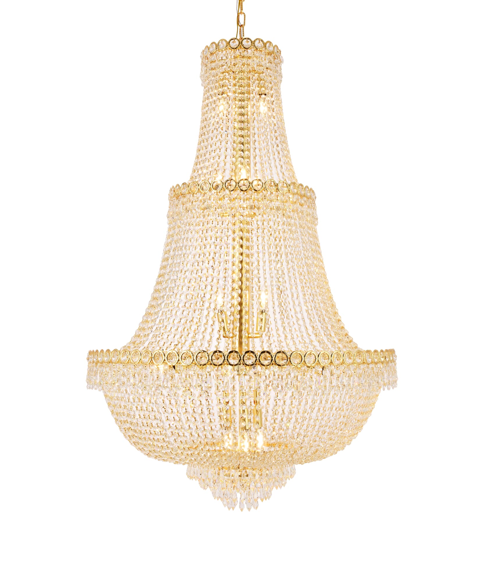 Dimensions Chain/Rod Length: 60" Length: 30" Width: 30" Height: 48" Maximum Height: 108" Wire Length: 141.73" Specifications Product Type: Chandeliers Hanging Device: Chain Voltage: 110V - 125V Dimmable: Yes Socket Type: E12 Number of Lights: 17 Wattage/Bulb: 40 Max/Nominal Watt: 680 Crystal/Glass Color: clear Wire Included: Yes Bulb Shape: B10 Harware Material: Steel Fixture Material: Steel and Crystal Product Shape: Chandeliers Assembly Required: YES Hardware Finish: Gold Bulb Included: No UL & ULC Standard: UL,ULC Weight: 62 Product Warranty: 1 year limited Shipment type: Oversized Ground