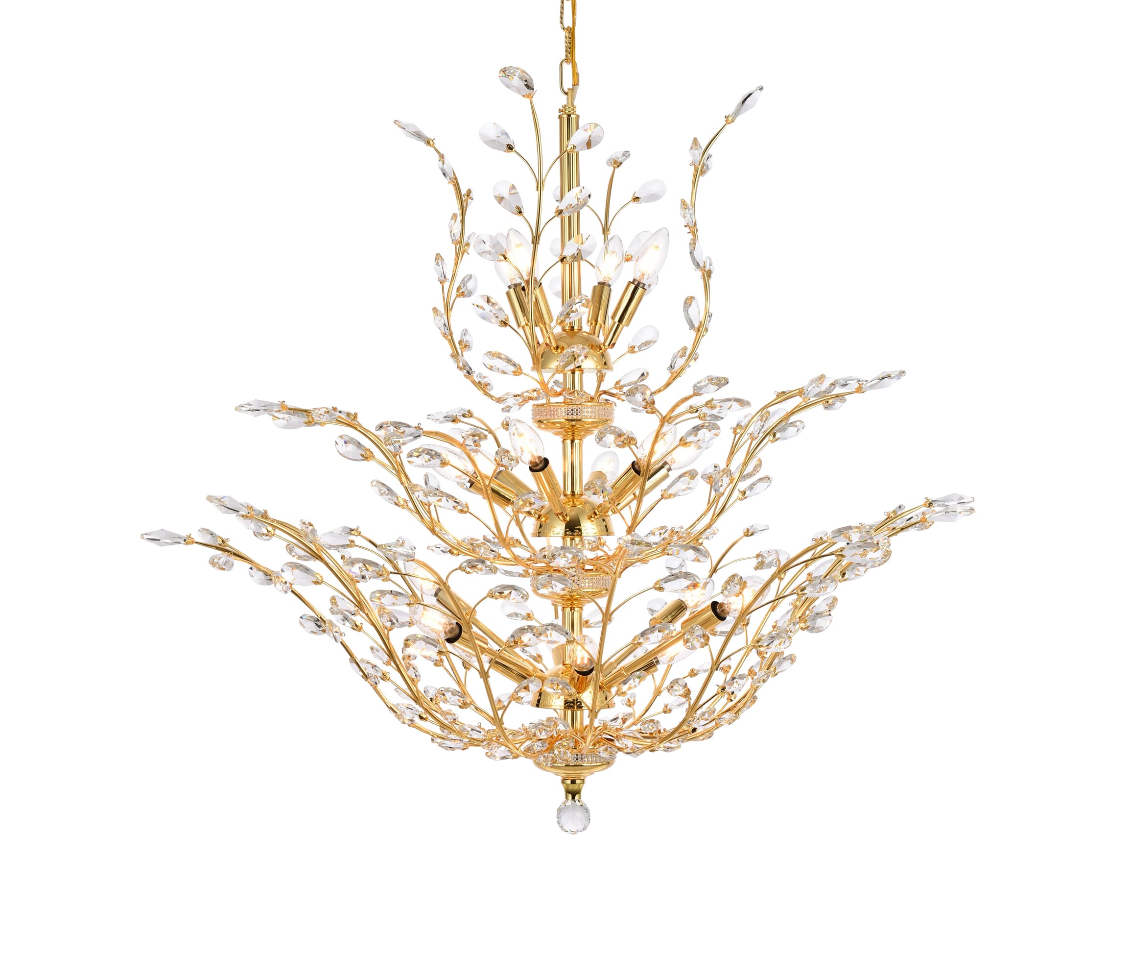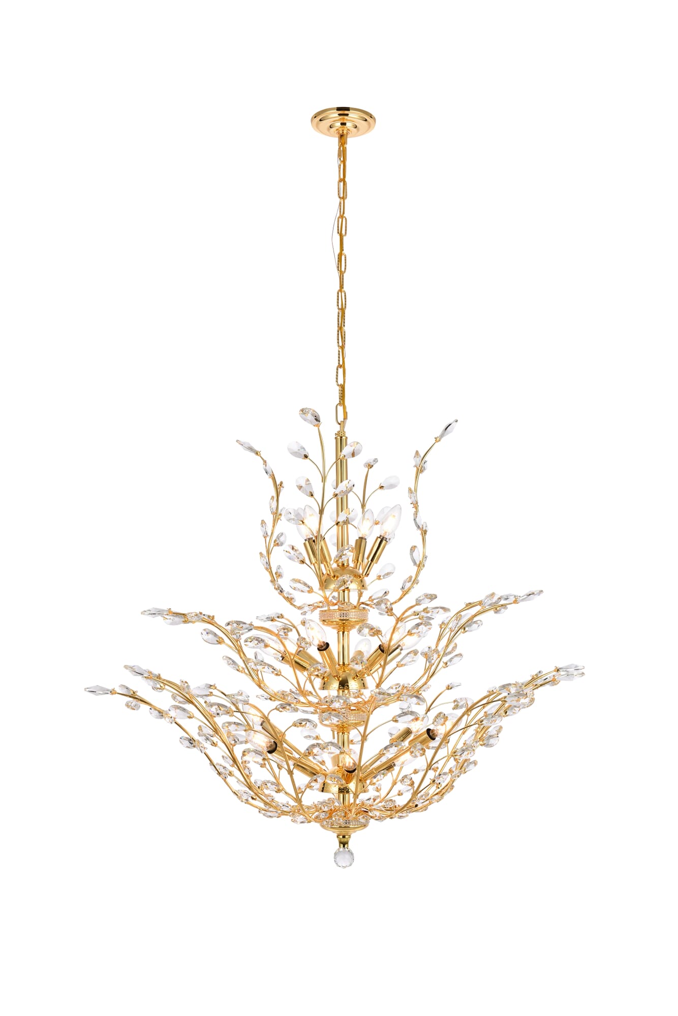 Dimensions Chain/Rod Length: 60" Length: 41" Width: 41" Height: 34" Maximum Height: 94" Wire Length: 141.73" Specifications Product Type: Chandeliers Hanging Device: Chain Voltage: 110V - 125V Dimmable: Yes Socket Type: E12 Number of Lights: 18 Wattage/Bulb: 40 Max/Nominal Watt: 720 Crystal/Glass Color: clear Wire Included: Yes Bulb Shape: B10 Harware Material: Steel Fixture Material: Steel and Crystal Product Shape: Chandeliers Assembly Required: YES Hardware Finish: Gold Bulb Included: No UL & ULC Standard: UL,ULC Weight: 39 Product Warranty: 1 year limited Shipment type: Small Parcel