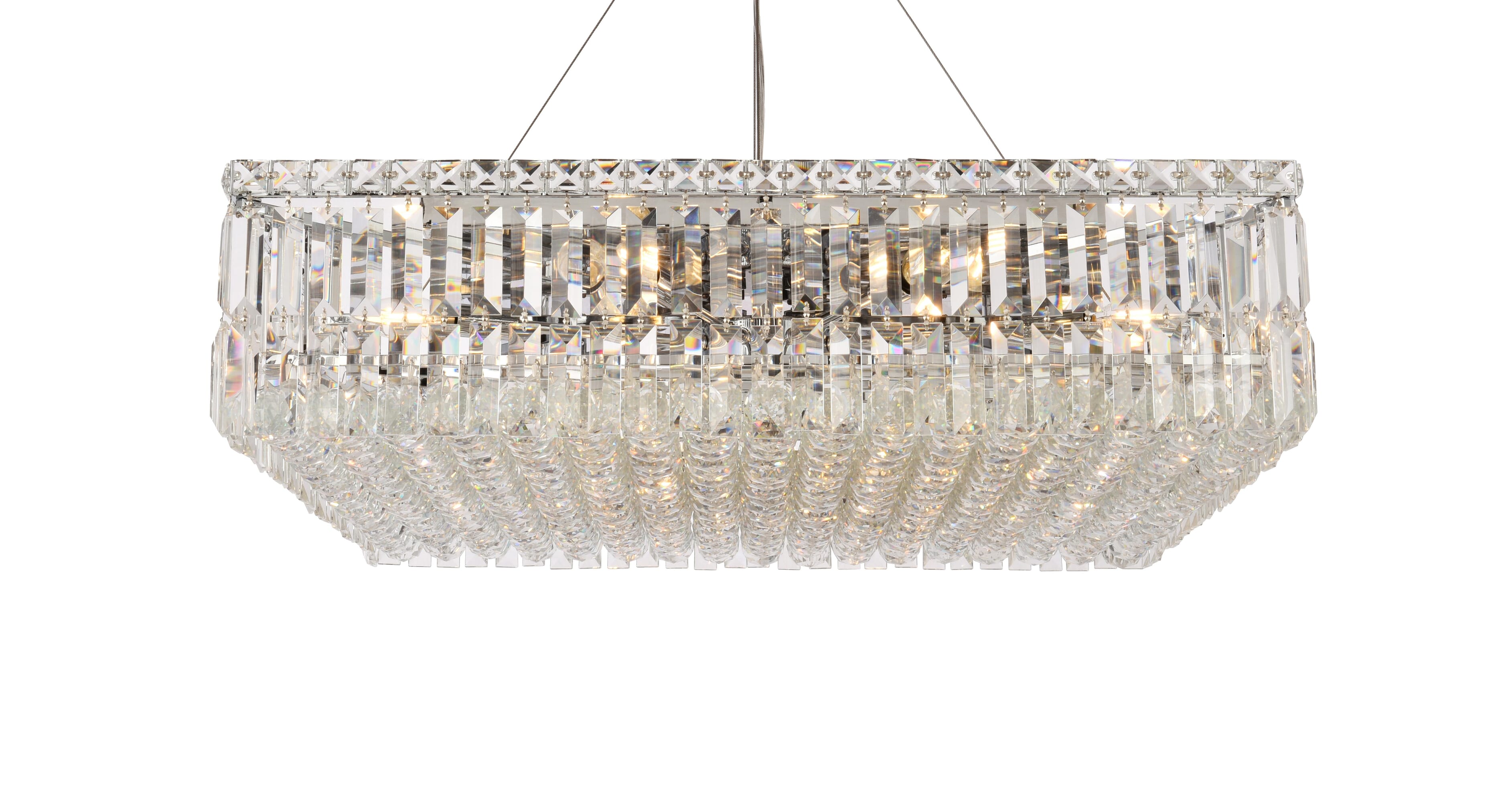 Dimensions Chain/Rod Length: 72" Length: 28" Width: 28" Height: 7.5" Maximum Height: 80" Wire Length: 141.73" Specifications Product Type: Chandeliers Hanging Device: Cord Voltage: 110V - 125V Dimmable: Yes Socket Type: E12 Number of Lights: 12 Wattage/Bulb: 40 Max/Nominal Watt: 480 Crystal/Glass Color: clear Wire Included: Yes Bulb Shape: B10 Harware Material: Steel Fixture Material: Steel and Crystal Product Shape: Chandeliers Assembly Required: YES Hardware Finish: Chrome Bulb Included: No UL & ULC Standard: UL,ULC Weight: 99 Product Warranty: 1 year limited Shipment type: Small Parcel