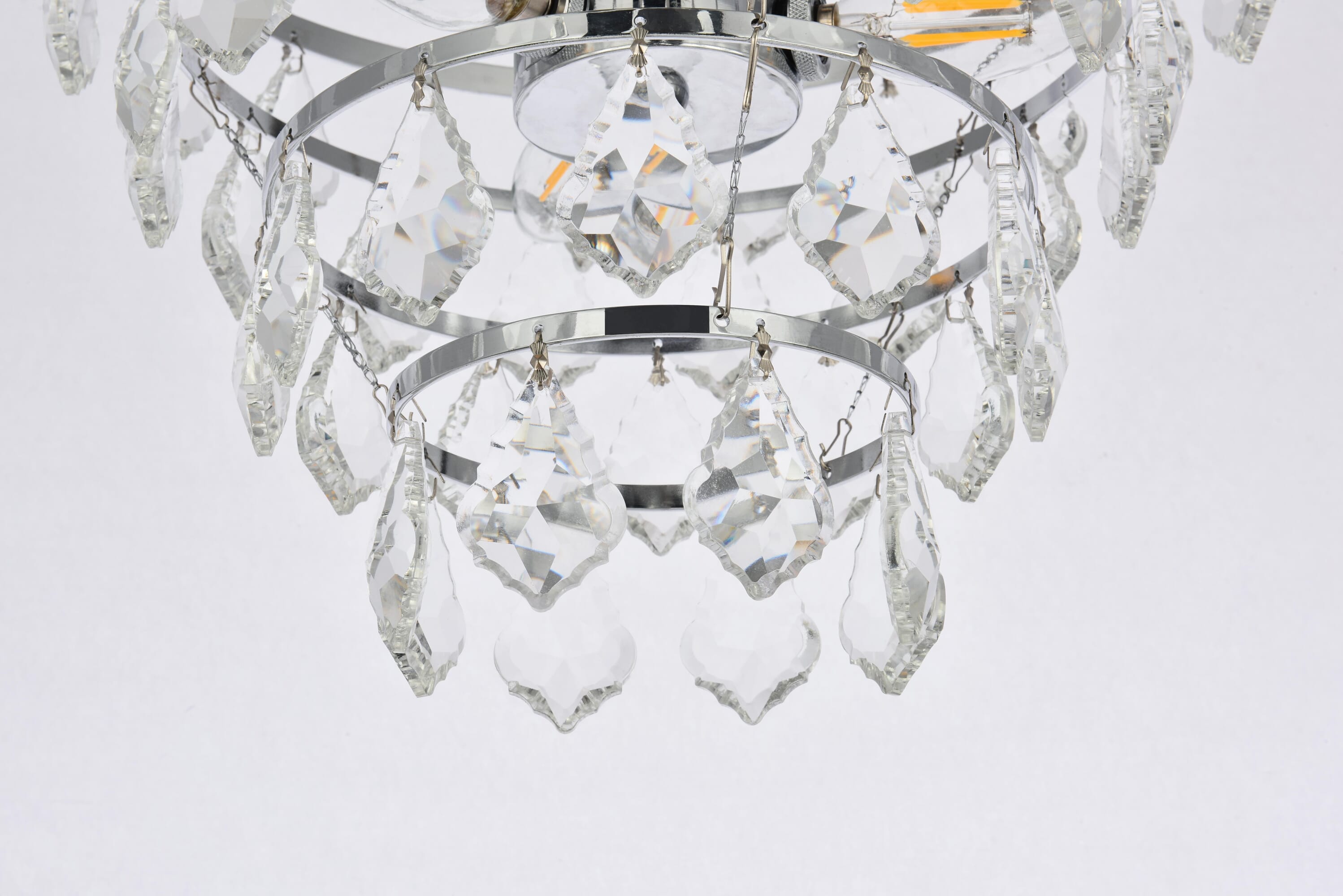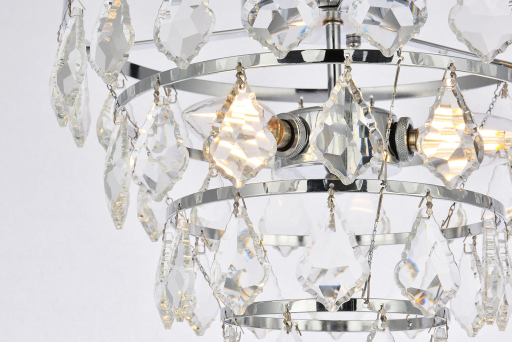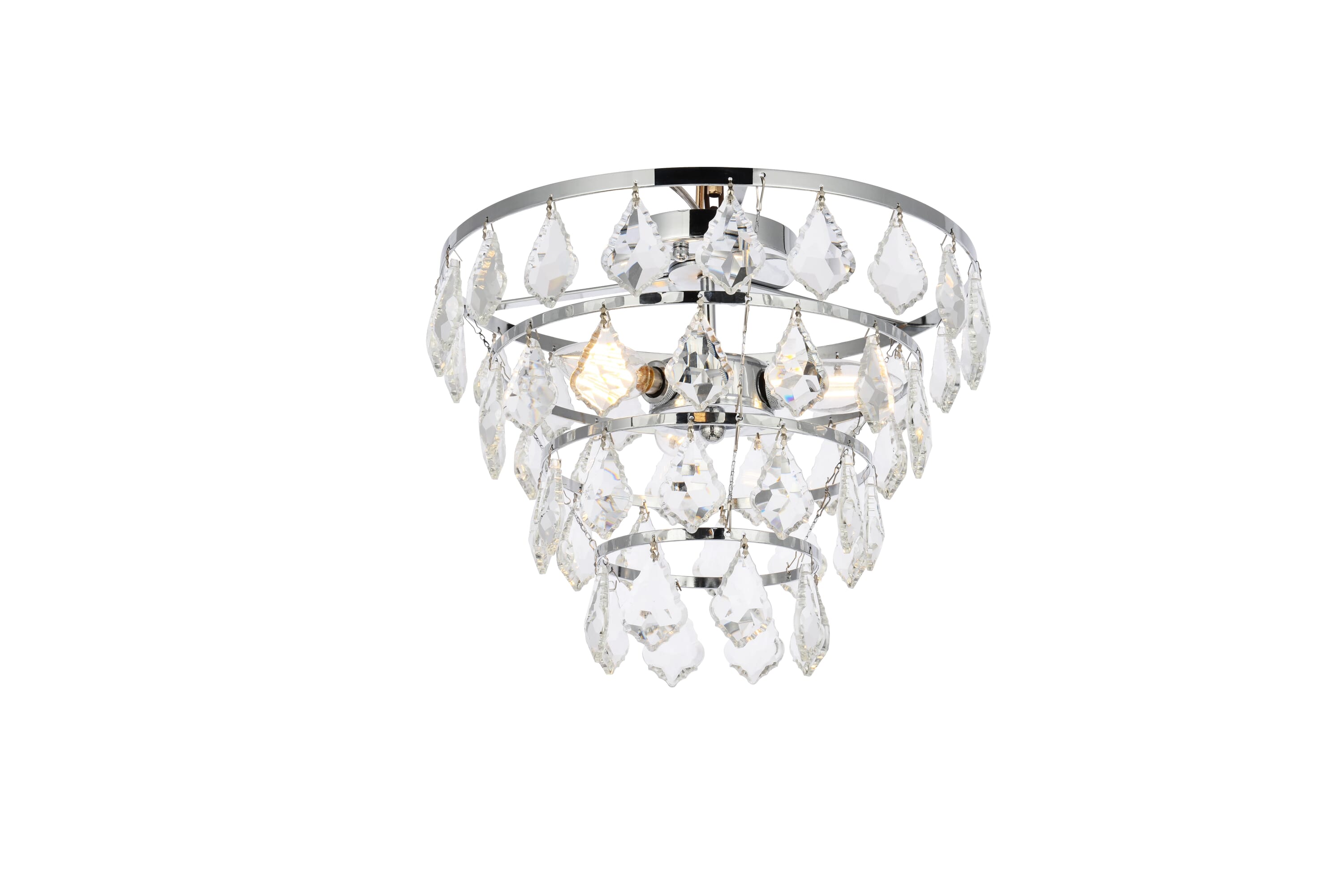 Dimensions Length: 16" Width: 16" Height: 11" Wire Length: 20" Specifications Product Type: Flush Mounts Voltage: 120V Dimmable: Yes Socket Type: E12 Number of Lights: 3 Wattage/Bulb: 40W Max/Nominal Watt: 120W Crystal/Glass Color: CLEAR Wire Included: Yes ETL: YES Harware Material: Iron Fixture Material: Iron and Crystal Product Shape: Round Assembly Required: YES Distressed Finish: NO Hardware Finish: chrome Bulb Included: No UL & ULC Standard: No Dry/Wet/Damp: Dry Weight: 6.8 Product Warranty: 1 year limited Shipment type: Small Parcel