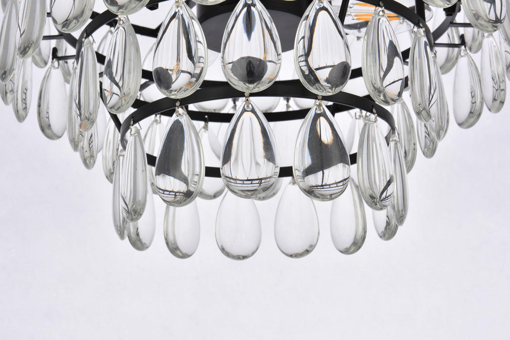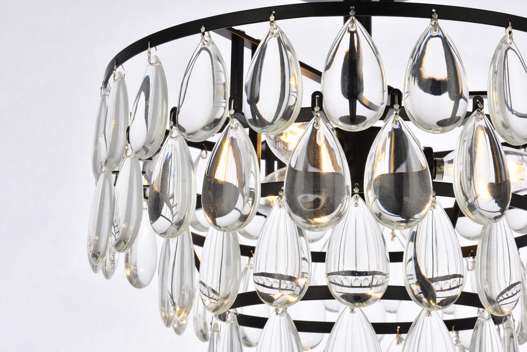 Dimensions Length: 14" Width: 14" Height: 12" Wire Length: 20" Specifications Product Type: Flush Mounts Voltage: 120V Dimmable: Yes Socket Type: E12 Number of Lights: 3 Wattage/Bulb: 40W Max/Nominal Watt: 120W Crystal/Glass Color: CLEAR Wire Included: Yes ETL: YES Harware Material: Iron Fixture Material: Iron and Crystal Product Shape: Round Assembly Required: YES Distressed Finish: NO Hardware Finish: black Bulb Included: No UL & ULC Standard: No Dry/Wet/Damp: Dry Weight: 7.6 Product Warranty: 1 year limited Shipment type: Small Parcel