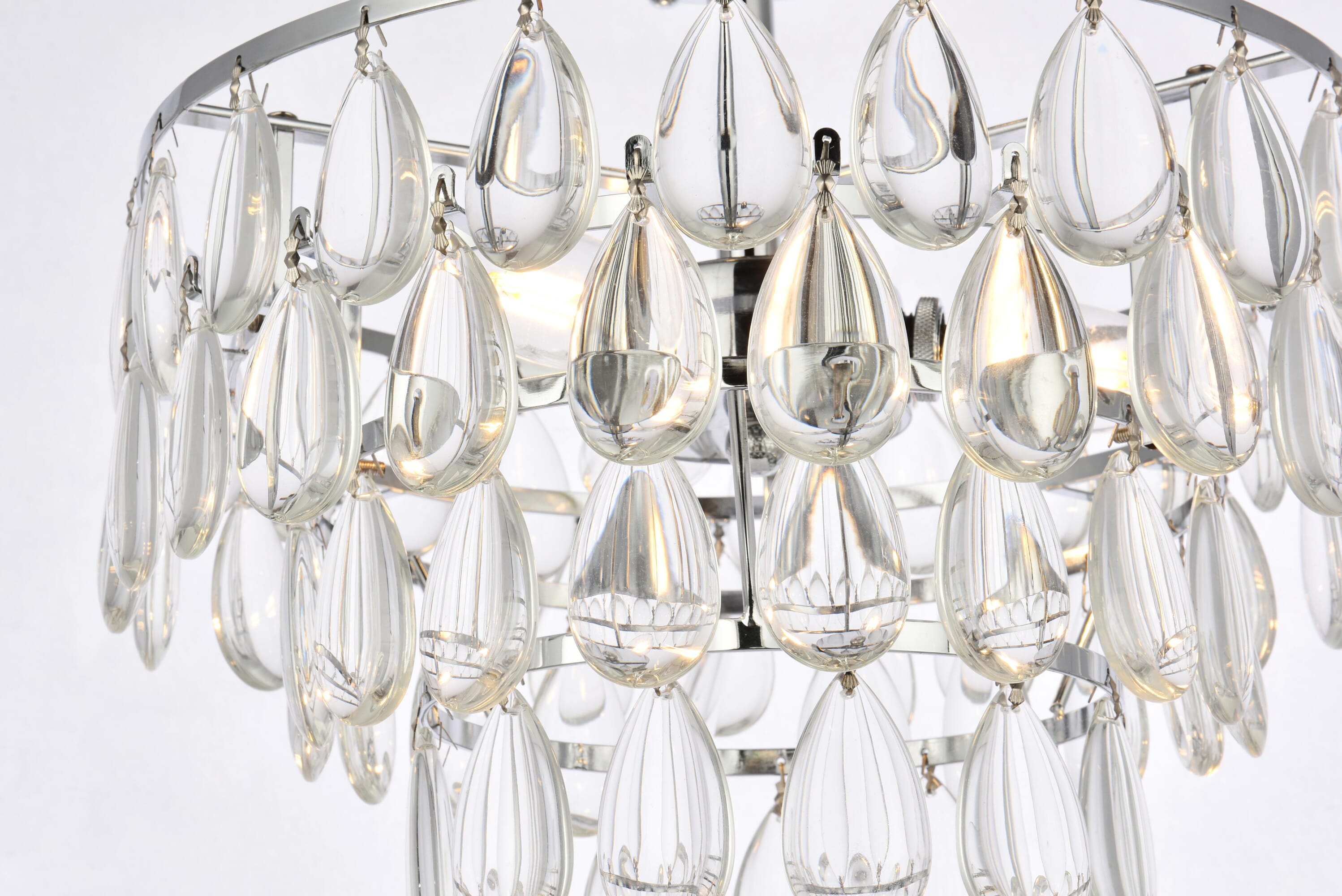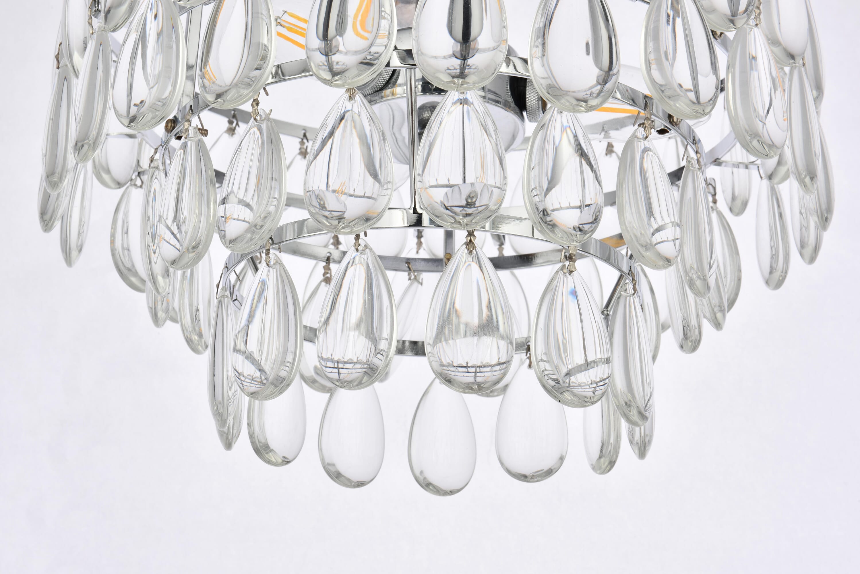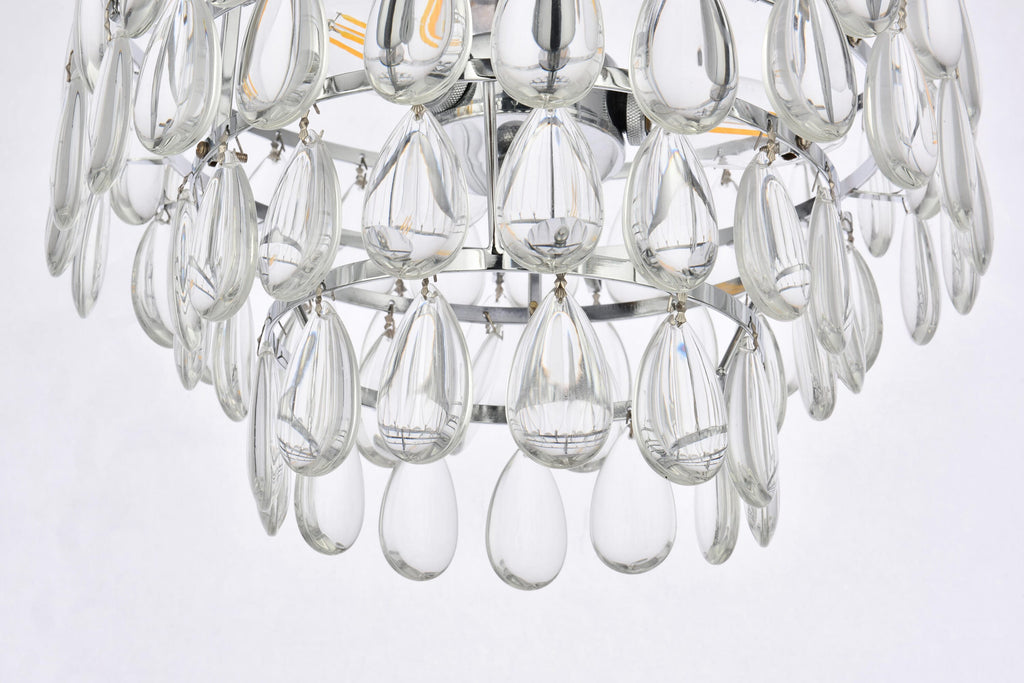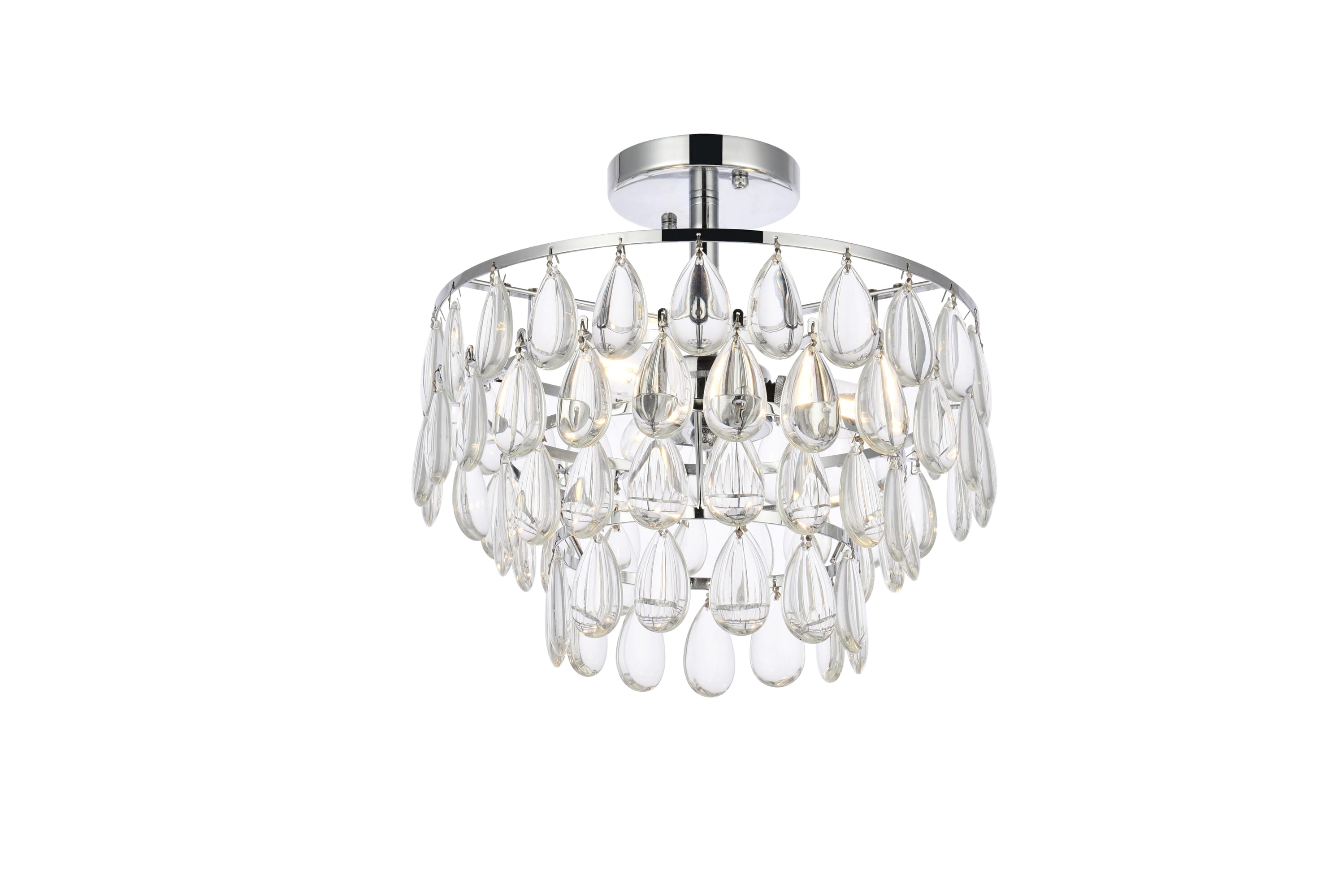 Dimensions Length: 14" Width: 14" Height: 12" Wire Length: 20" Specifications Product Type: Flush Mounts Voltage: 120V Dimmable: Yes Socket Type: E12 Number of Lights: 3 Wattage/Bulb: 40W Max/Nominal Watt: 120W Crystal/Glass Color: CLEAR Wire Included: Yes ETL: YES Harware Material: Iron Fixture Material: Iron and Crystal Product Shape: Round Assembly Required: YES Distressed Finish: NO Hardware Finish: chrome Bulb Included: No UL & ULC Standard: No Dry/Wet/Damp: Dry Weight: 7.6 Product Warranty: 1 year limited Shipment type: Small Parcel