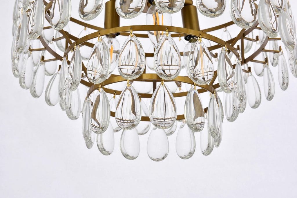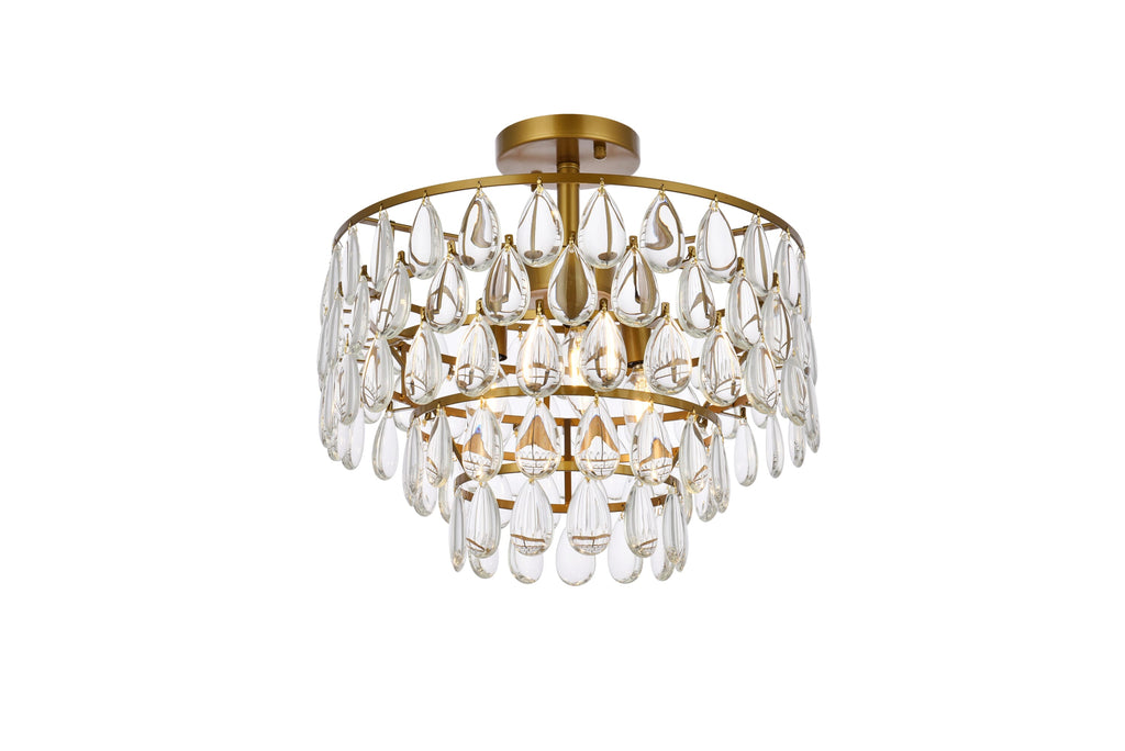 Dimensions Length: 16" Width: 16" Height: 14" Wire Length: 20" Specifications Product Type: Flush Mounts Voltage: 120V Dimmable: Yes Socket Type: E12 Number of Lights: 3 Wattage/Bulb: 40W Max/Nominal Watt: 120W Crystal/Glass Color: CLEAR Wire Included: Yes ETL: YES Harware Material: Iron Fixture Material: Iron and Crystal Product Shape: Round Assembly Required: YES Distressed Finish: NO Hardware Finish: brass Bulb Included: No UL & ULC Standard: No Dry/Wet/Damp: Dry Weight: 10.5 Product Warranty: 1 year limited Shipment type: Small Parcel