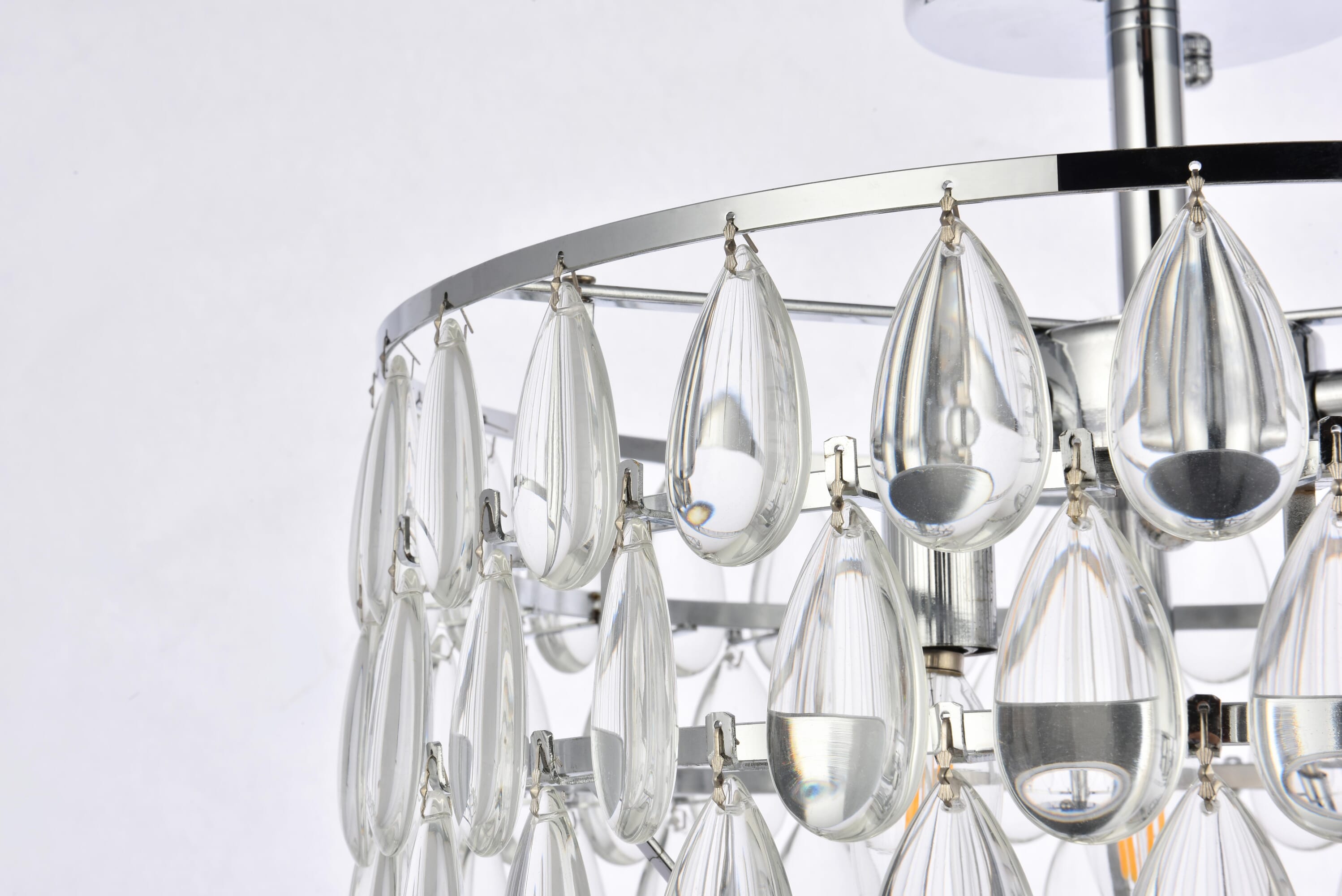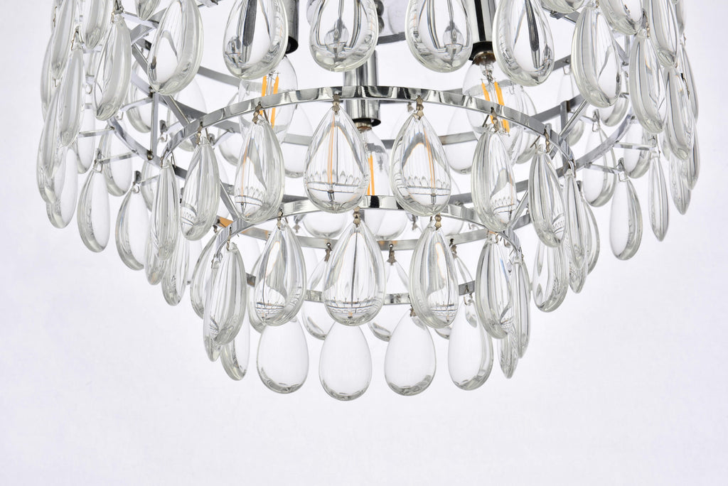 Dimensions Length: 16" Width: 16" Height: 14" Wire Length: 20" Specifications Product Type: Flush Mounts Voltage: 120V Dimmable: Yes Socket Type: E12 Number of Lights: 3 Wattage/Bulb: 40W Max/Nominal Watt: 120W Crystal/Glass Color: CLEAR Wire Included: Yes ETL: YES Harware Material: Iron Fixture Material: Iron and Crystal Product Shape: Round Assembly Required: YES Distressed Finish: NO Hardware Finish: chrome Bulb Included: No UL & ULC Standard: No Dry/Wet/Damp: Dry Weight: 10.5 Product Warranty: 1 year limited Shipment type: Small Parcel