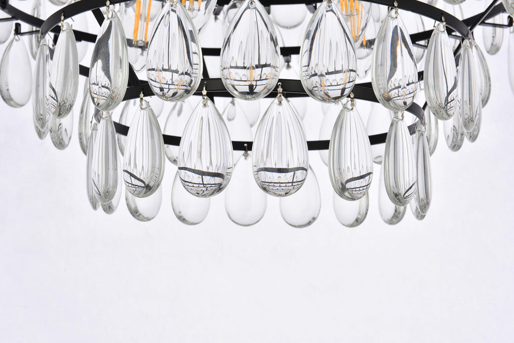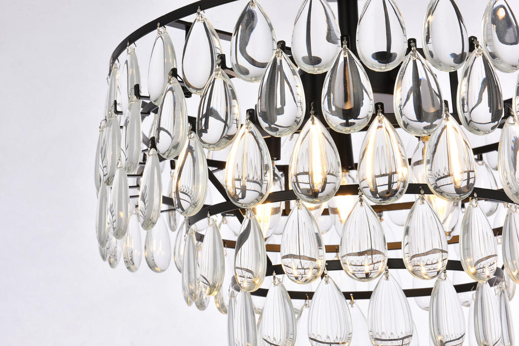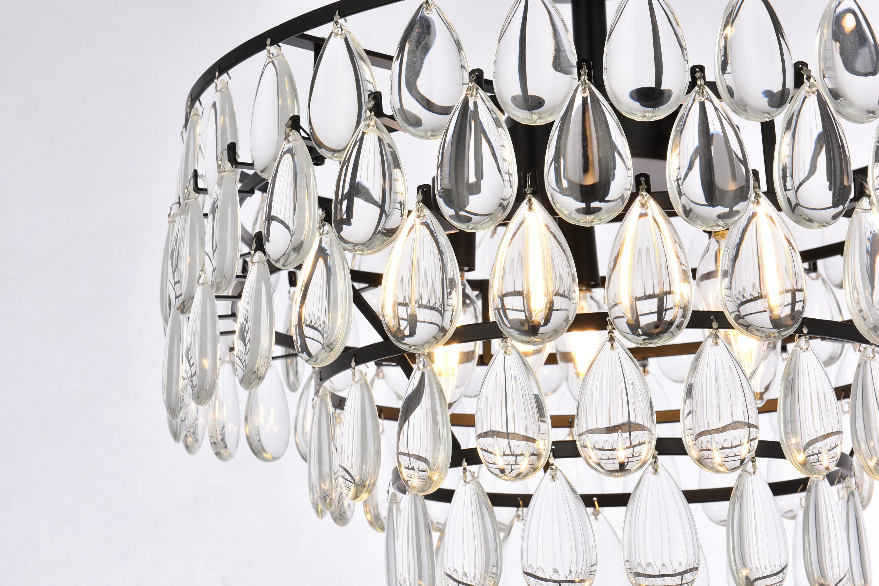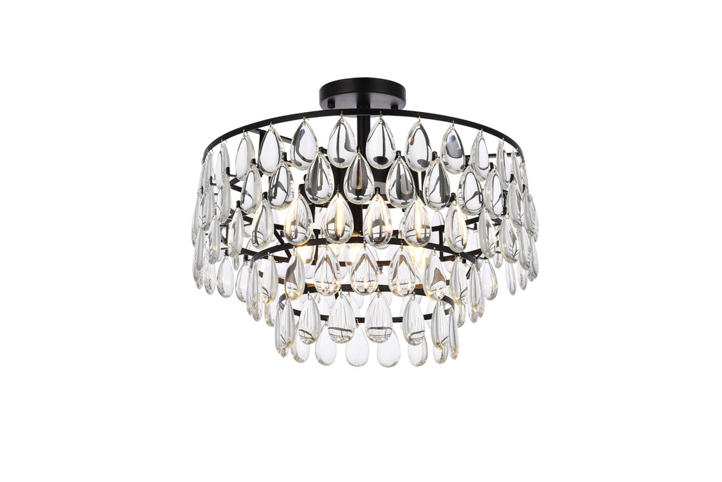 Dimensions Length: 18" Width: 18" Height: 14" Wire Length: 20" Specifications Product Type: Flush Mounts Voltage: 120V Dimmable: Yes Socket Type: E12 Number of Lights: 5 Wattage/Bulb: 40W Max/Nominal Watt: 200W Crystal/Glass Color: CLEAR Wire Included: Yes ETL: YES Harware Material: Iron Fixture Material: Iron and Crystal Product Shape: Round Assembly Required: YES Distressed Finish: NO Hardware Finish: black Bulb Included: No UL & ULC Standard: No Dry/Wet/Damp: Dry Weight: 12.7 Product Warranty: 1 year limited Shipment type: Small Parcel