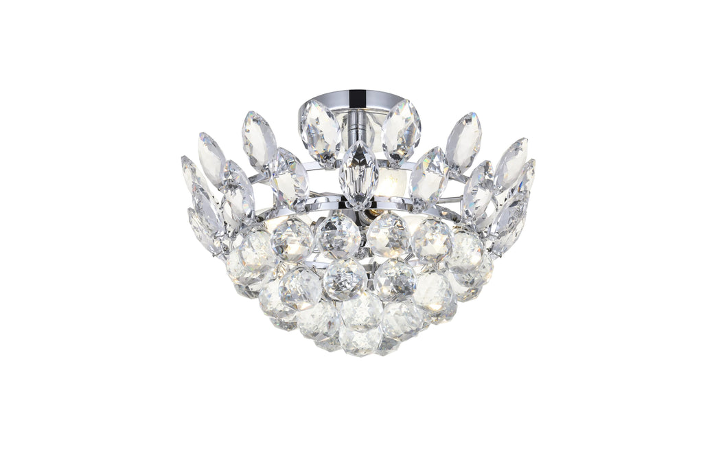 Dimensions Length: 14" Width: 14" Height: 9.5" Wire Length: 20" Specifications Product Type: Flush Mounts Voltage: 120V Dimmable: Yes Socket Type: E12 Number of Lights: 3 Wattage/Bulb: 40W Max/Nominal Watt: 120W Crystal/Glass Color: CLEAR Wire Included: Yes ETL: YES Harware Material: Iron Fixture Material: Iron and Crystal Product Shape: Round Assembly Required: YES Distressed Finish: NO Hardware Finish: chrome Bulb Included: No UL & ULC Standard: No Dry/Wet/Damp: Dry Weight: 11 Product Warranty: 1 year limited Shipment type: Small Parcel