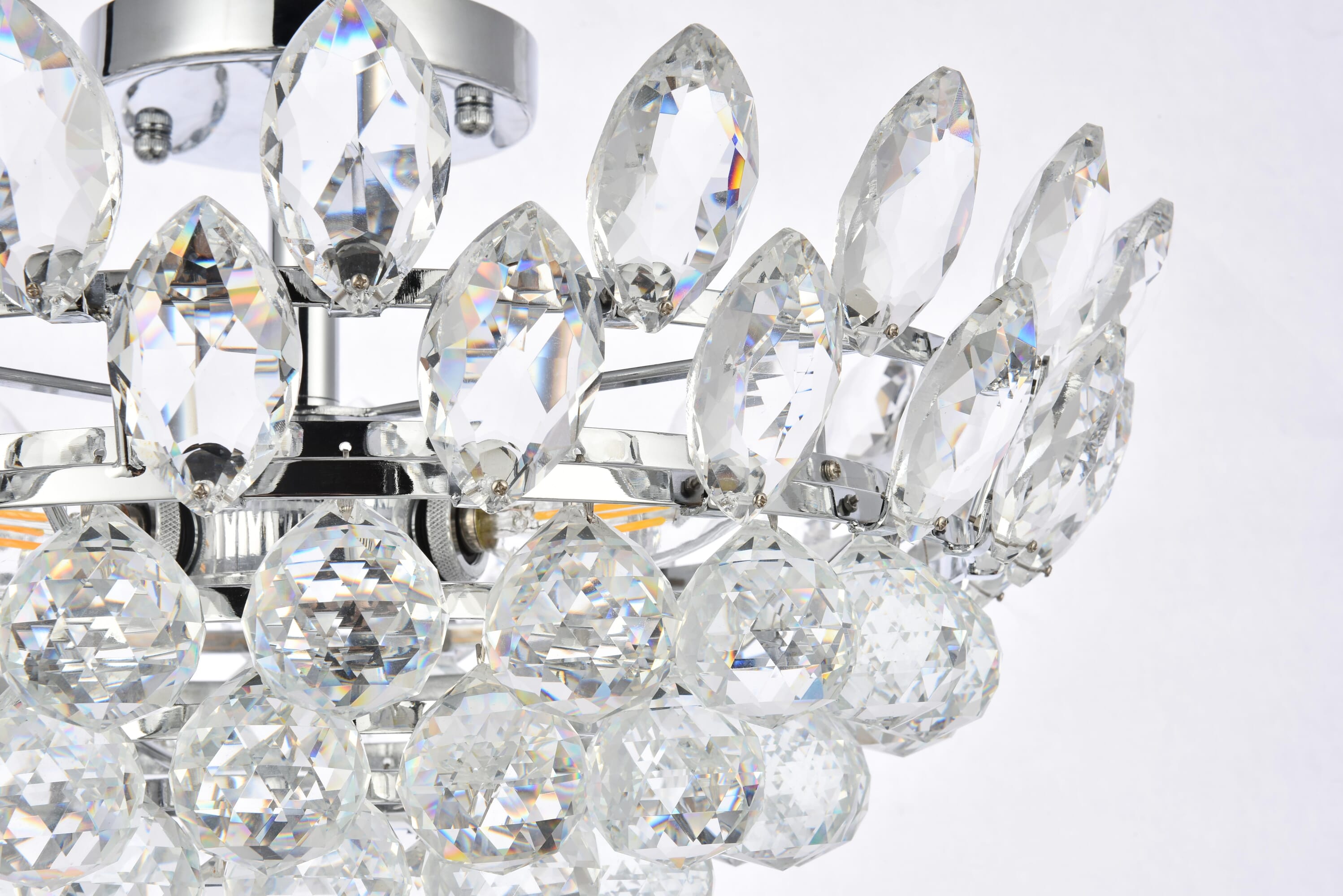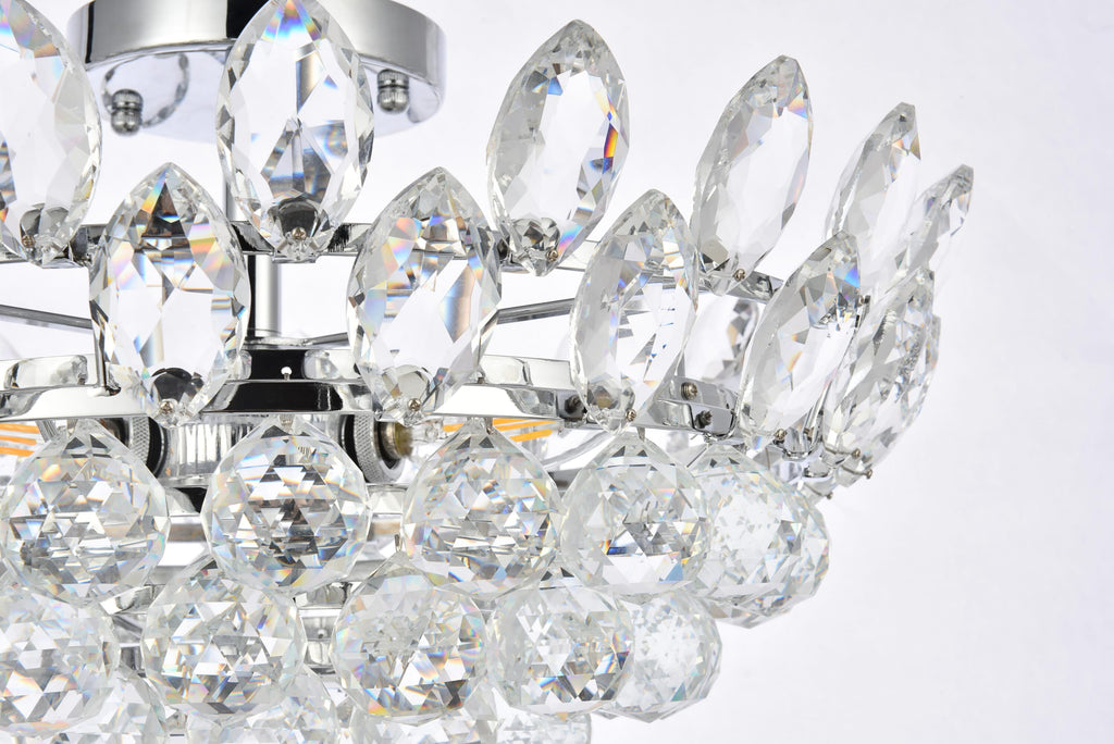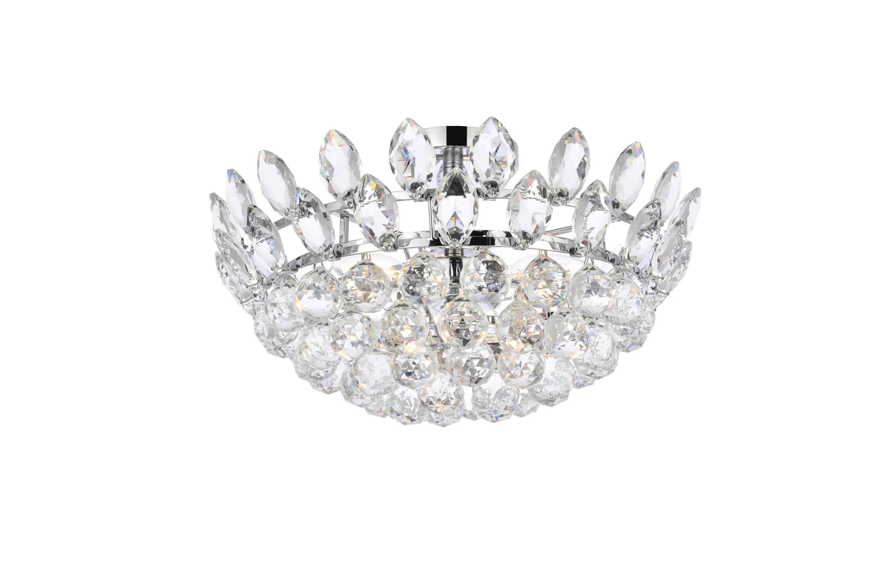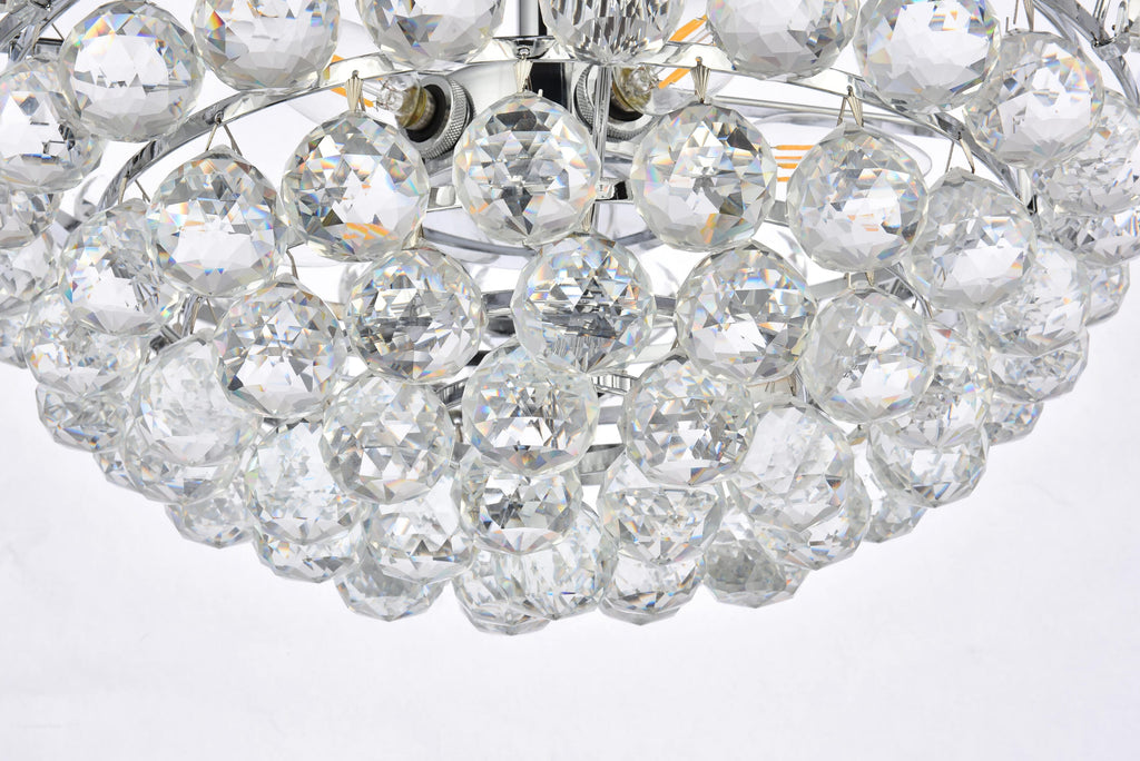 Dimensions Length: 18" Width: 18" Height: 10.5" Wire Length: 20" Specifications Product Type: Flush Mounts Voltage: 120V Dimmable: Yes Socket Type: E12 Number of Lights: 5 Wattage/Bulb: 40W Max/Nominal Watt: 200W Crystal/Glass Color: CLEAR Wire Included: Yes ETL: YES Harware Material: Iron Fixture Material: Iron and Crystal Product Shape: Round Assembly Required: YES Distressed Finish: NO Hardware Finish: chrome Bulb Included: No UL & ULC Standard: No Dry/Wet/Damp: Dry Weight: 16.5 Product Warranty: 1 year limited Shipment type: Small Parcel