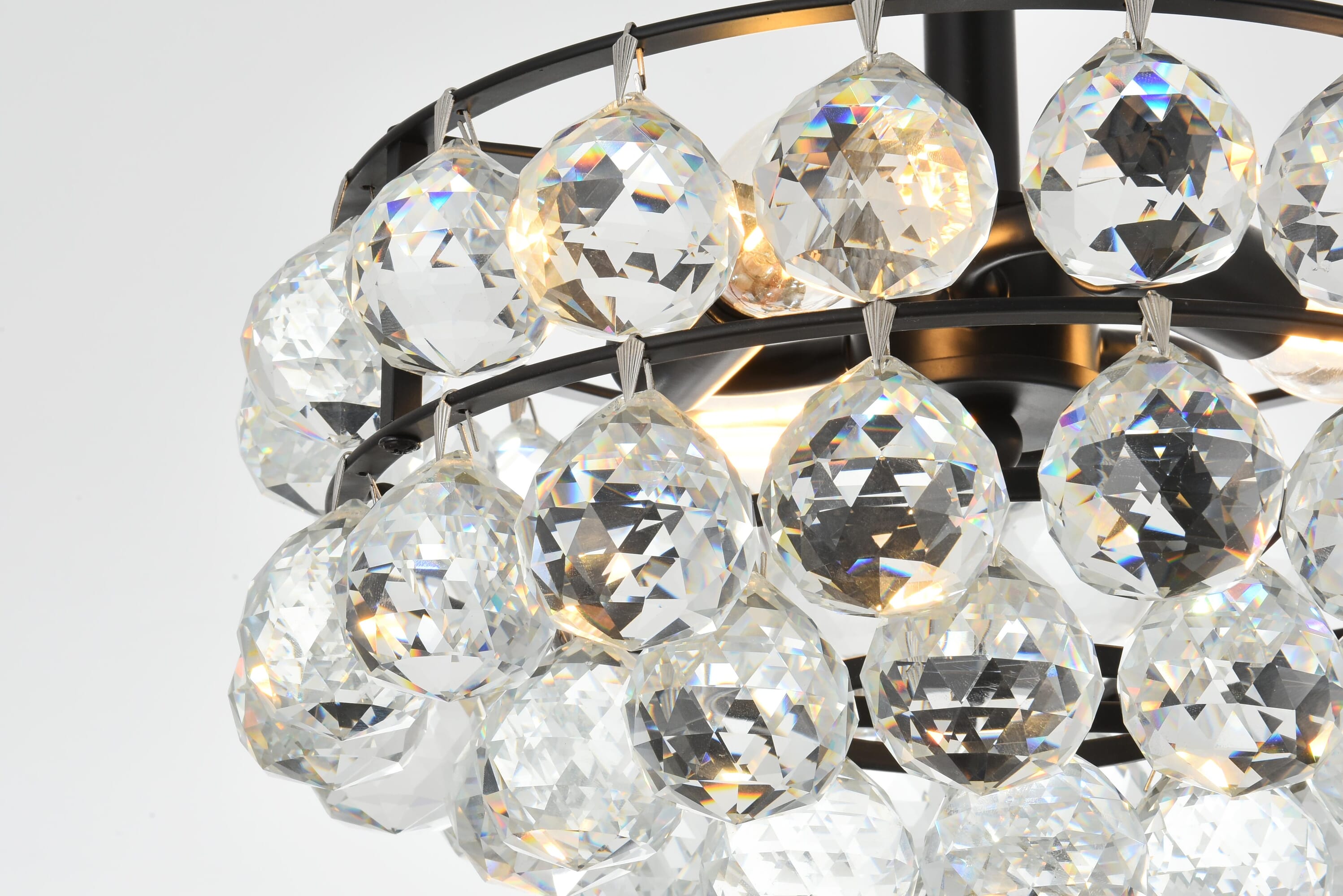Dimensions Length: 12" Width: 12" Height: 10" Wire Length: 20" Specifications Product Type: Flush Mounts Voltage: 120V Dimmable: Yes Socket Type: E12 Number of Lights: 3 Wattage/Bulb: 40W Max/Nominal Watt: 120W Crystal/Glass Color: CLEAR Wire Included: Yes ETL: YES Harware Material: Iron Fixture Material: Iron and Crystal Product Shape: Round Assembly Required: YES Distressed Finish: NO Hardware Finish: black Bulb Included: No UL & ULC Standard: No Dry/Wet/Damp: Dry Weight: 12.5 Product Warranty: 1 year limited Shipment type: Small Parcel