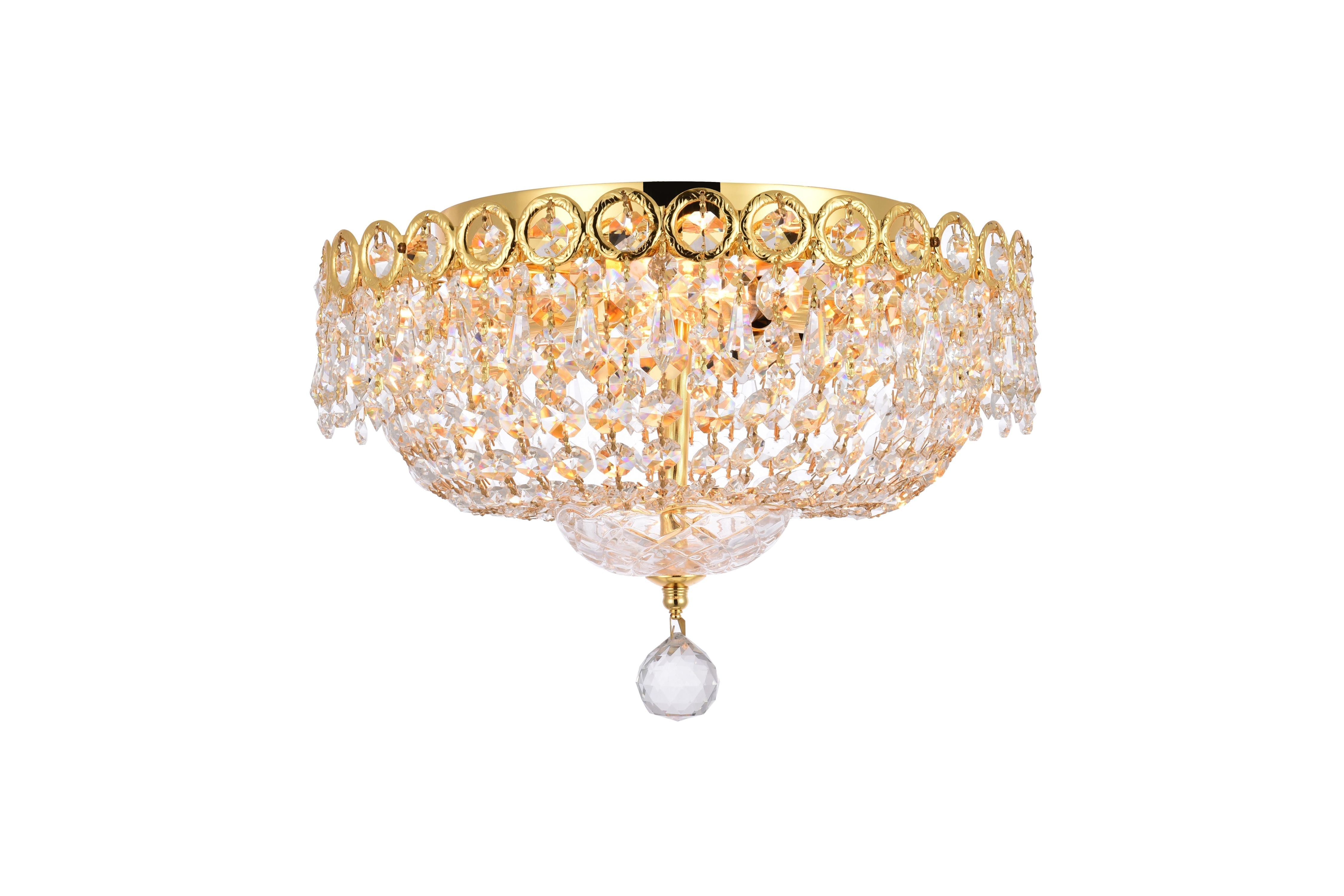 Dimensions Length: 14" Width: 14" Height: 10" Wire Length: 11.81" Specifications Product Type: Flush Mounts Voltage: 110V - 125V Dimmable: Yes Socket Type: E12 Number of Lights: 4 Wattage/Bulb: 40 Max/Nominal Watt: 160 Crystal/Glass Color: clear Wire Included: Yes Bulb Shape: B10 Harware Material: Steel Fixture Material: Steel Product Shape: Flush Mounts Assembly Required: YES Hardware Finish: Gold Bulb Included: No UL & ULC Standard: UL,ULC Weight: 12 Product Warranty: 1 year limited Shipment type: Small Parcel