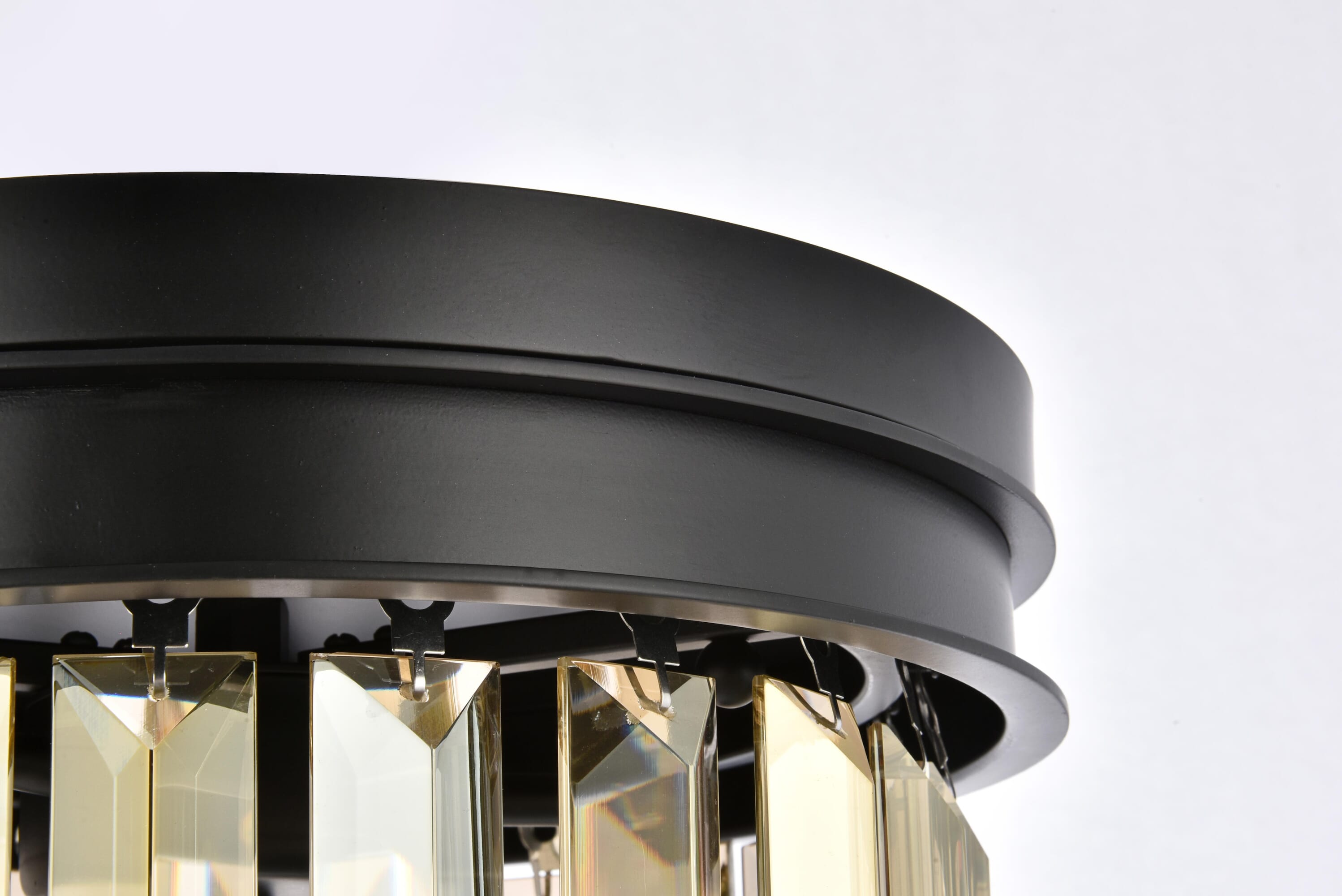 Dimensions Length: 12" Width: 12" Height: 13" Wire Length: 10" Specifications Product Type: Flush Mounts Voltage: 110V - 125V Dimmable: Yes Socket Type: E12 Number of Lights: 3 Wattage/Bulb: 60 Max/Nominal Watt: 180 Crystal/Glass Color: Golden Teak (Smoky) Wire Included: Yes Bulb Shape: B10 Harware Material: Steel Fixture Material: Steel Product Shape: Flush Mounts Assembly Required: Yes Hardware Finish: Matte Black Bulb Included: No UL & ULC Standard: UL,ULC Weight: 15.3 Product Warranty: 1 year limited Shipment type: Small Parcel