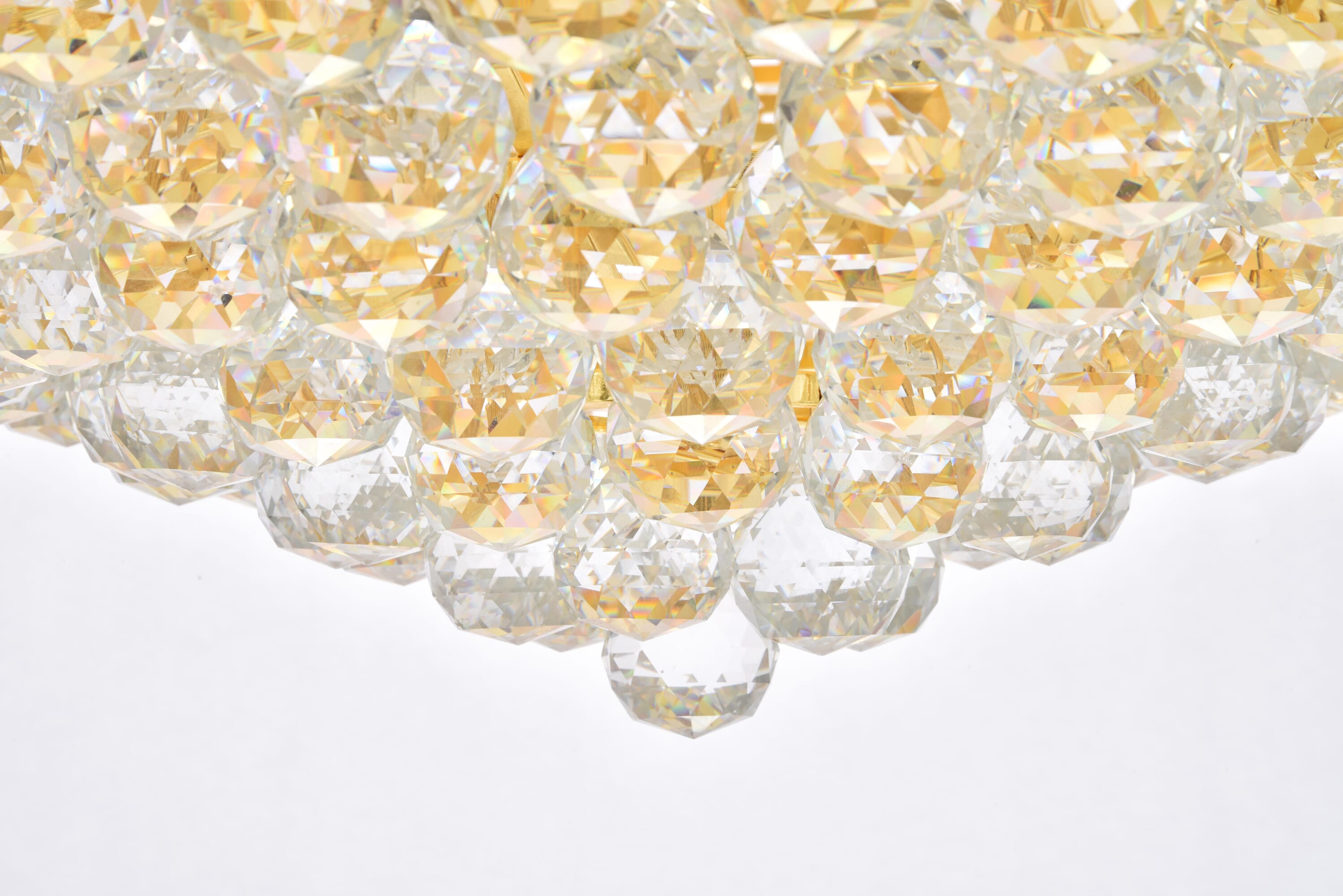 Dimensions Length: 42" Width: 42" Height: 14.5" Wire Length: 19.68" Specifications Product Type: Flush Mounts Voltage: 110V - 125V Dimmable: Yes Socket Type: E12 Number of Lights: 30 Wattage/Bulb: 40 Max/Nominal Watt: 1200 Crystal/Glass Color: clear Wire Included: Yes Bulb Shape: B10 Harware Material: Steel Fixture Material: Steel Product Shape: Flush Mounts Assembly Required: YES Hardware Finish: Gold Bulb Included: No UL & ULC Standard: UL,ULC Weight: 161 Product Warranty: 1 year limited Shipment type: LTL