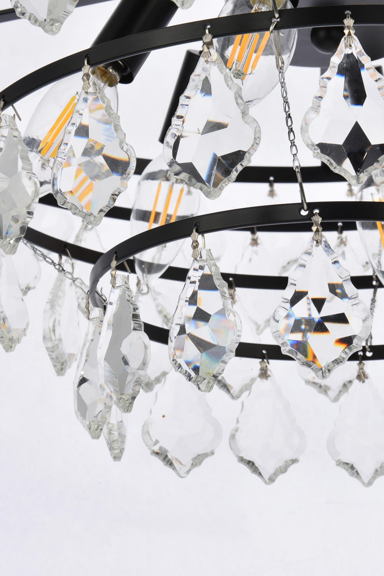 Dimensions Chain/Rod Length: 46" Length: 24" Width: 24" Height: 10" Maximum Height: 58" Wire Length: 75" Specifications Product Type: Pendants Hanging Device: Rod Voltage: 120V Dimmable: Yes Socket Type: E12 Number of Lights: 6 Wattage/Bulb: 40W Max/Nominal Watt: 240W Crystal/Glass Color: CLEAR Wire Included: Yes ETL: YES Harware Material: Iron Fixture Material: Iron and Crystal Product Shape: Round Assembly Required: YES Distressed Finish: NO Hardware Finish: black Bulb Included: No UL & ULC Standard: No Dry/Wet/Damp: Dry Weight: 11.7 Product Warranty: 1 year limited Shipment type: Small Parcel