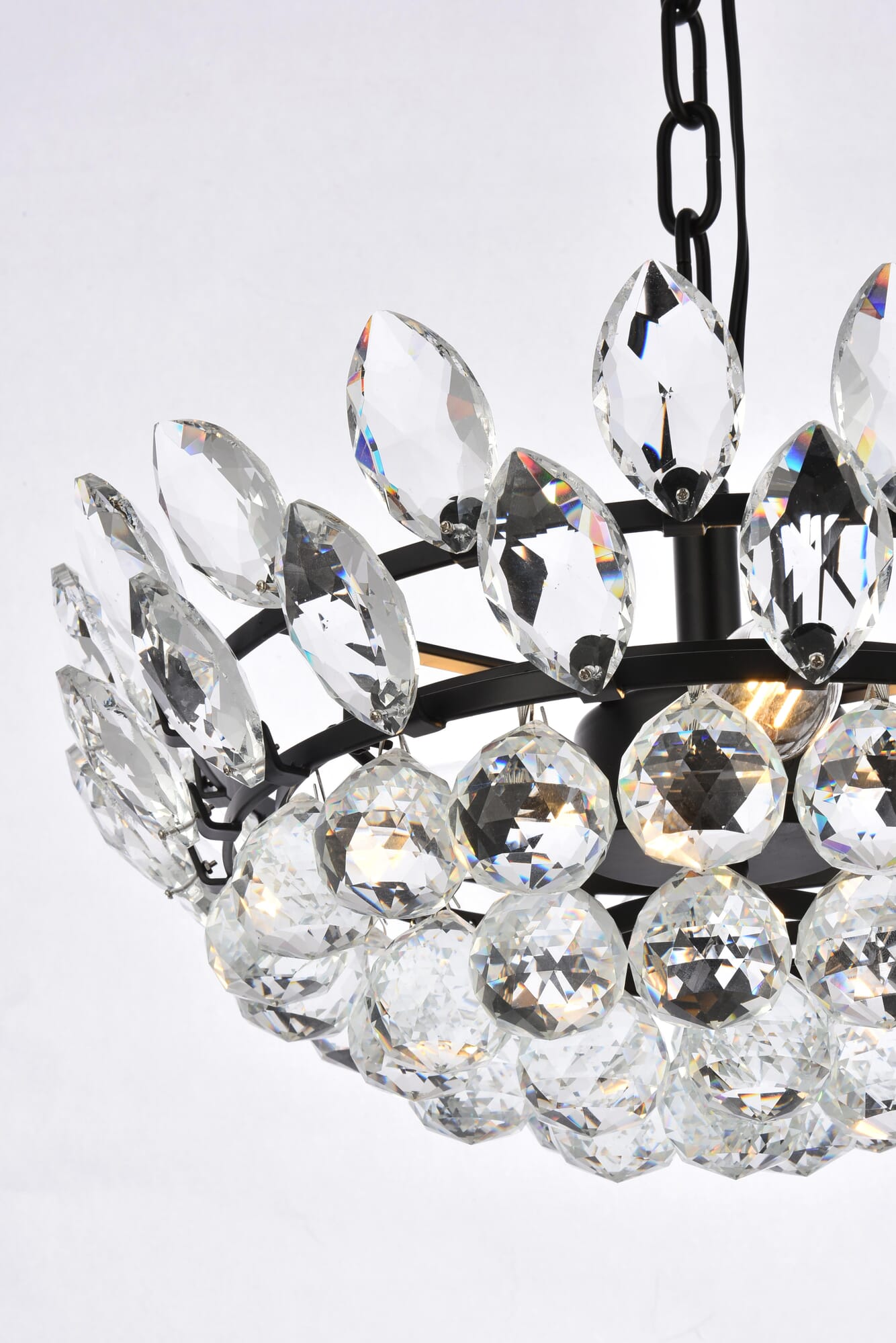 Dimensions Chain/Rod Length: 59" Length: 16" Width: 16" Height: 7" Maximum Height: 69" Wire Length: 79" Specifications Product Type: Pendants Hanging Device: Chain Voltage: 120V Dimmable: Yes Socket Type: E12 Number of Lights: 3 Wattage/Bulb: 40W Max/Nominal Watt: 120W Crystal/Glass Color: CLEAR Wire Included: Yes ETL: YES Harware Material: Iron Fixture Material: Iron and Crystal Product Shape: Round Assembly Required: YES Distressed Finish: NO Hardware Finish: black Bulb Included: No UL & ULC Standard: No Dry/Wet/Damp: Dry Weight: 14.5 Product Warranty: 1 year limited Shipment type: Small Parcel