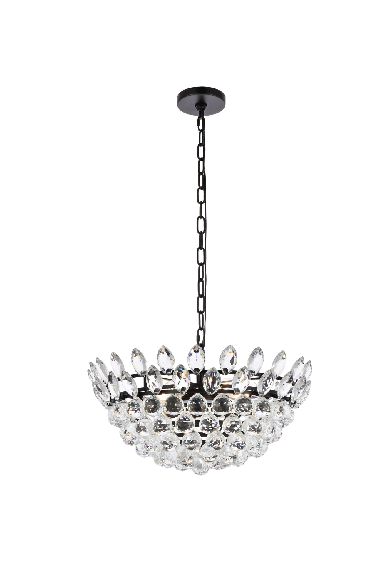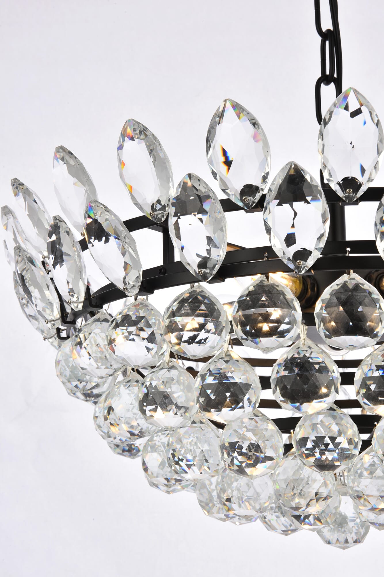 Dimensions Chain/Rod Length: 59" Length: 20" Width: 20" Height: 9.5" Maximum Height: 71" Wire Length: 79" Specifications Product Type: Pendants Hanging Device: Chain Voltage: 120V Dimmable: Yes Socket Type: E12 Number of Lights: 5 Wattage/Bulb: 40W Max/Nominal Watt: 200W Crystal/Glass Color: CLEAR Wire Included: Yes ETL: YES Harware Material: Iron Fixture Material: Iron and Crystal Product Shape: Round Assembly Required: YES Distressed Finish: NO Hardware Finish: black Bulb Included: No UL & ULC Standard: No Dry/Wet/Damp: Dry Weight: 24.5 Product Warranty: 1 year limited Shipment type: Small Parcel