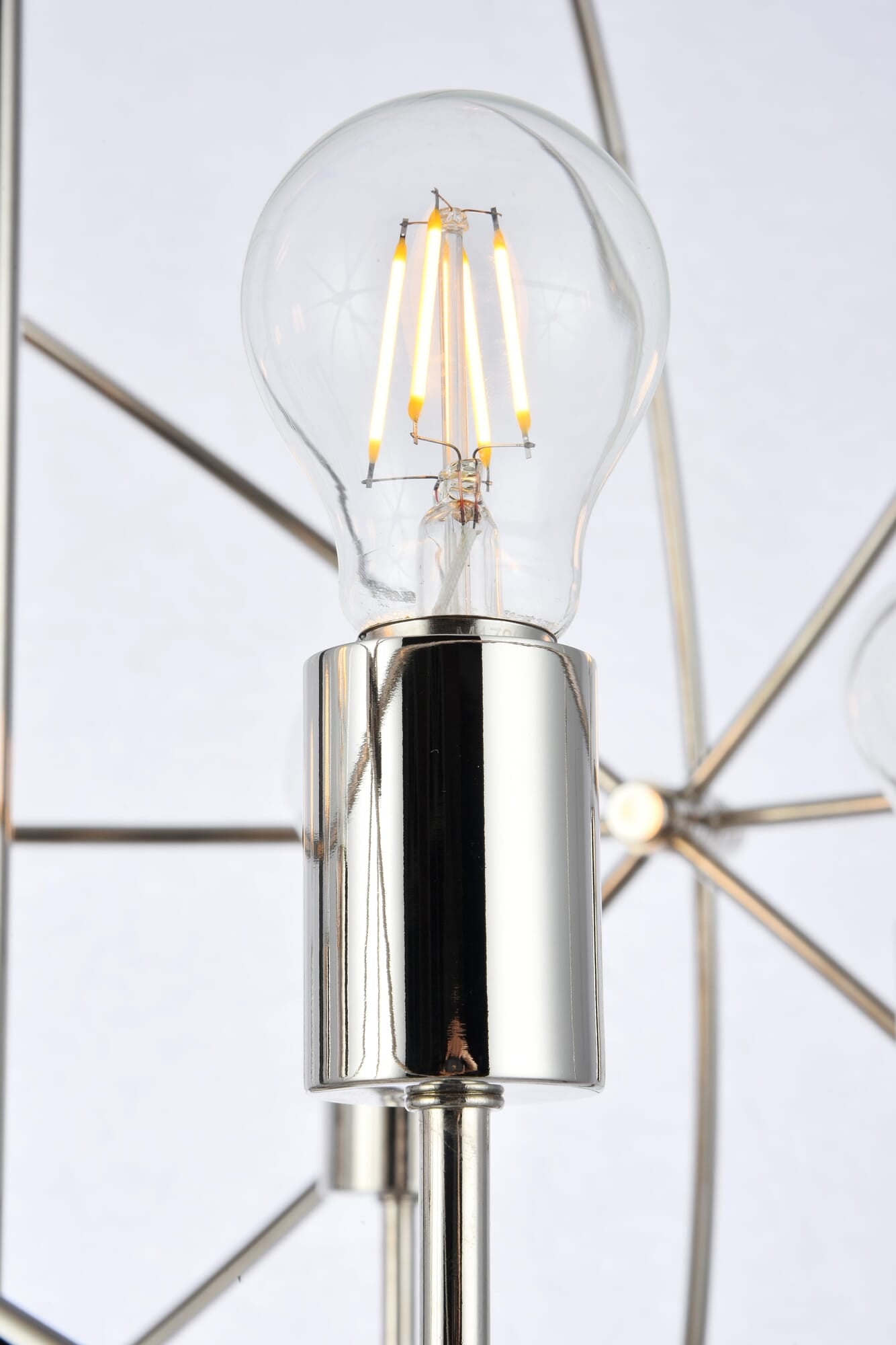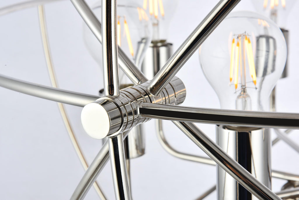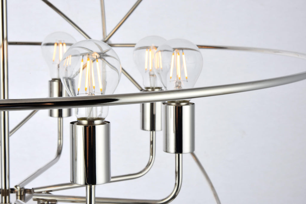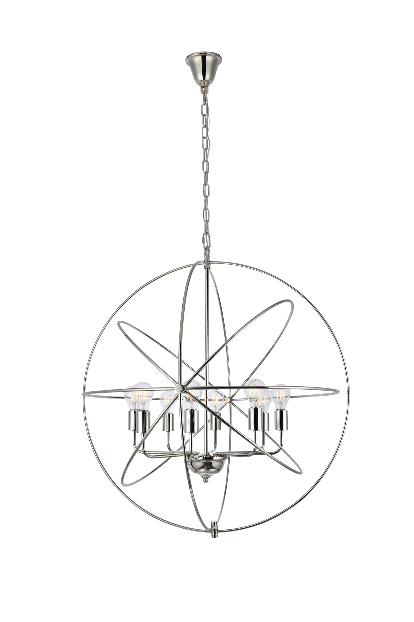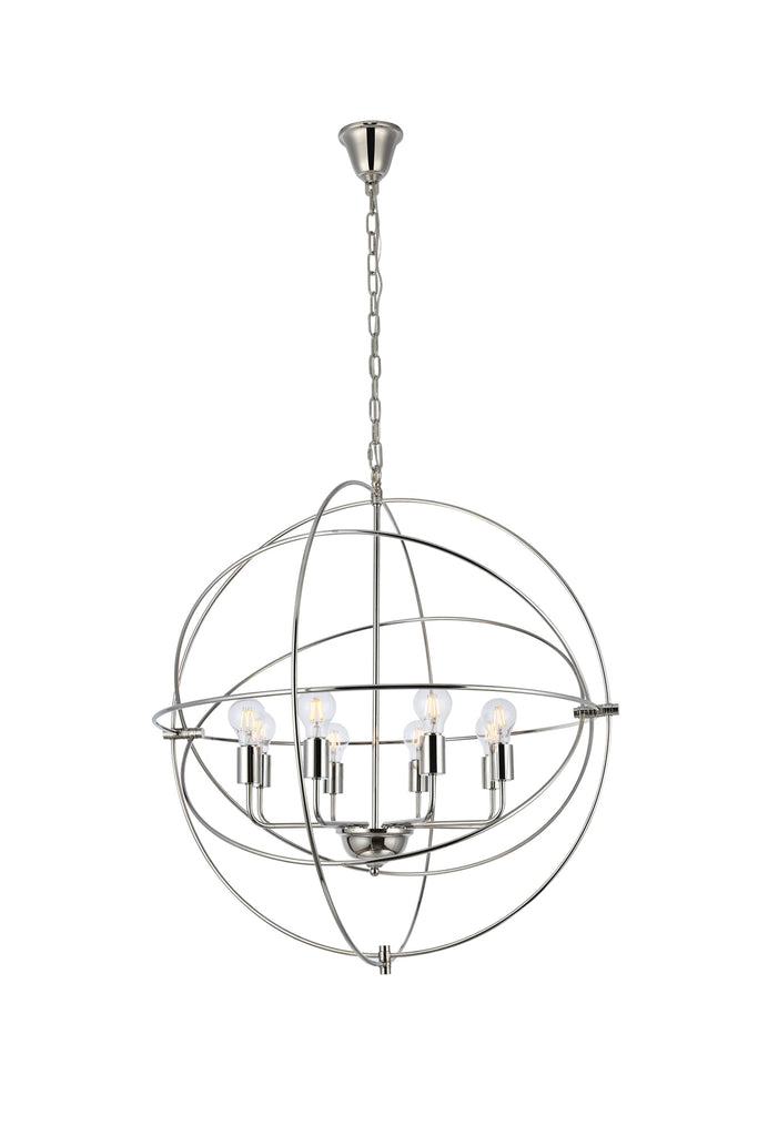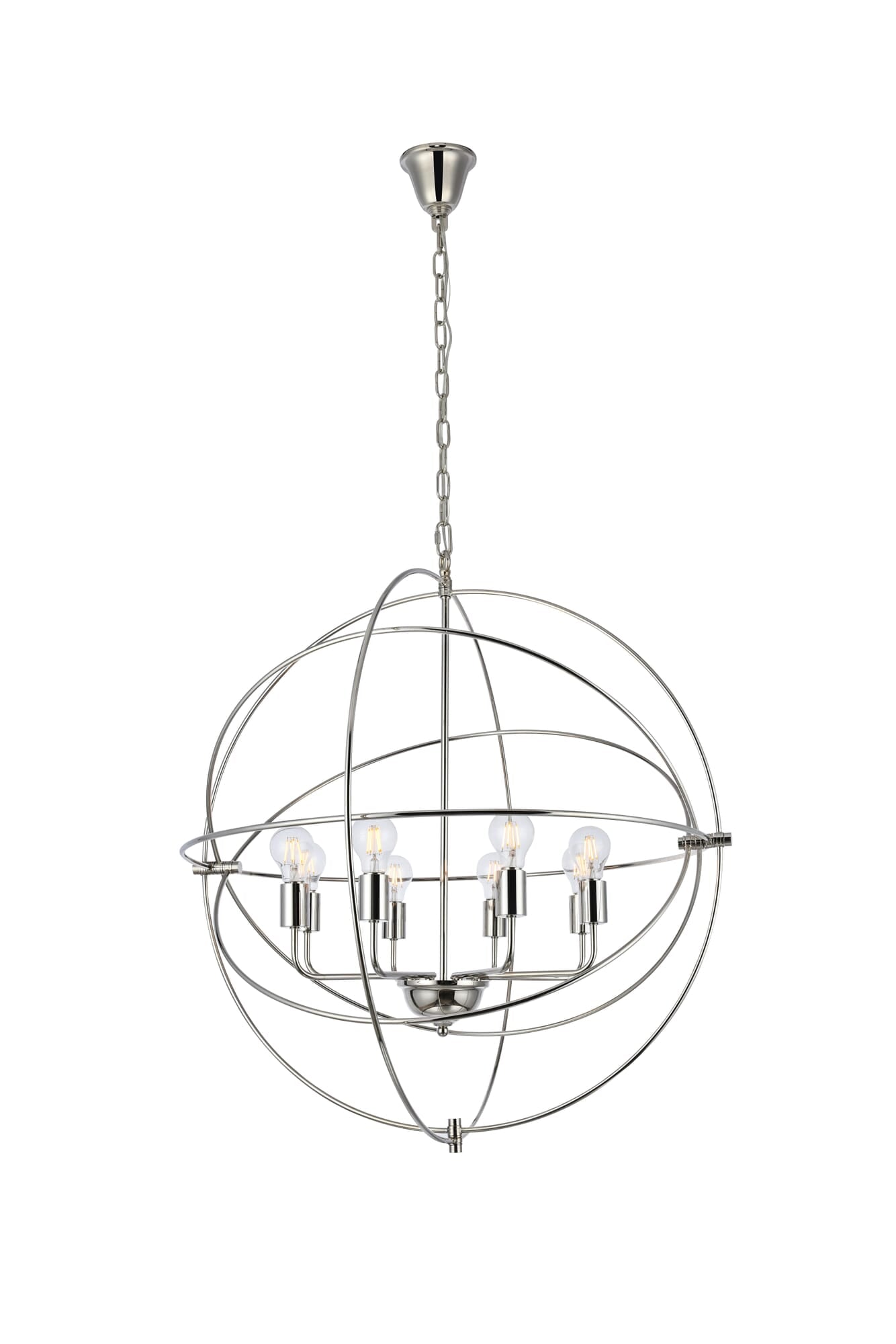 Dimensions Chain/Rod Length: 60" Length: 32" Width: 32" Height: 33" Maximum Height: 93" Wire Length: 72" Specifications Product Type: Pendants Hanging Device: Chain Voltage: 110V - 125V Dimmable: Yes Socket Type: E26 Number of Lights: 8 Wattage/Bulb: 60 Max/Nominal Watt: 480 Wire Included: Yes Harware Material: Steel Fixture Material: Metal Product Shape: Pendants Assembly Required: NO Hardware Finish: Polished Nickel Bulb Included: No UL & ULC Standard: UL,ULC Weight: 16 Product Warranty: 1 year limited Shipment type: Small Parcel