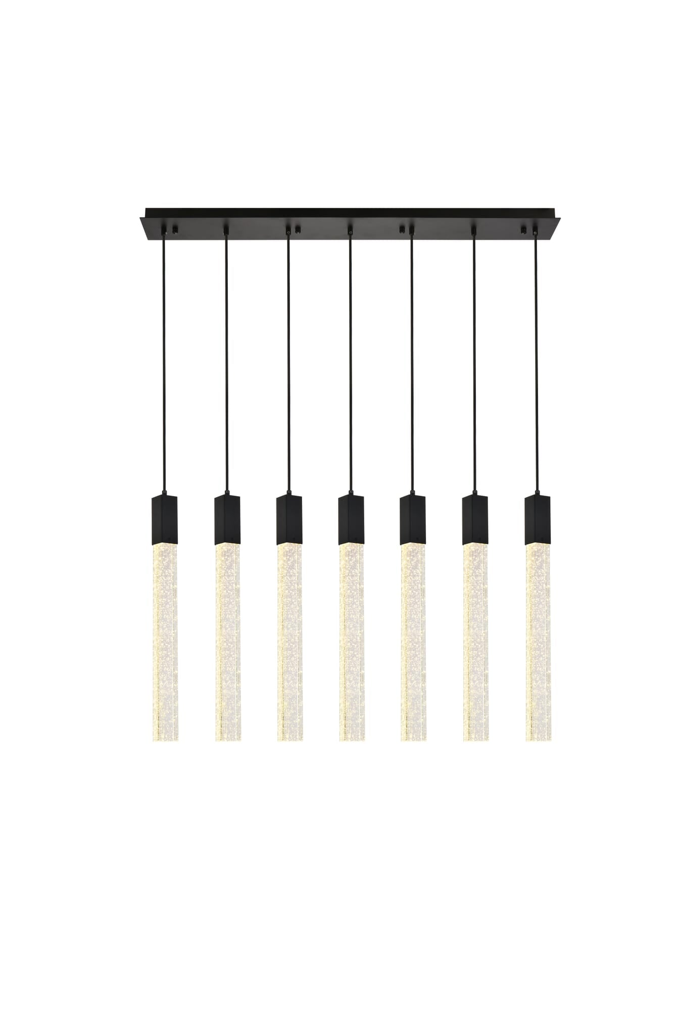 Dimensions Chain/Rod Length: 144" Length: 42" Width: 6" Height: 24" Maximum Height: 144" Wire Length: 144" Specifications Product Type: Pendants Hanging Device: Cord Voltage: 110V - 125V Dimmable: No Socket Type: GU10 Number of Lights: 7 Wattage/Bulb: 3W Max/Nominal Watt: 21W Crystal/Glass Color: Clear Wire Included: Yes ETL: YES Harware Material: Metal Fixture Material: Metal and Crystal Product Shape: Pendants Assembly Required: YES Hardware Finish: Black Bulb Included: Yes Dry/Wet/Damp: Dry Weight: 56.5 Product Warranty: 1 year limited Shipment type: Small Parcel