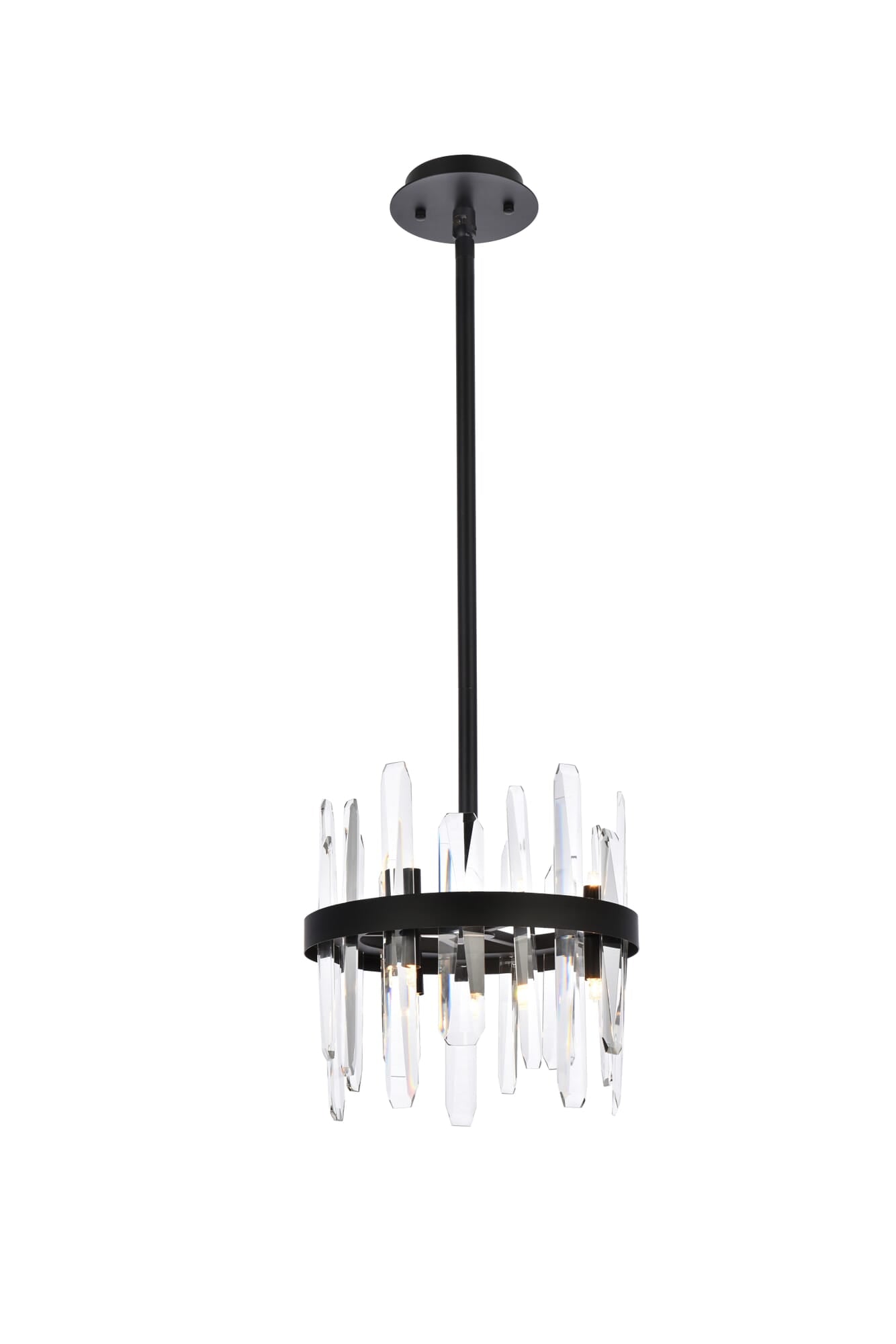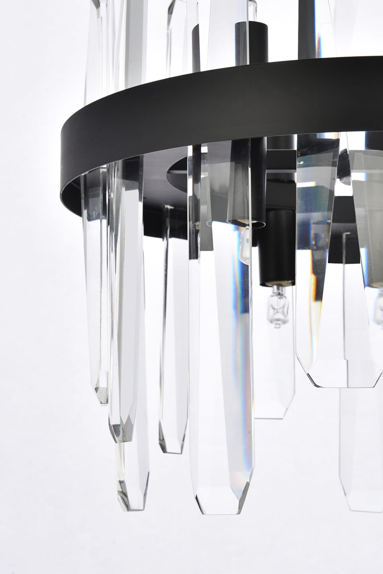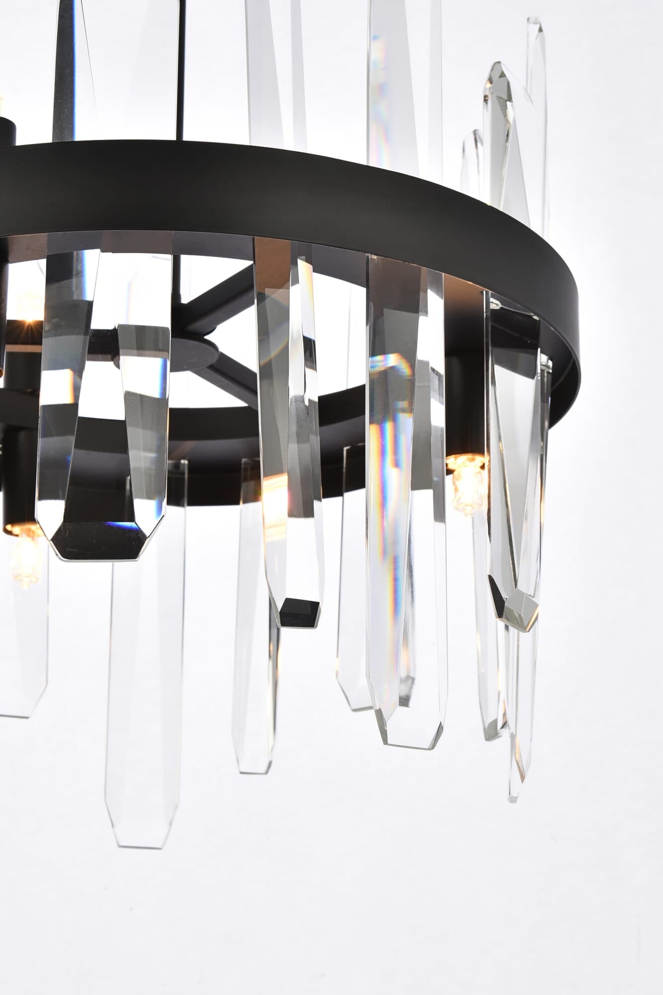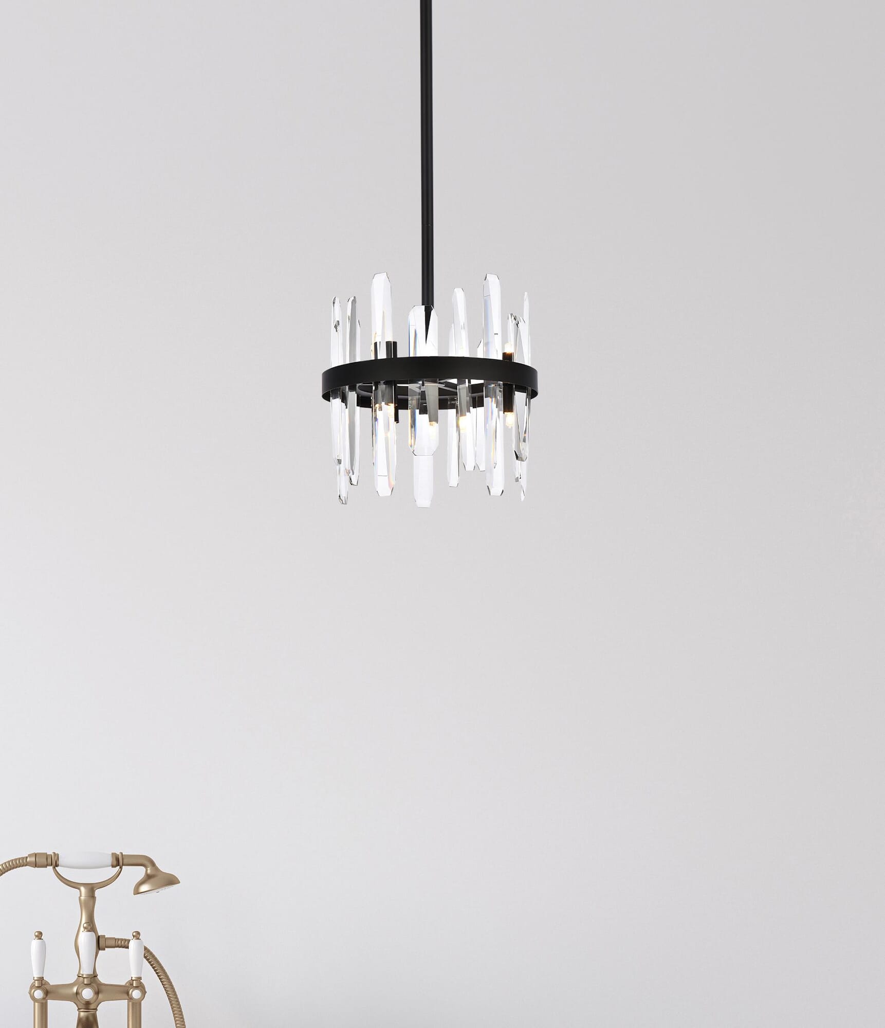 Dimensions Chain/Rod Length: 46" Length: 12" Width: 12" Height: 12" Maximum Height: 57.5" Wire Length: 75" Specifications Product Type: Pendants Hanging Device: Rod Voltage: 110V - 125V Dimmable: Yes Socket Type: G9 Number of Lights: 6 Wattage/Bulb: 20W Max/Nominal Watt: 120W Crystal/Glass Color: Clear Wire Included: Yes ETL: Yes Harware Material: Iron Fixture Material: Iron and Crystal Product Shape: Round Assembly Required: Yes Distressed Finish: No Hardware Finish: Black Bulb Included: No Dry/Wet/Damp: Dry Weight: 9.6 Product Warranty: 1 year limited Shipment type: small parcel