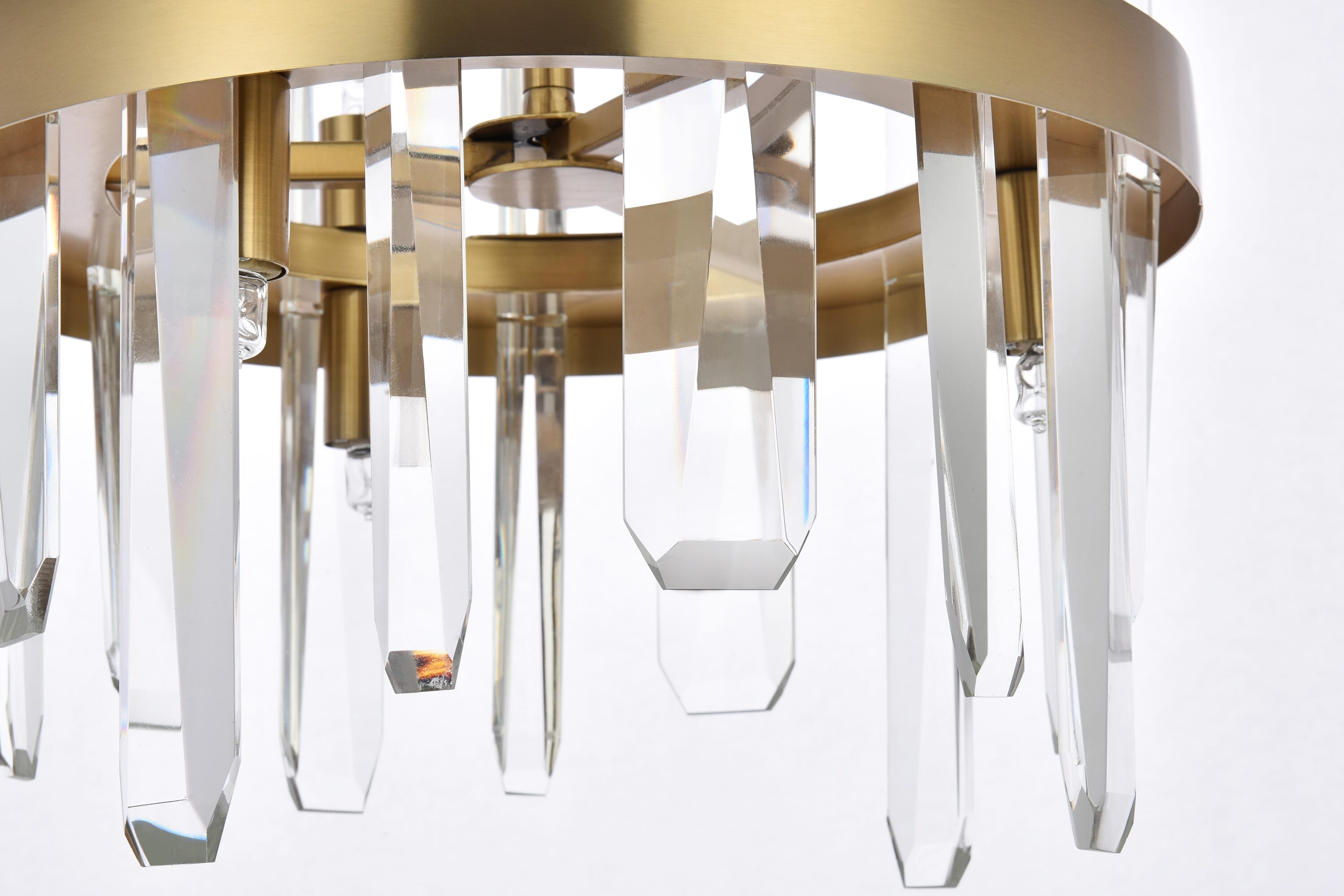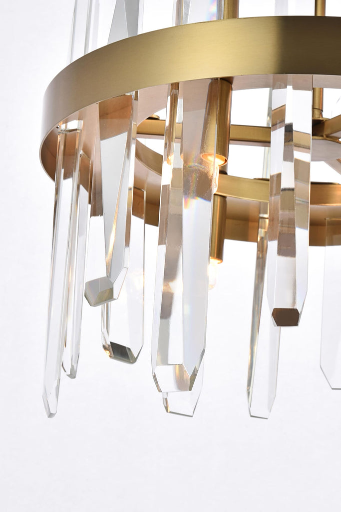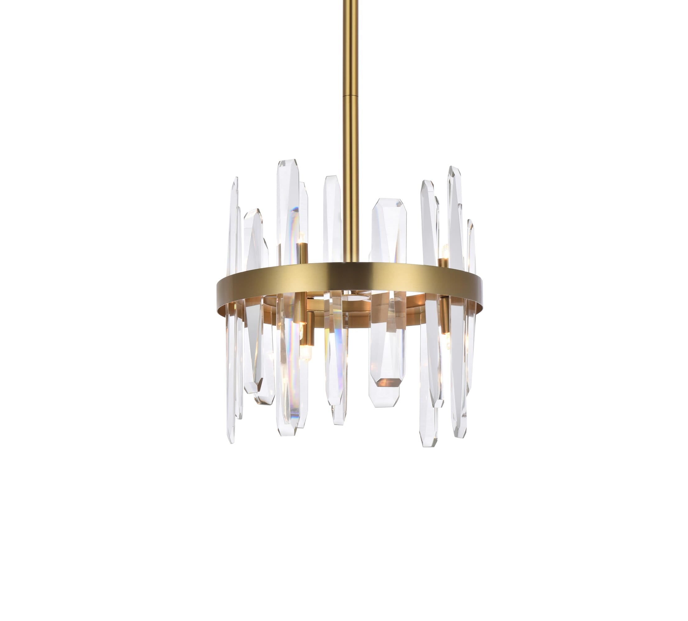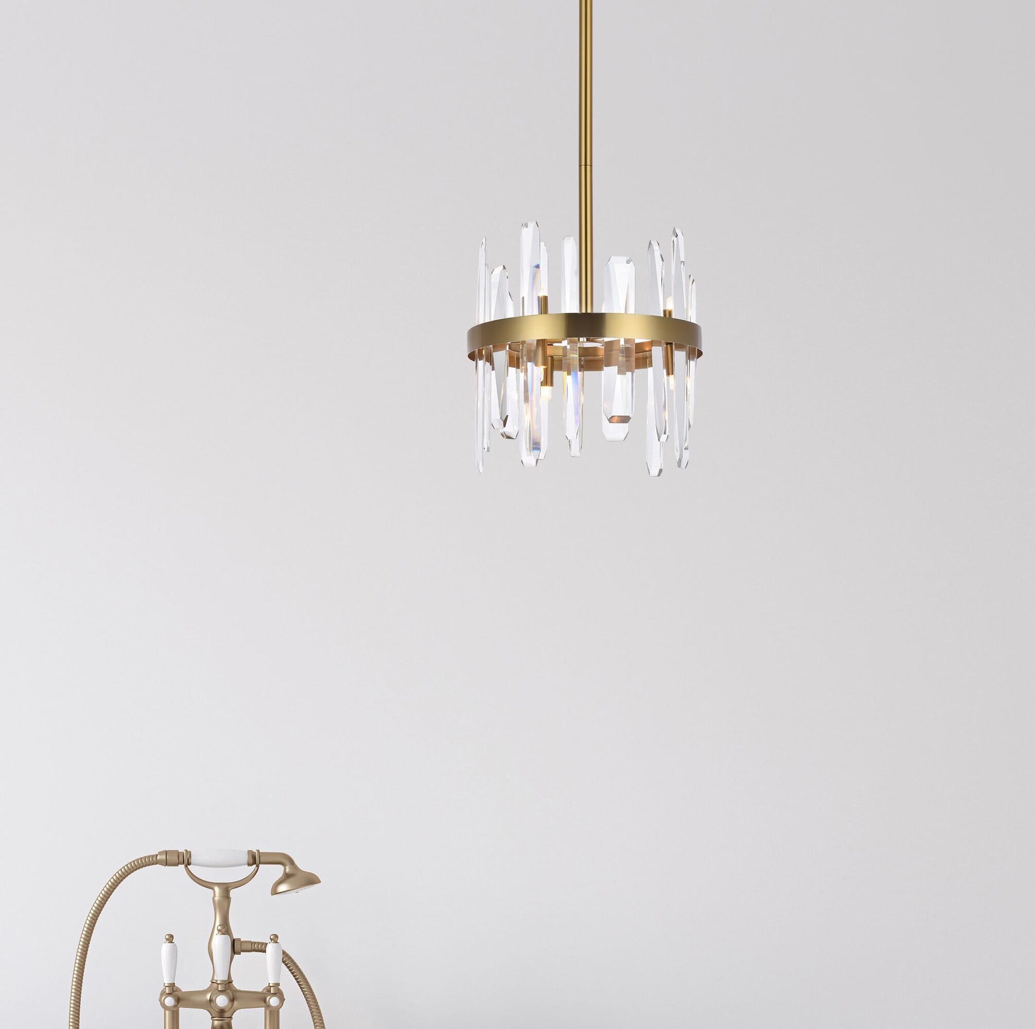 Dimensions Chain/Rod Length: 46" Length: 12" Width: 12" Height: 12" Maximum Height: 57.5" Wire Length: 75" Specifications Product Type: Pendants Hanging Device: Rod Voltage: 110V - 125V Dimmable: Yes Socket Type: G9 Number of Lights: 6 Wattage/Bulb: 20W Max/Nominal Watt: 120W Crystal/Glass Color: Clear Wire Included: Yes ETL: Yes Harware Material: Iron Fixture Material: Iron and Crystal Product Shape: Round Assembly Required: Yes Distressed Finish: No Hardware Finish: Satin Gold Bulb Included: No Dry/Wet/Damp: Dry Weight: 9.6 Product Warranty: 1 year limited Shipment type: small parcel